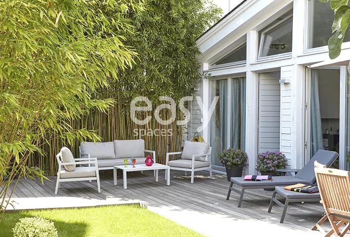 Cette villa contemporaine bénéficie d'un espace séjour très spacieux de 140m2 à la décoration moderne et épurée, d'un grand jardin boisé et plat et d'une belle terrasse de 100m2; Ses beaux espaces exterieurs en font un lieu idéal pour un shooting de mobilier de jardin.