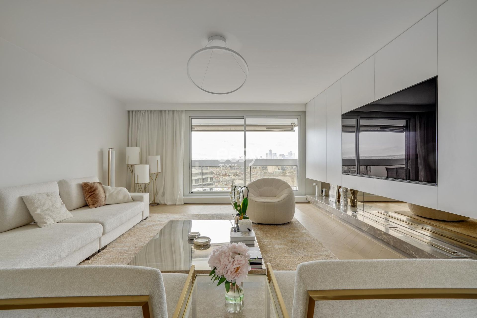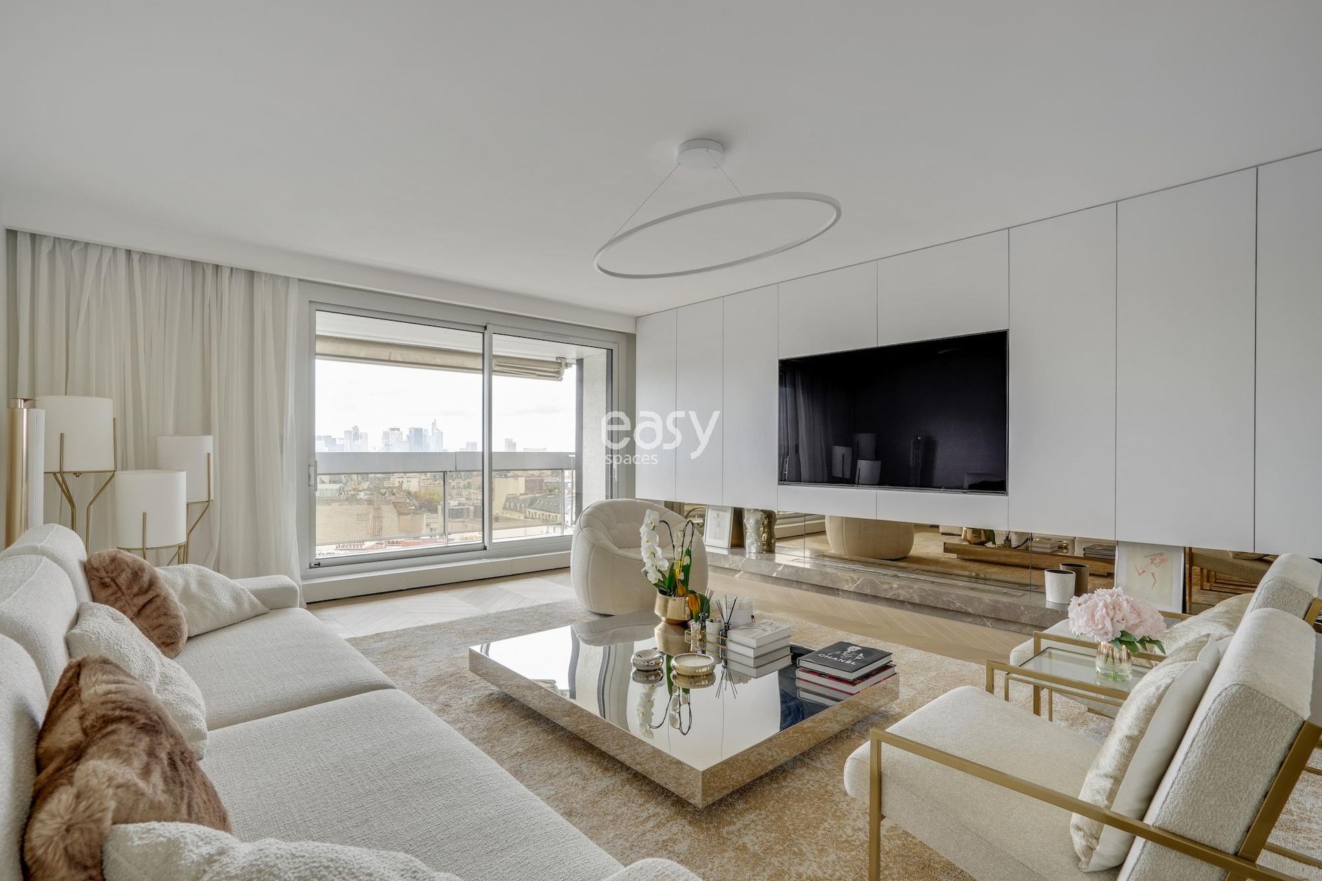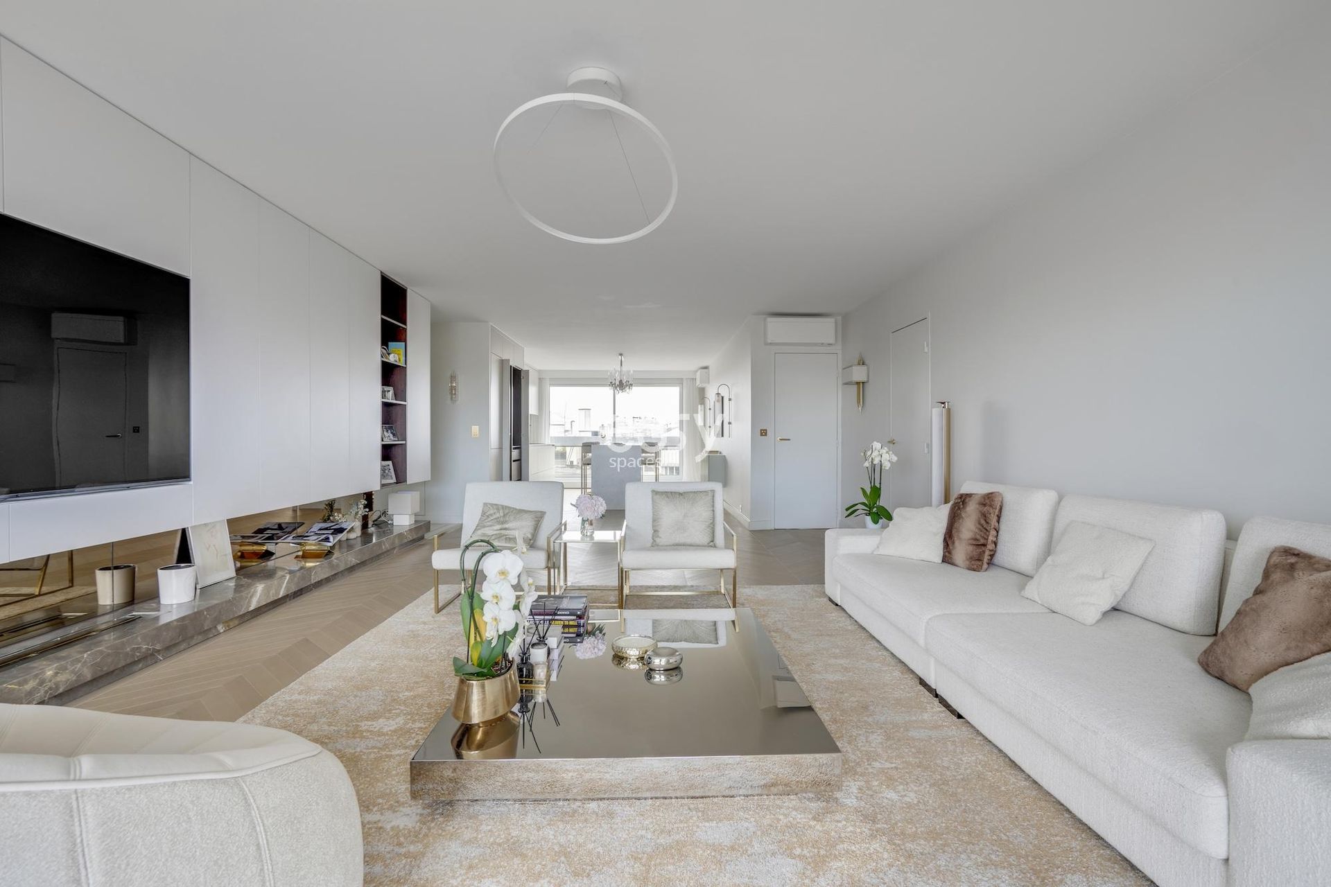 Cet appartement aux lignes épurées, baigné d'une luminosité remarquable grâce à ses larges baies vitrées, offre une toile de fond immaculée pour vos créations les plus ambitieuses. Sa palette chromatique d'un blanc immaculé rehaussé de touches dorées crée un univers visuel d'une rare élégance, idéal pour un shooting et tournage Paris de haute facture.