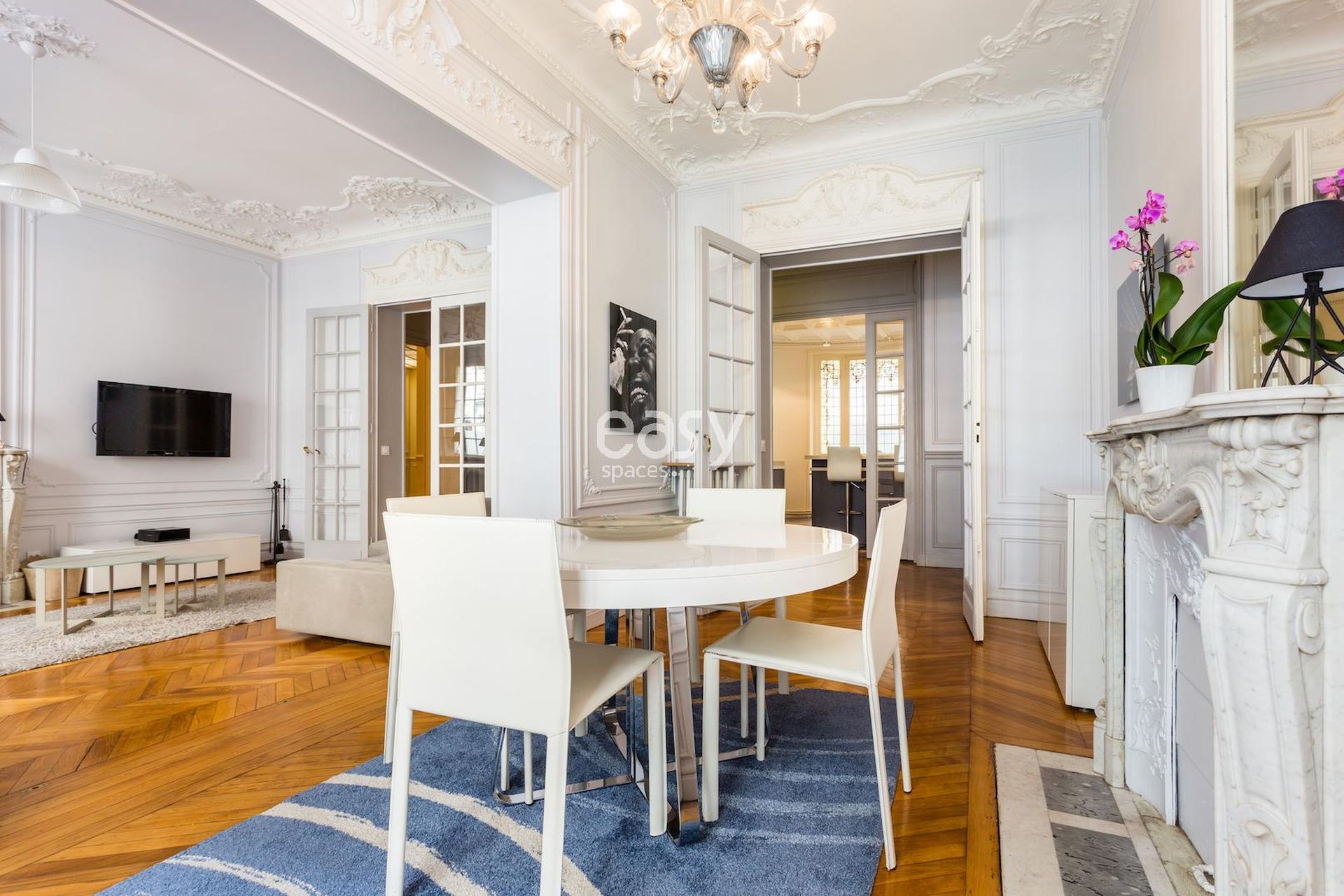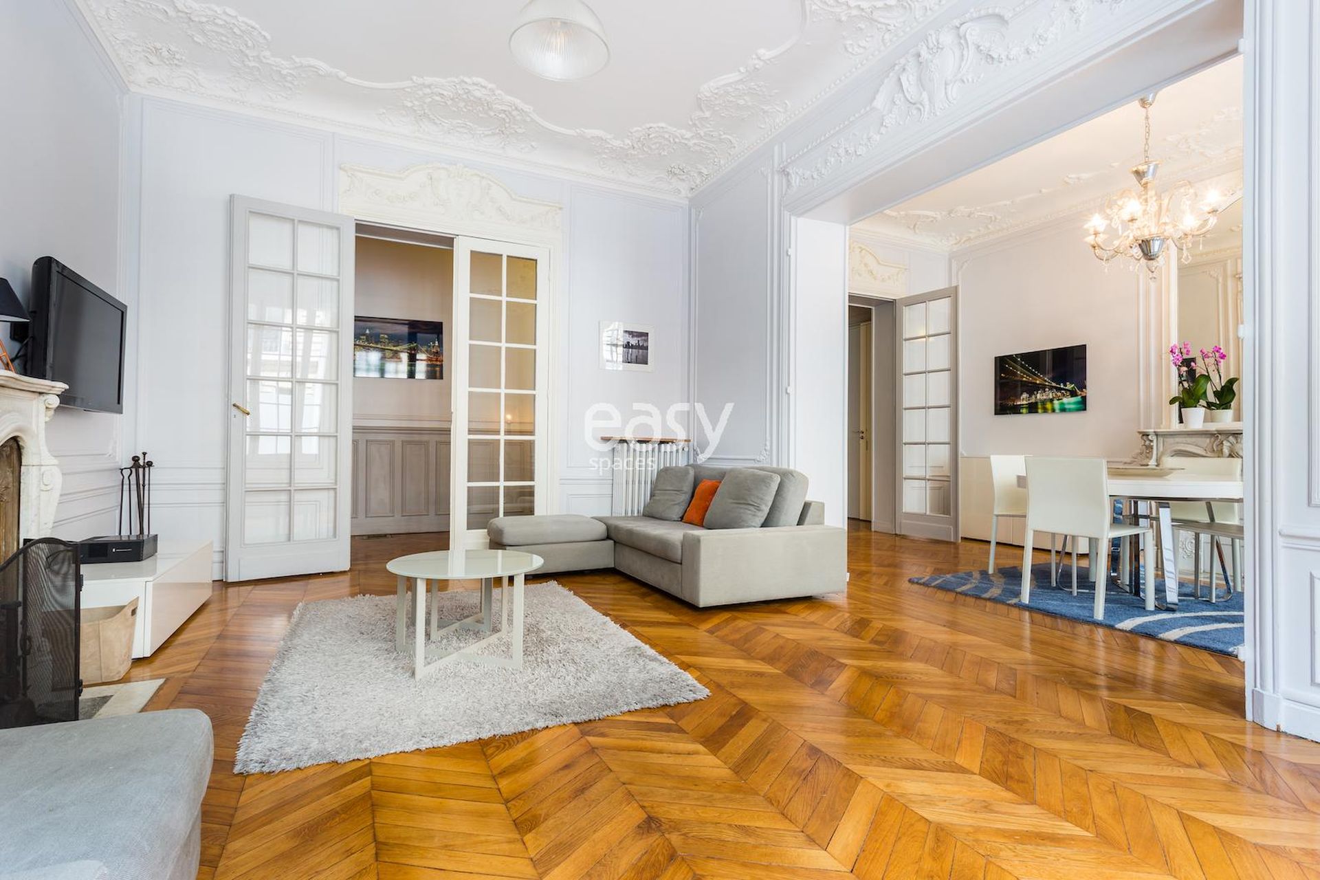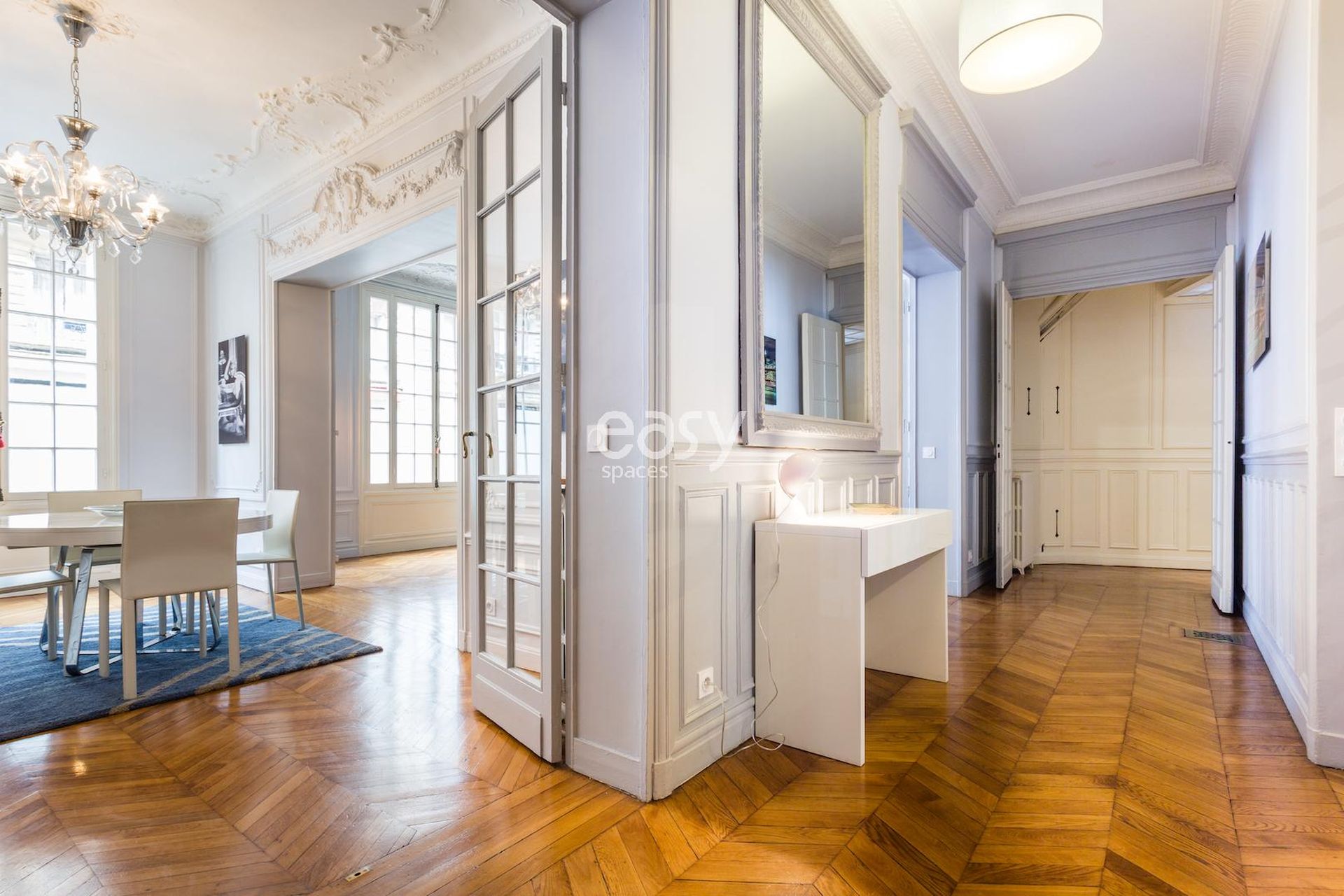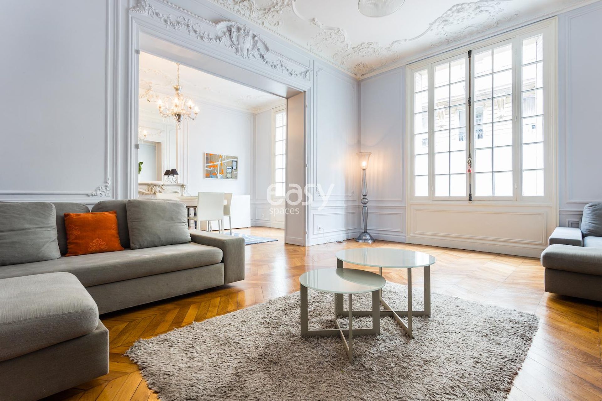 Cet appartement haussmanien avec parquet et moulures possède un bel espace séjour, ainsi qu'une cuisine américaine ouverte en enfilade. Très lumineux, c'est un décor idéal pour un tournage de spot publicitaire, court ou long métrage ou pour tout types de prises de vues dans le centre de Paris; que ce soit pour du mobilier, un shooting de joaillerie ou de pour la lingerie par exemple.