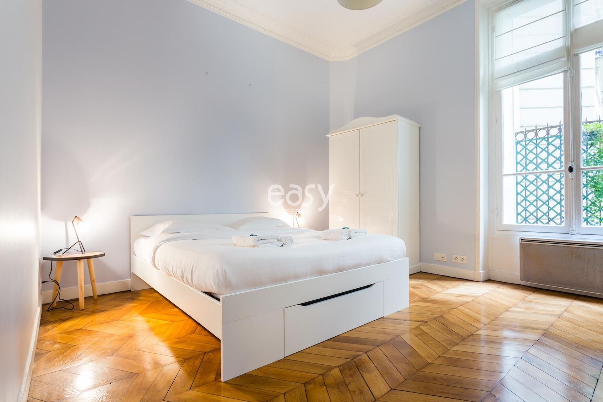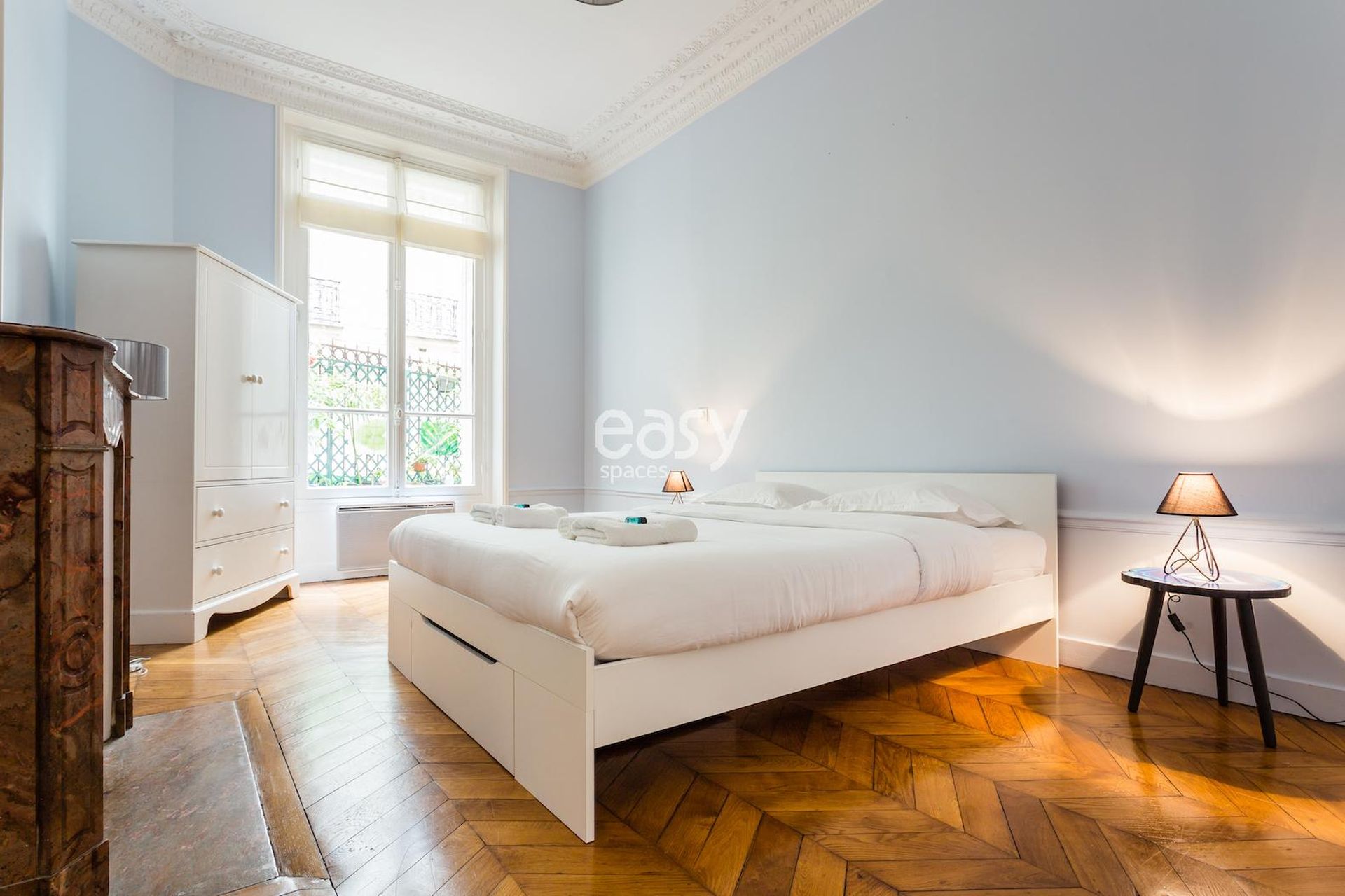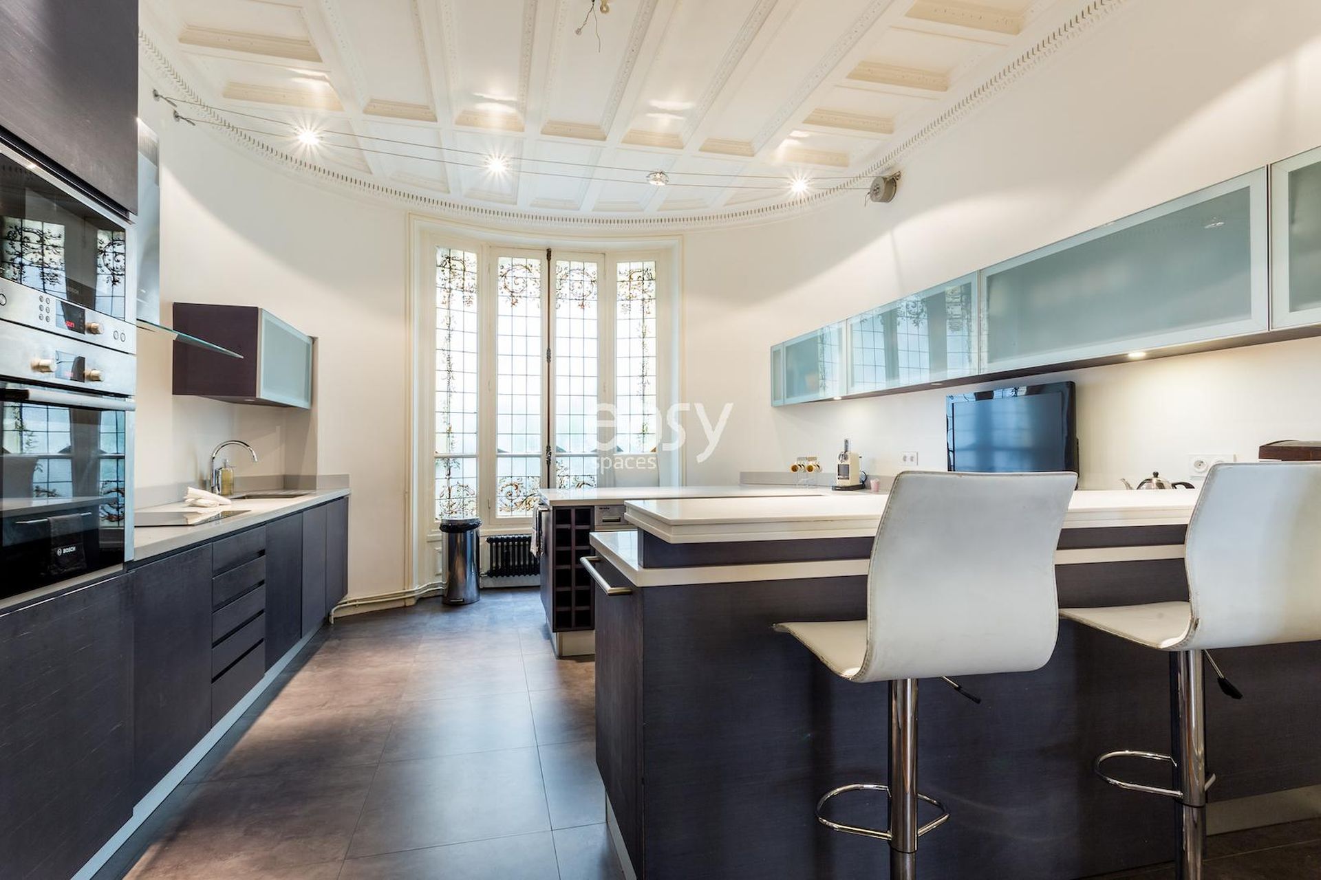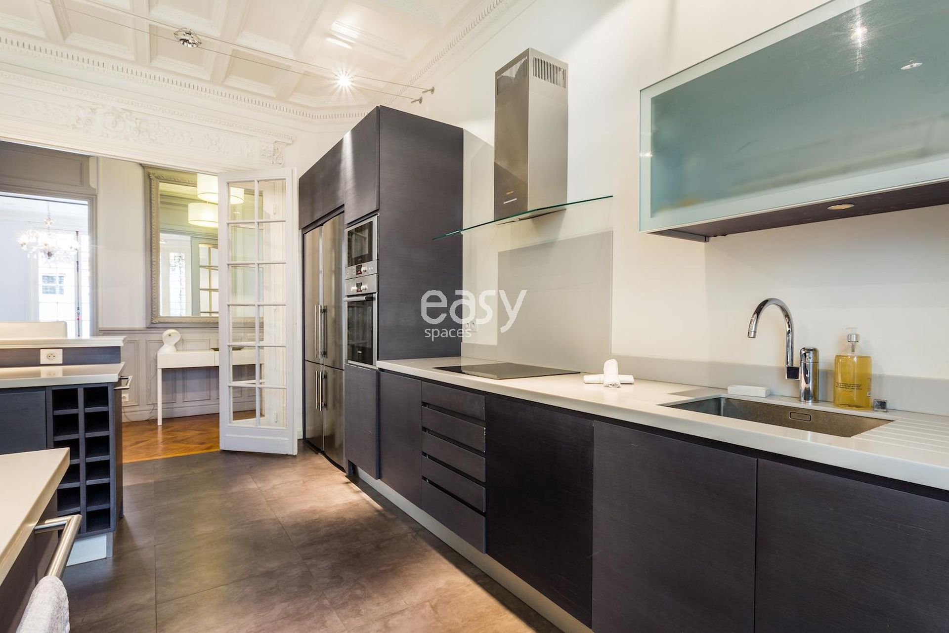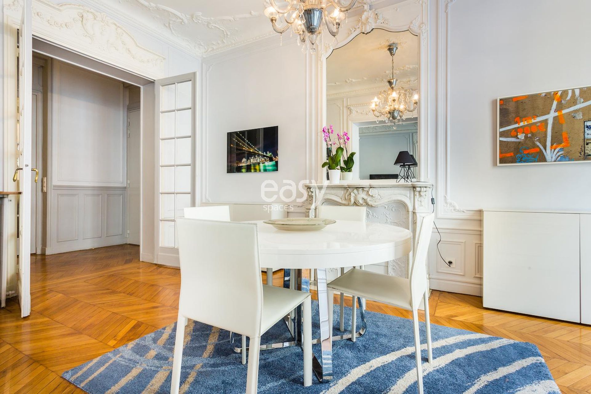 Cet appartement haussmanien avec parquet et moulures possède un bel espace séjour, ainsi qu'une cuisine américaine ouverte en enfilade. Très lumineux, c'est un décor idéal pour un tournage de spot publicitaire, court ou long métrage ou pour tout types de prises de vues dans le centre de Paris; que ce soit pour du mobilier, un shooting de joaillerie ou de pour la lingerie par exemple.
