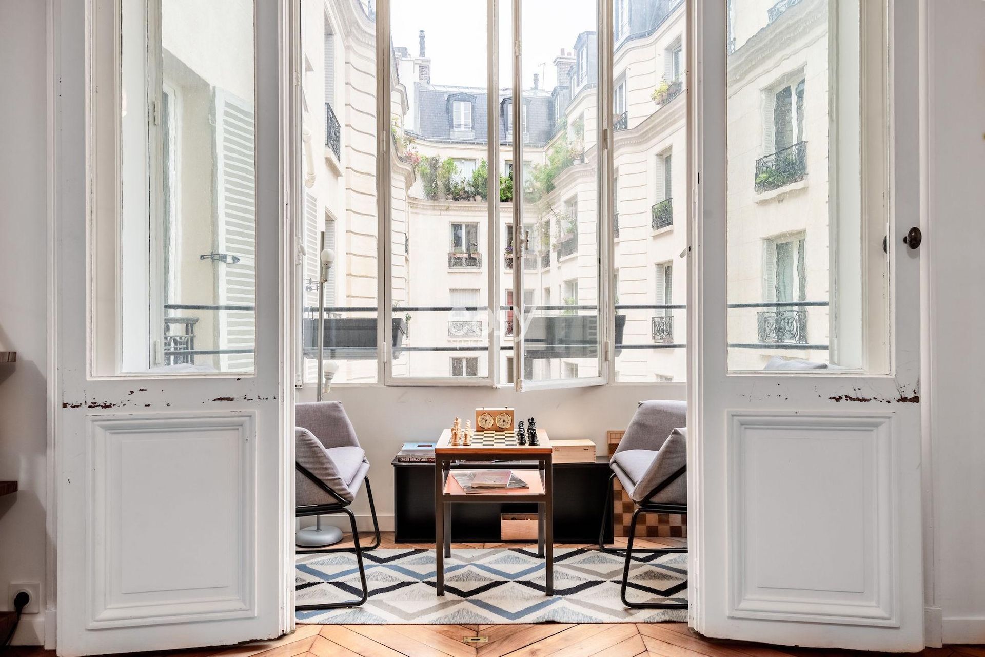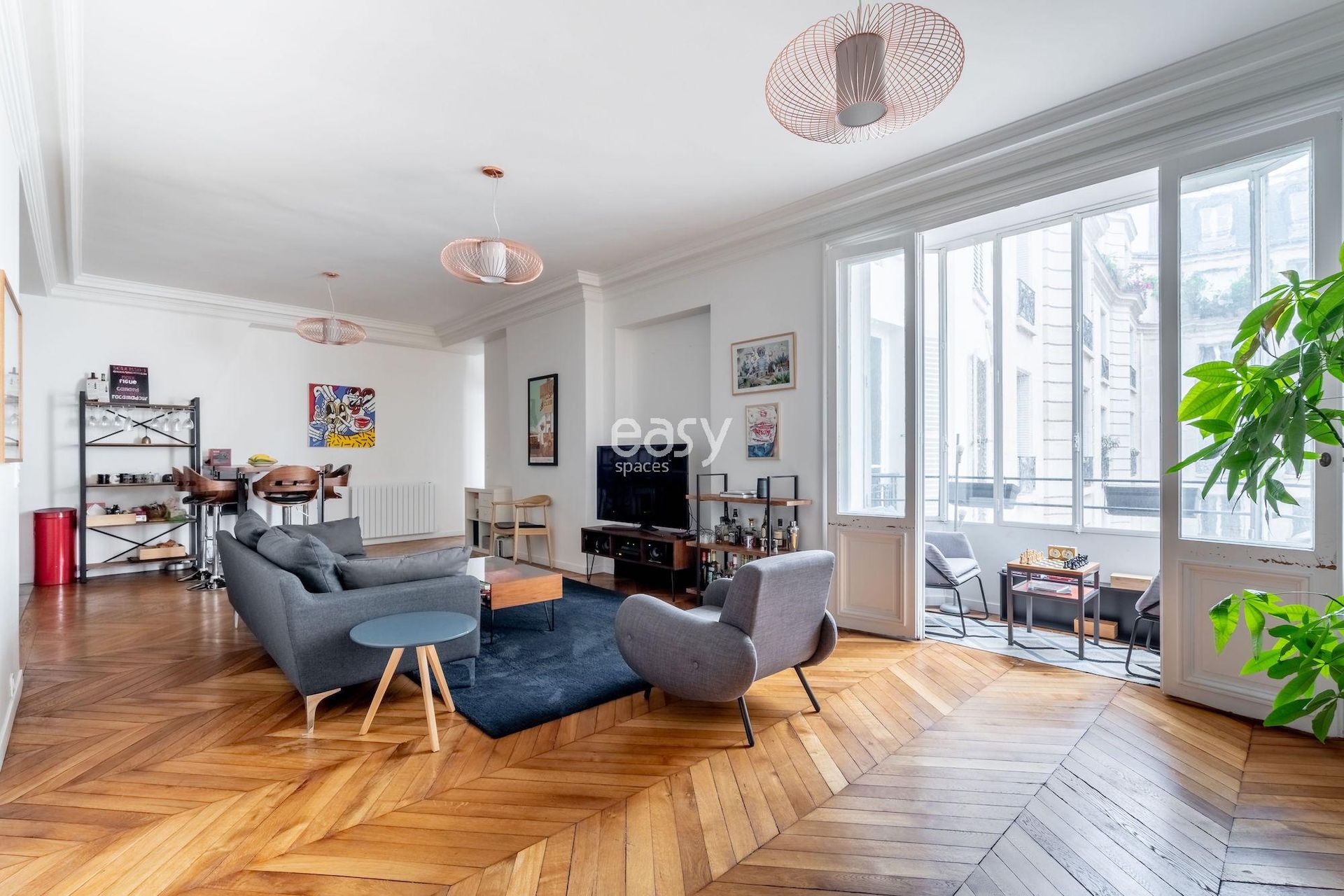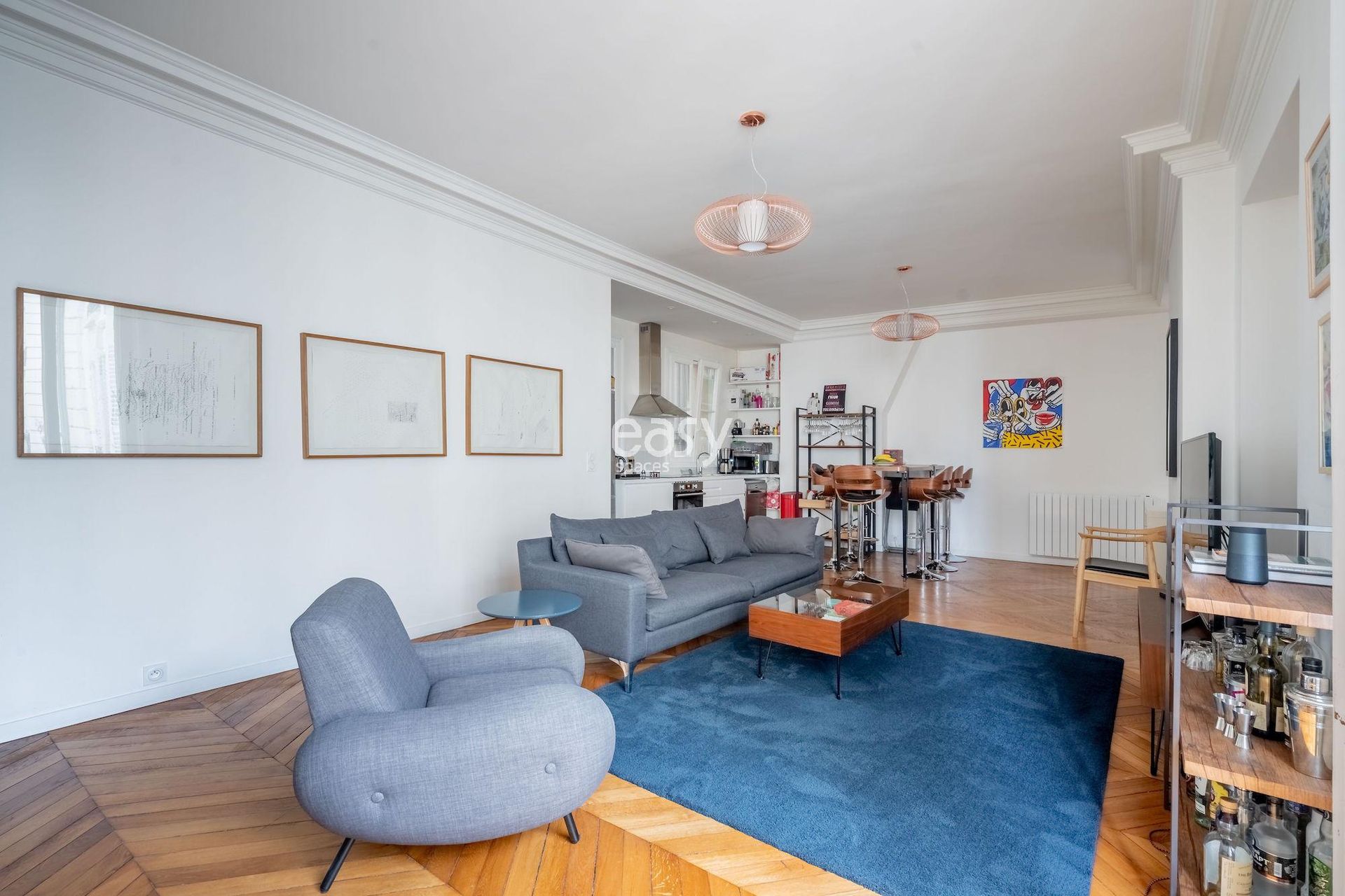 Ce bel appartement Haussmanien en location pour shooting et tournage à Paris bénéficie d'un espace séjour lumineux de 50m2 avec cuisine ouverte.