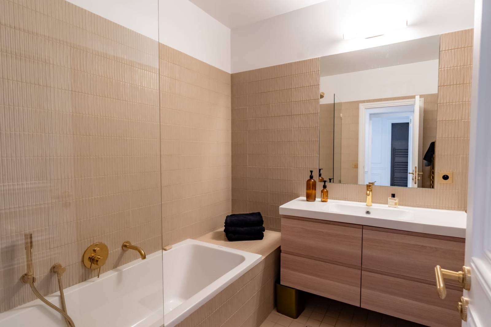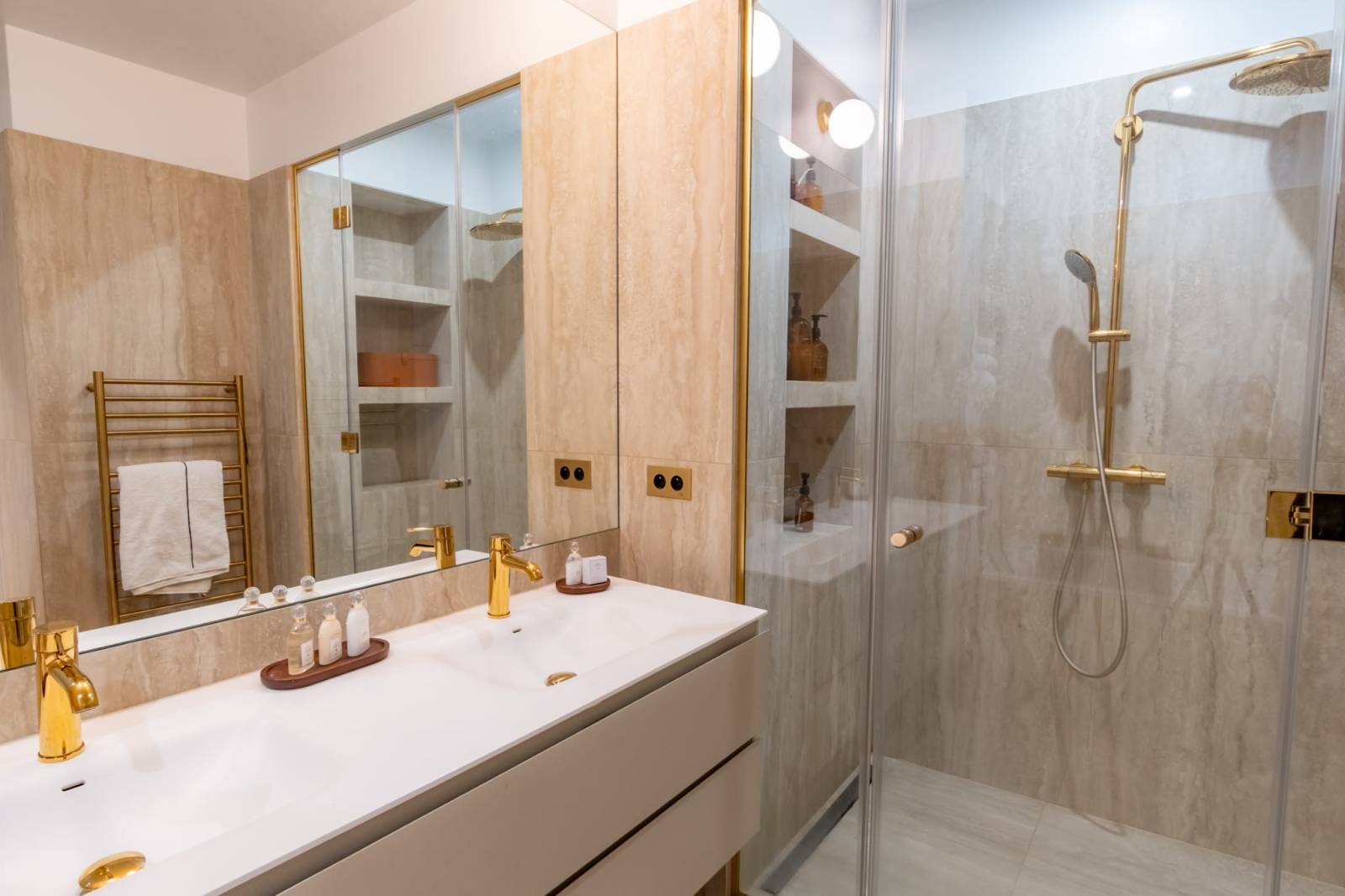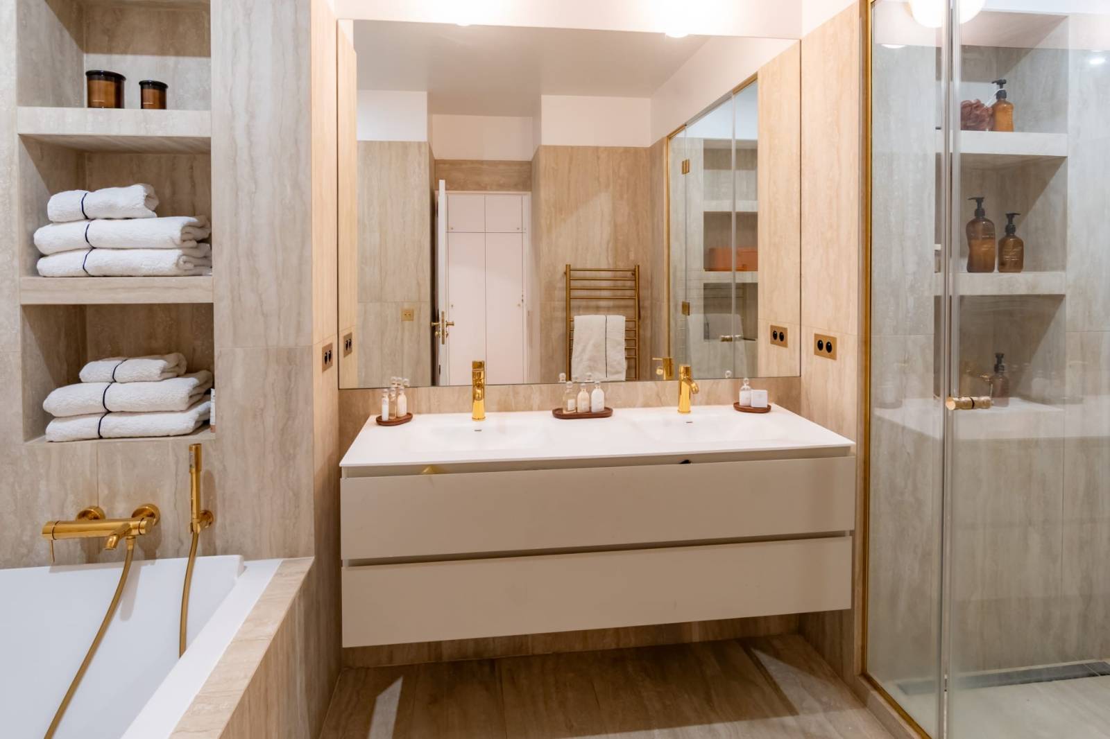 L’appartement dispose de quatre chambres spacieuses et de trois salles de bains modernes, parfaites pour accueillir équipes et talents. La décoration, élégante et raffinée, alliant mobilier contemporain et touches chaleureuses, créant un cadre photogénique et intemporel.