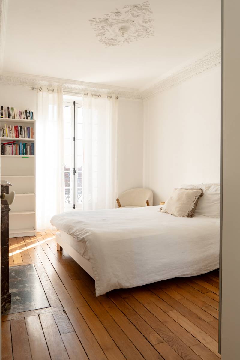 L'architecture de l'appartement est typique du style haussmannien, avec ses magnifiques moulures au plafond et ses hauts murs ornés, qui viennent sublimer l’espace. Le parquet en point de Hongrie, classique et raffiné, crée une ambiance chaleureuse et luxueuse.