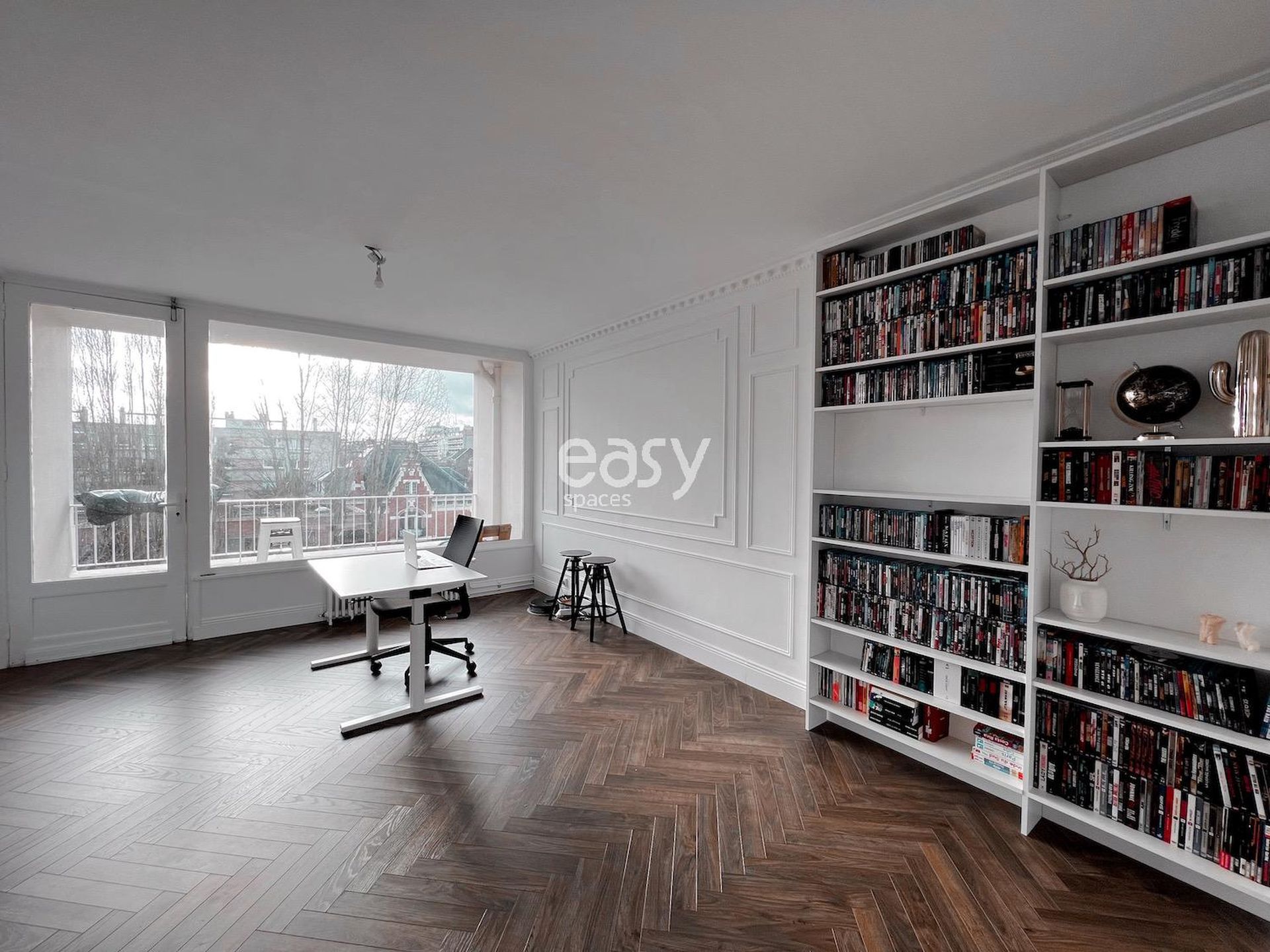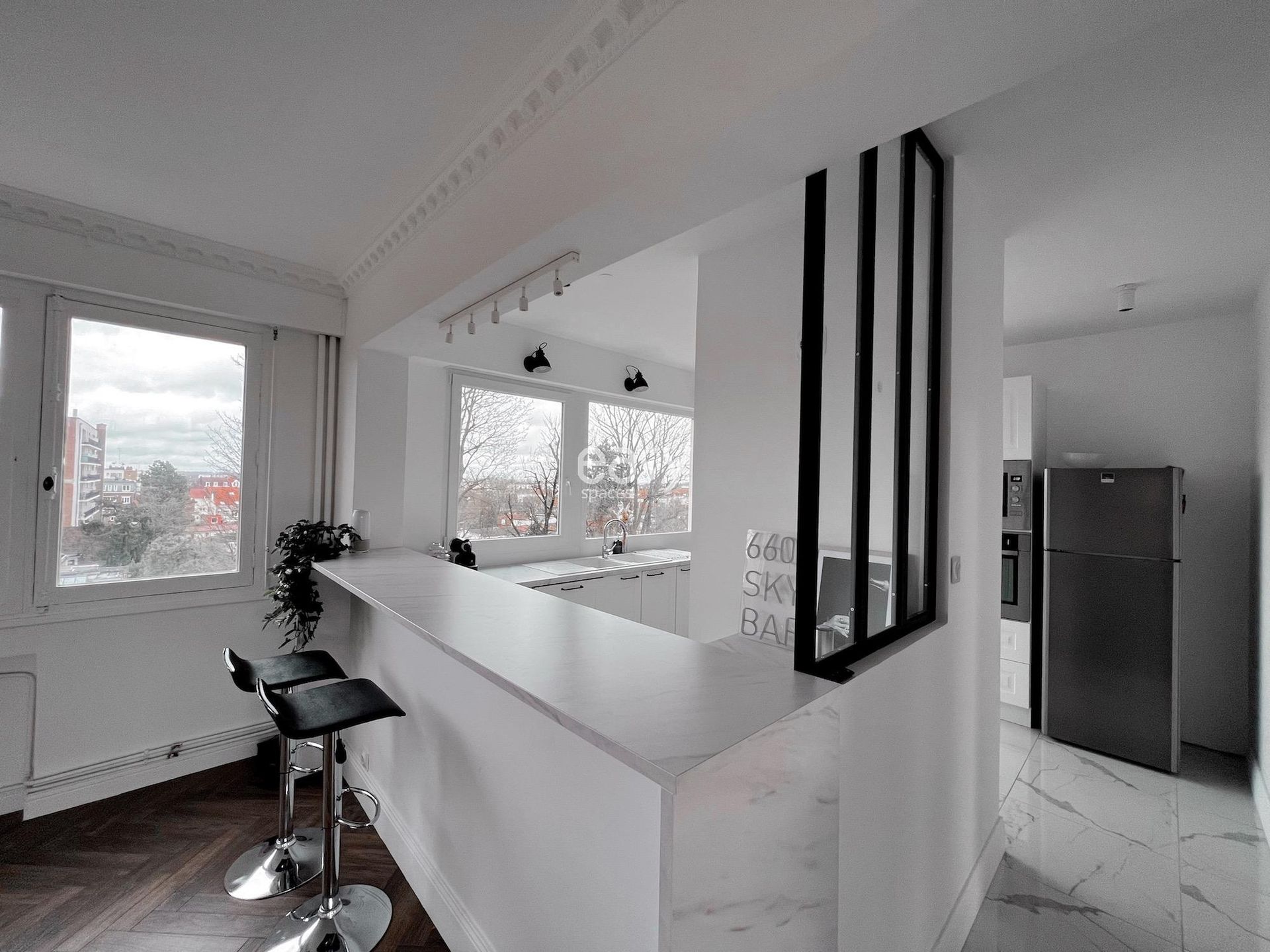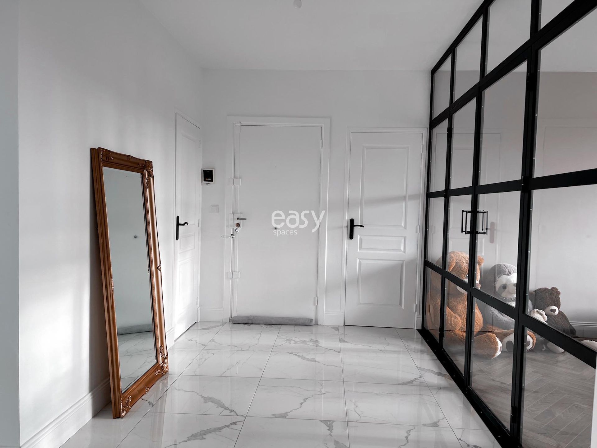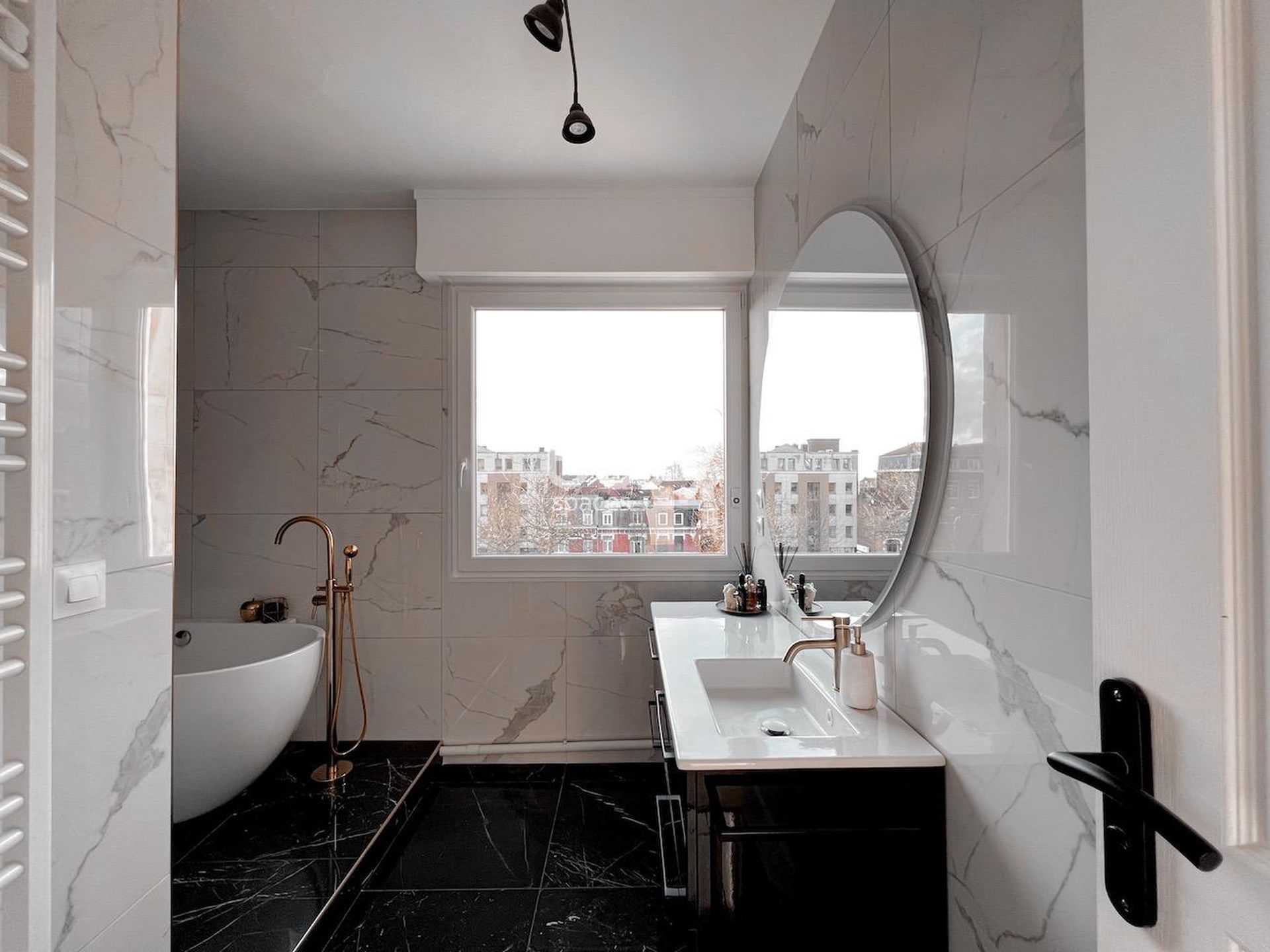 Ce joli appartement moderne en location pour shooting et tournage à Lille possède une entrée avec sol en marbre, un bel espace séjour lumineux de 40m2 avec cheminée et parquet et possède une décoration épurée dans les tons de noir & blanc.