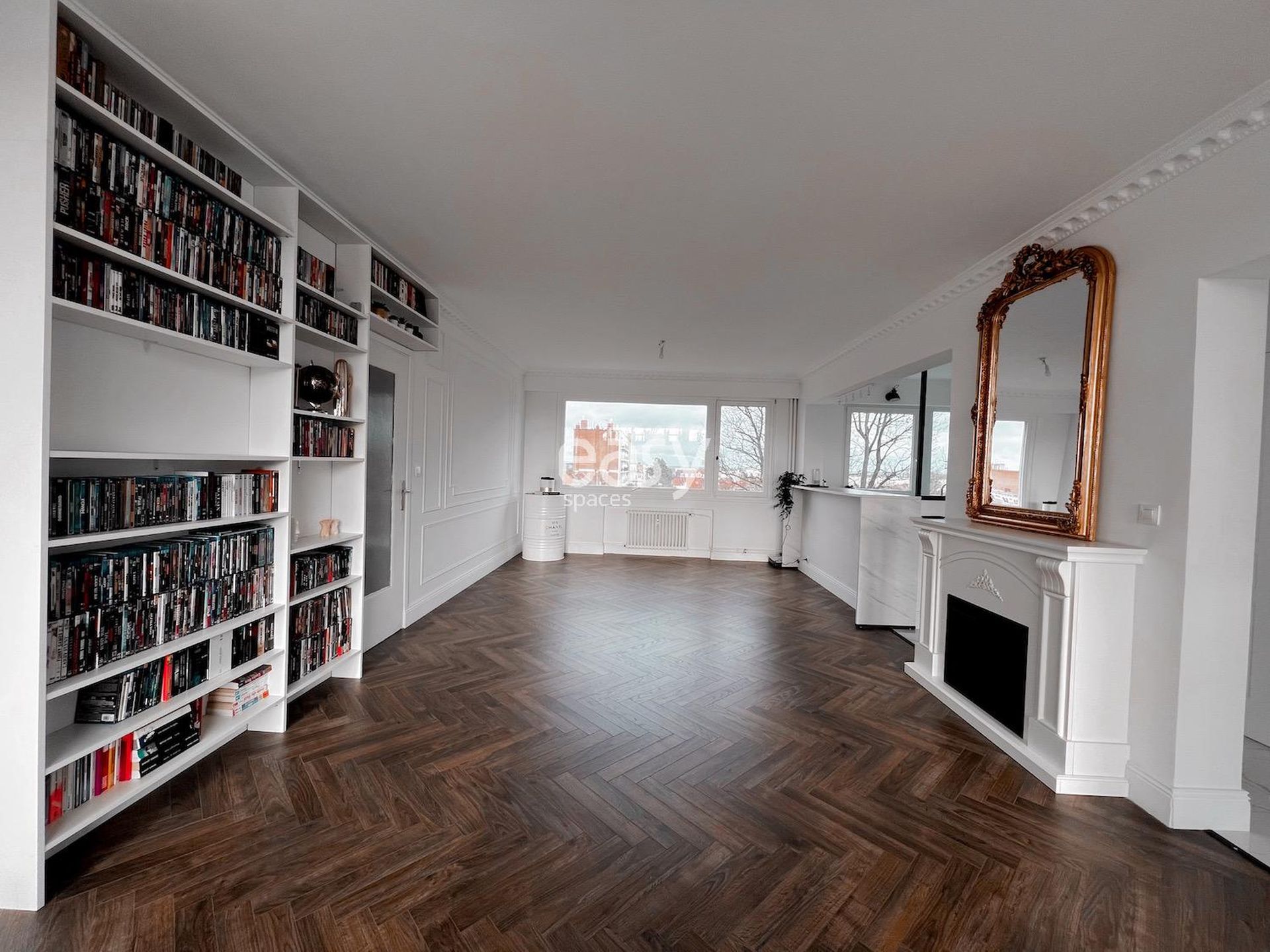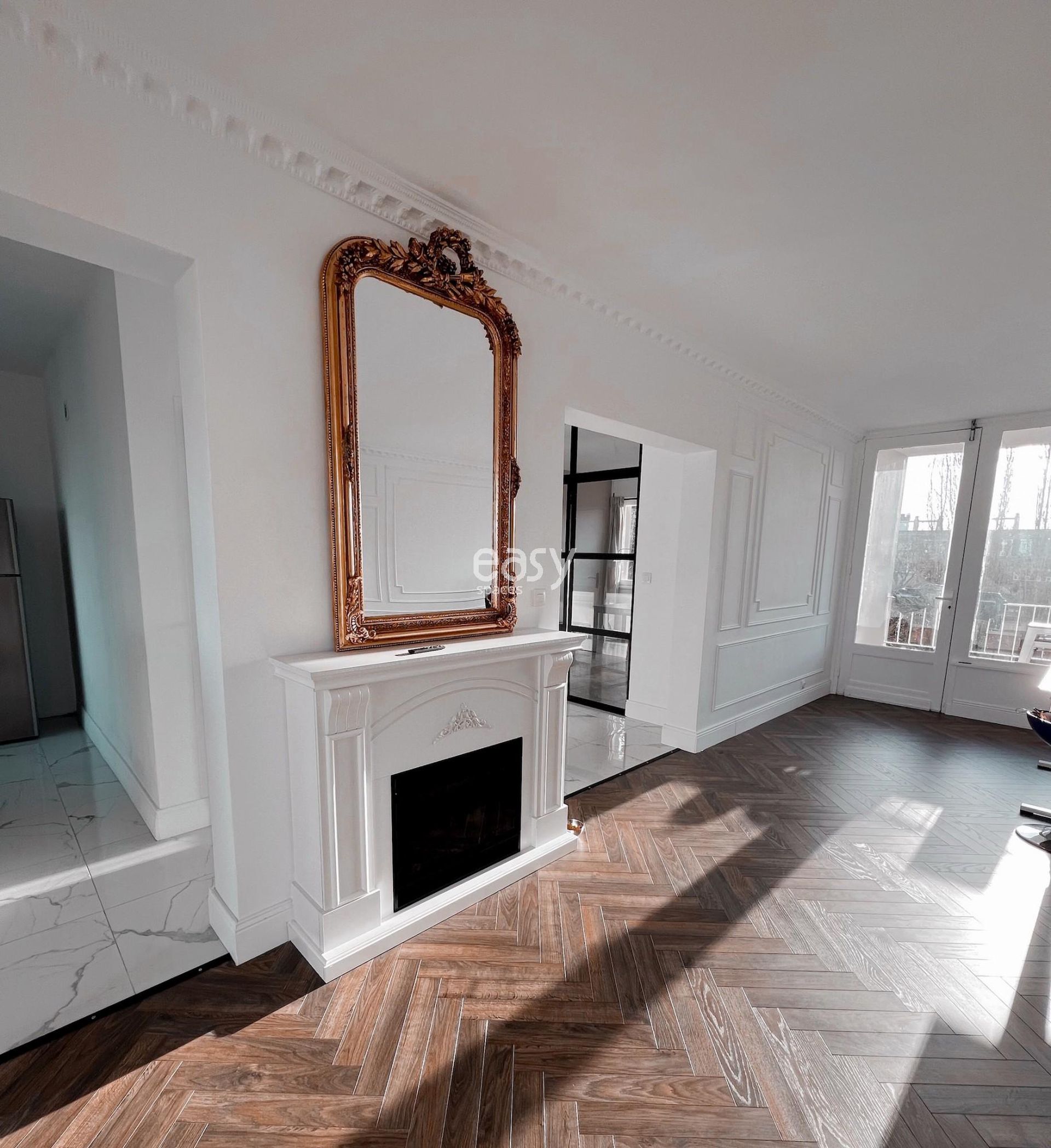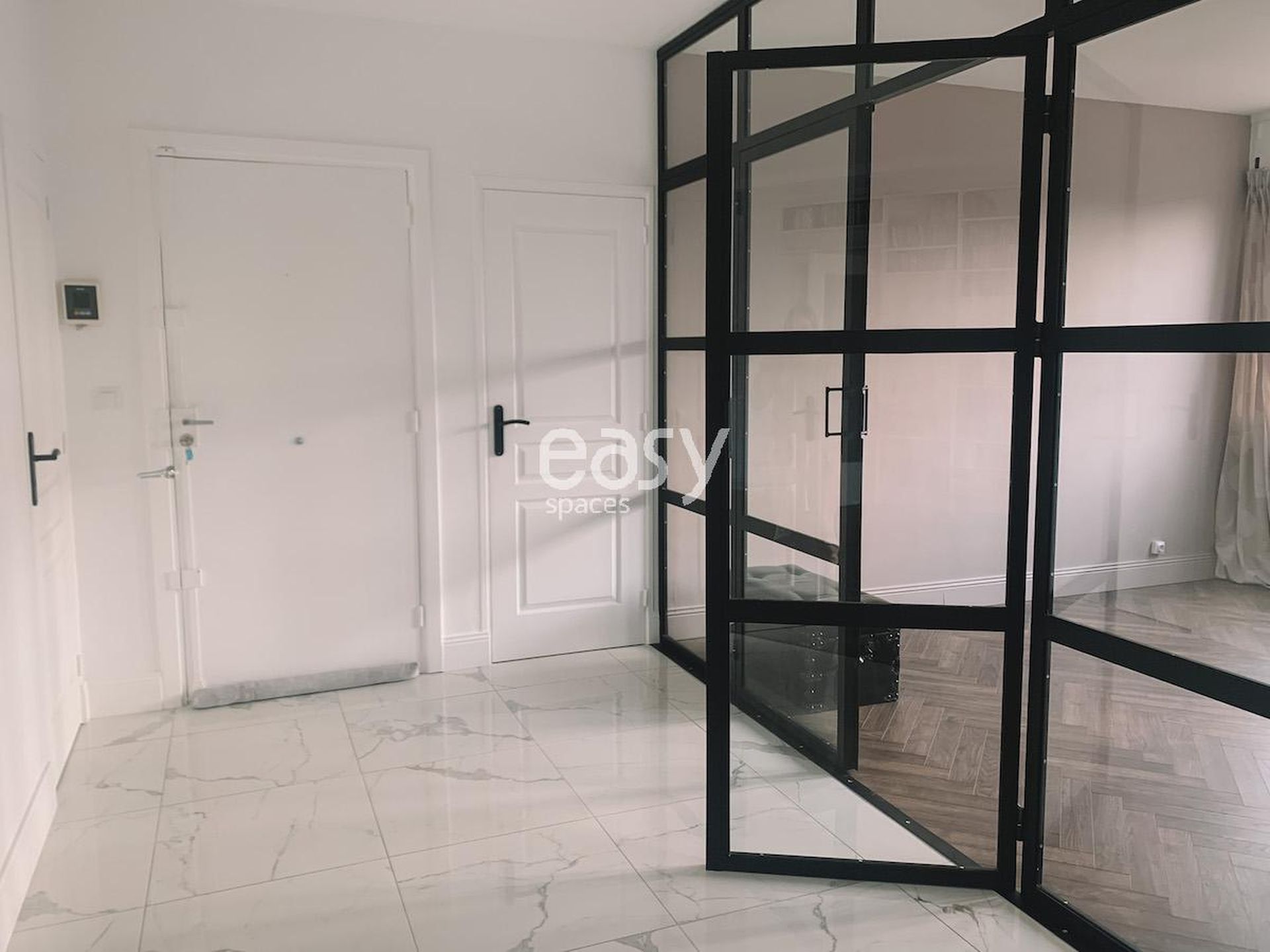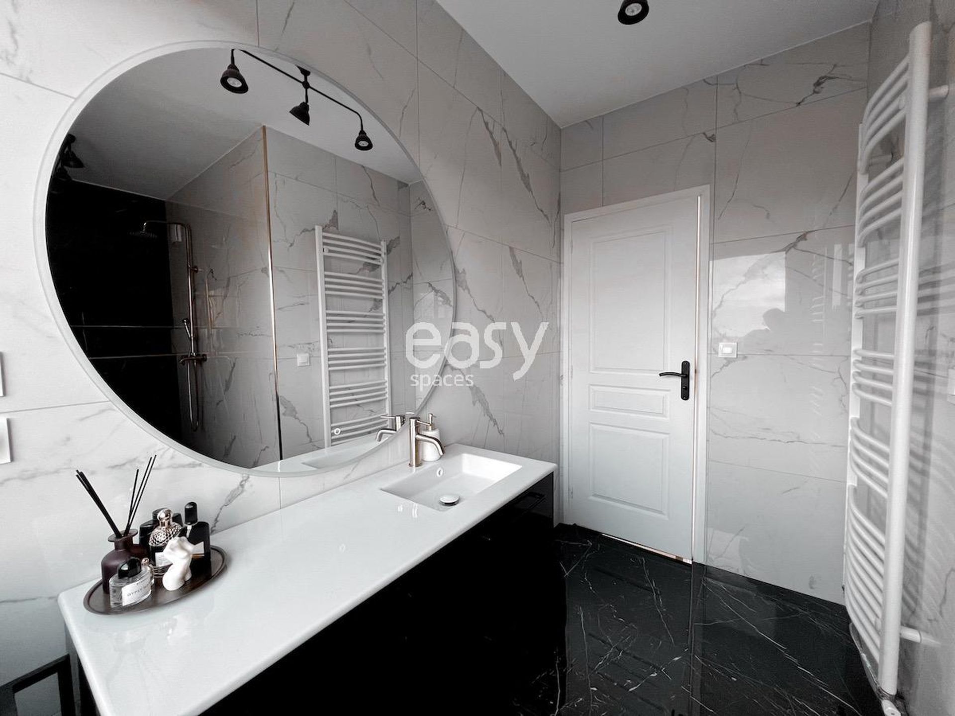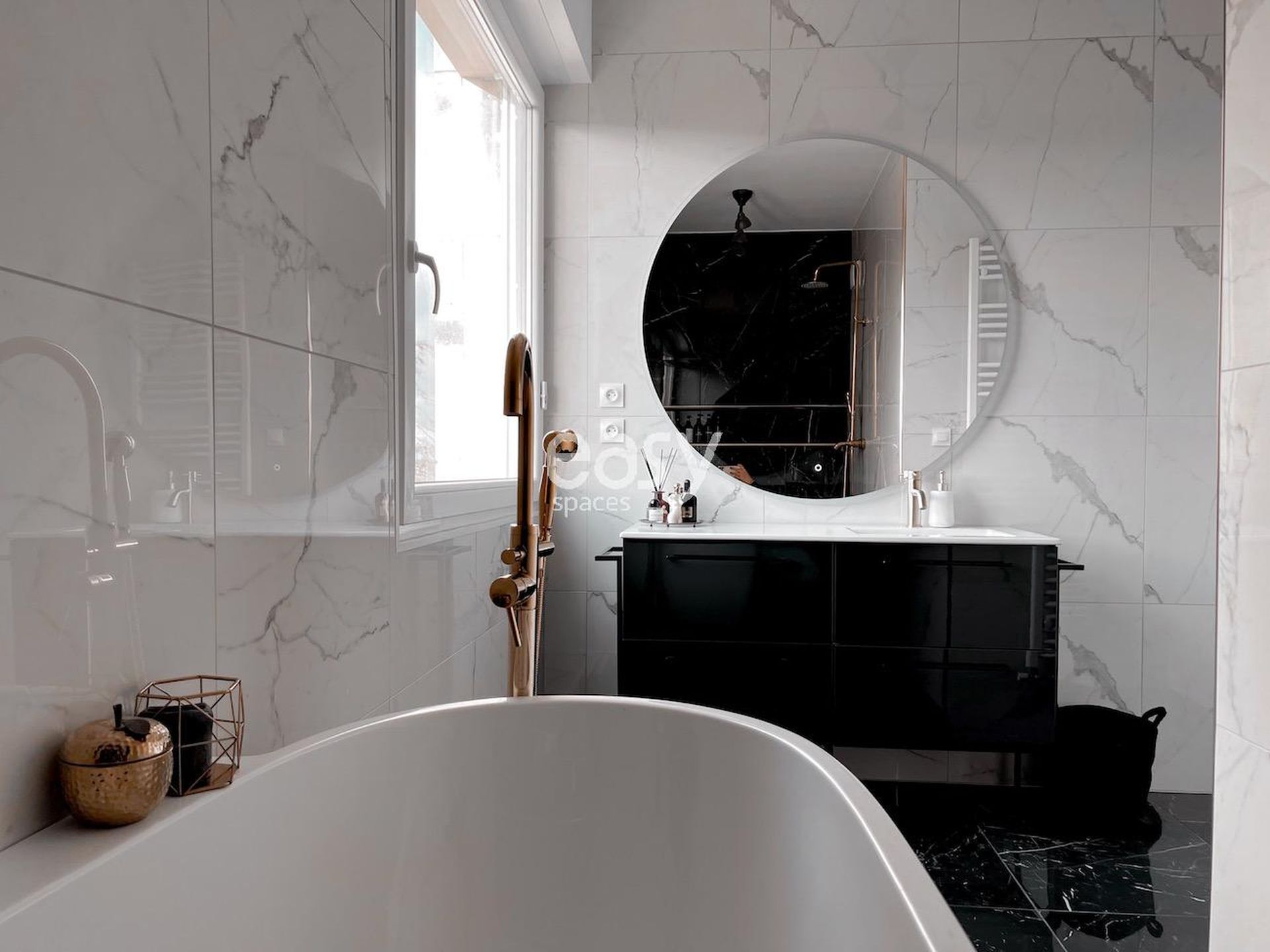 Ce joli appartement moderne en location pour shooting et tournage à Lille possède une entrée avec sol en marbre, un bel espace séjour lumineux de 40m2 avec cheminée et parquet et possède une décoration épurée dans les tons de noir & blanc.