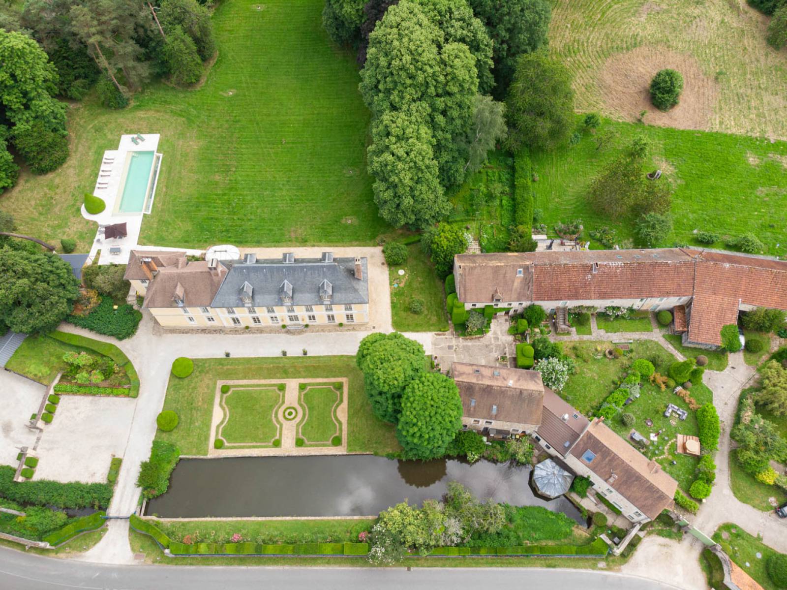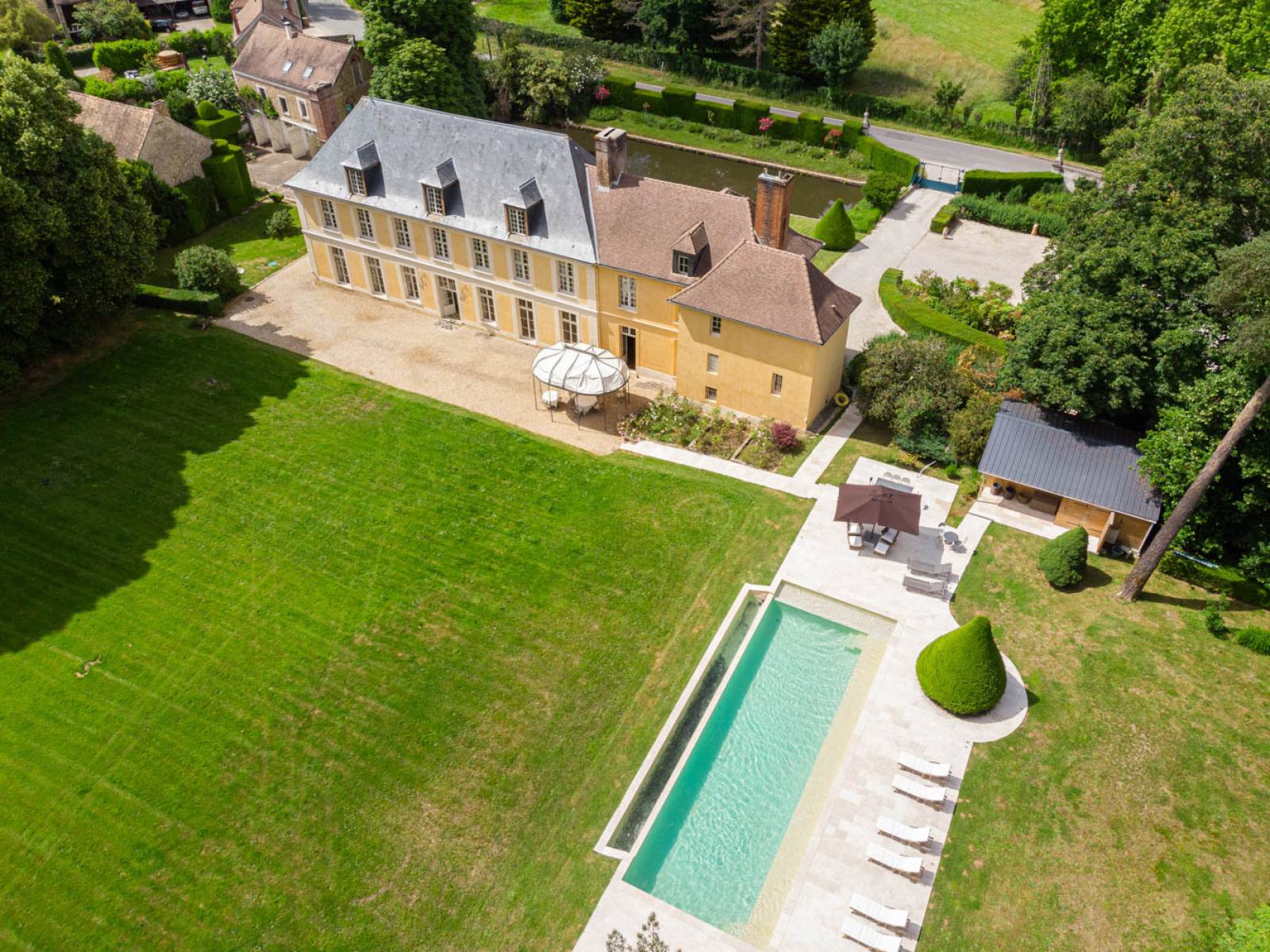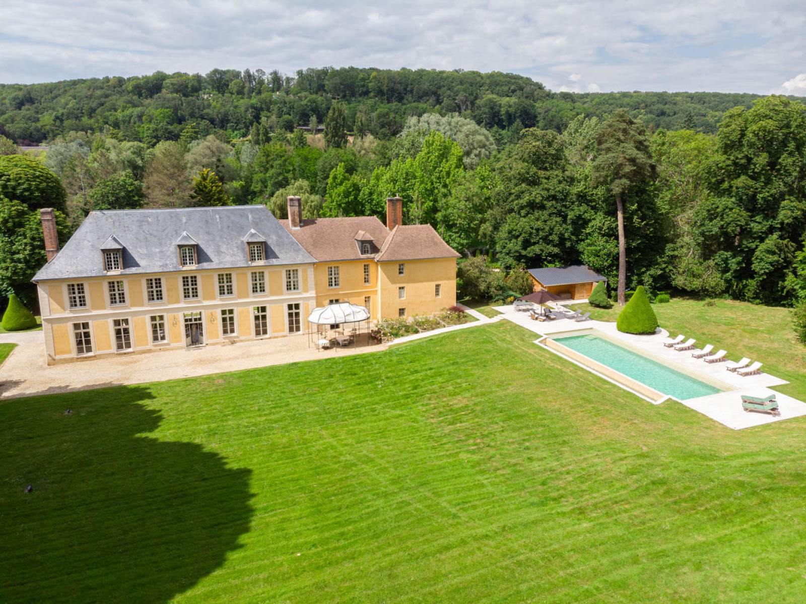 Piscine Élégante : La piscine du domaine ajoute une touche de luxe. Entourée de transats et présentant un panorama sur le parc, elle constitue un lieu privilégié pour des scènes de détente ou des ambiances estivales ou encore pour un shooting de mobilier outdoor.