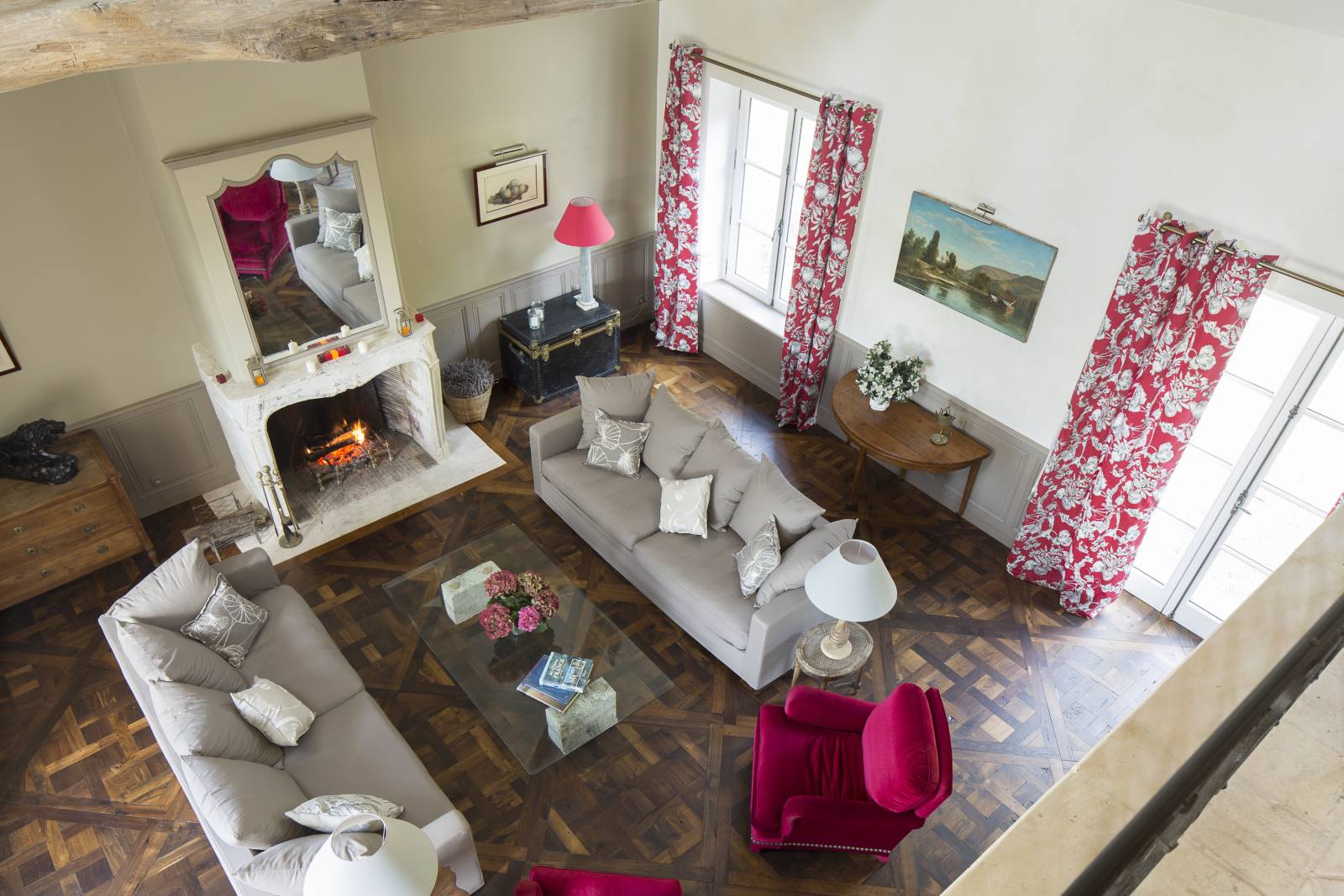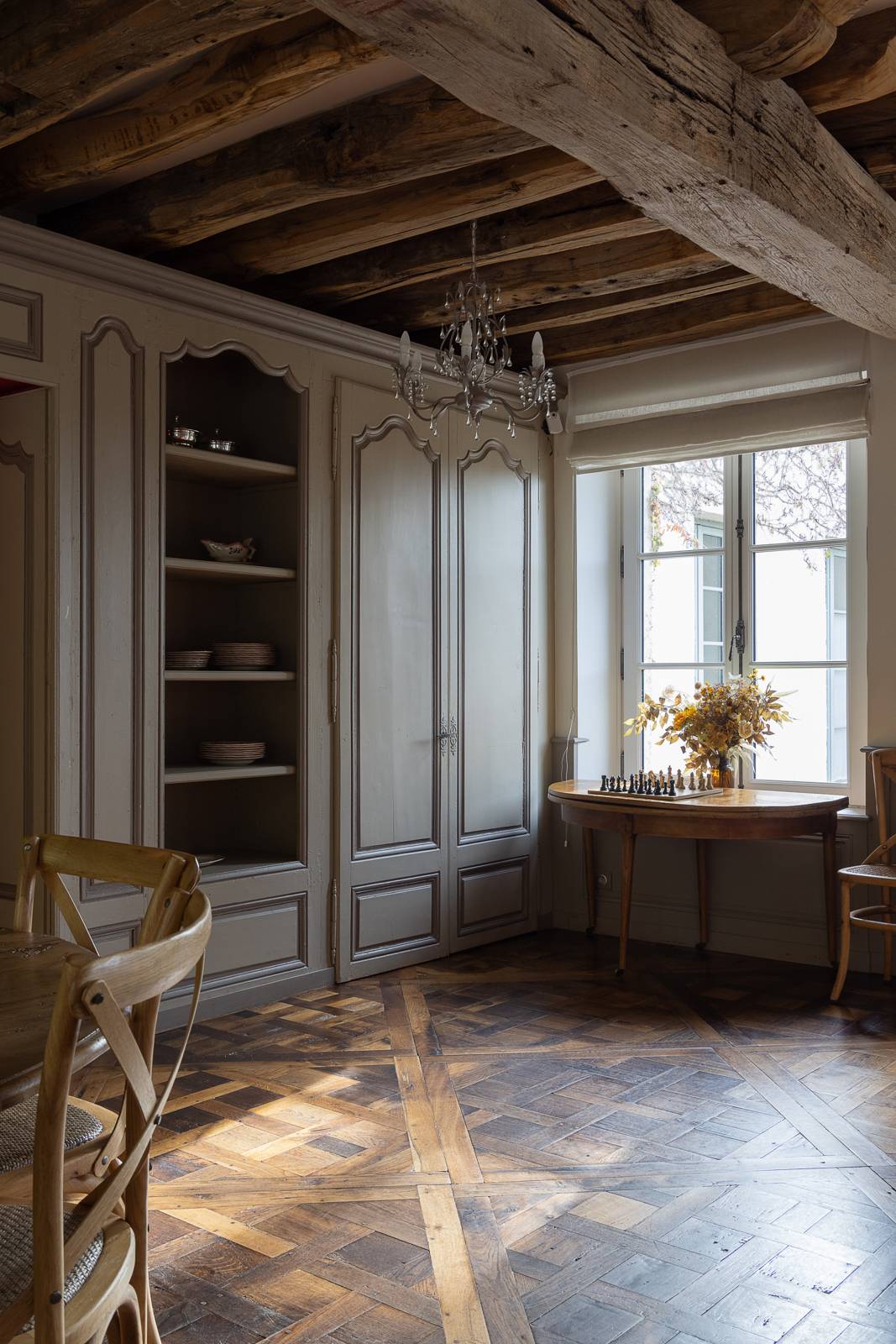 Le sol en parquet ancien, les poutres apparentes, et les meubles soigneusement choisis évoquent une ambiance cosy et élégante. La hauteur sous plafond impressionnante donne à la pièce une dimension majestueuse, tout en conservant une ambiance cosy.