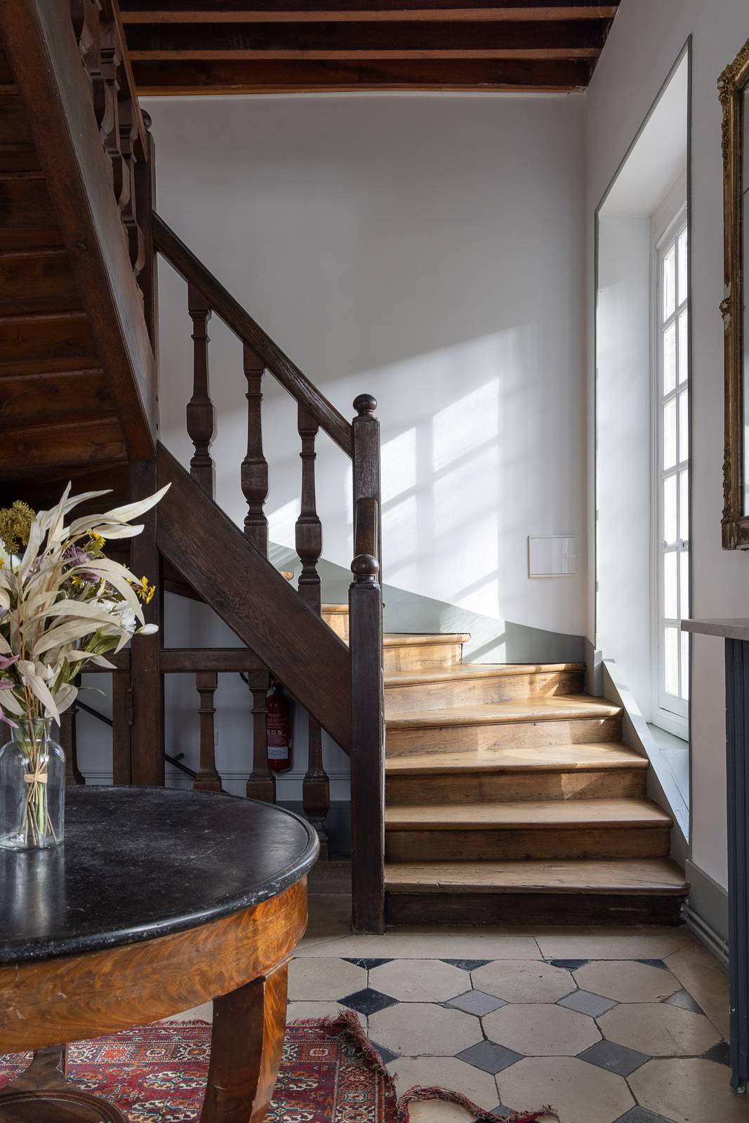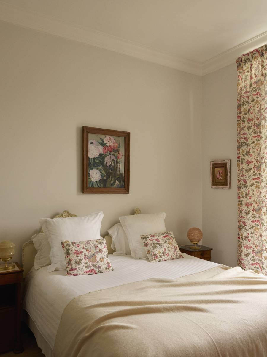 À l’intérieur, le décor soigneusement mis en scène mélange éléments d’architecture anciens (moulures, parquets) et une décoration cosy et chaleureuse : canapés en lin, tapis texturés, , matières naturelles, objets chinés, mobilier en bois patiné...
