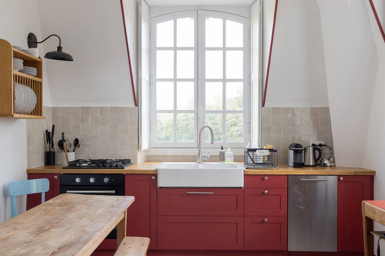 Une cuisine d’esprit campagne chic, avec vaisselle ancienne, crédence en faïence et poutres apparentes : l’endroit rêvé pour un shooting d’accessoires de décoration, marque culinaire, vaisselle artisanale ou bougies parfumées ;