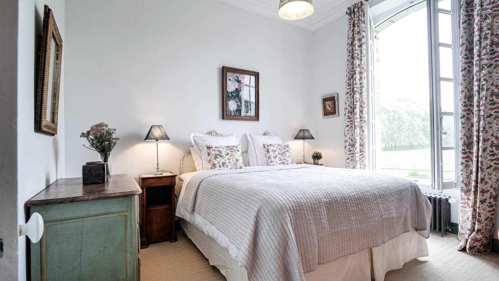 Une chambre romantique avec lit king-size, parfaite pour une mise en scène de literie haut de gamme, pyjamas ou cosmétiques ;
