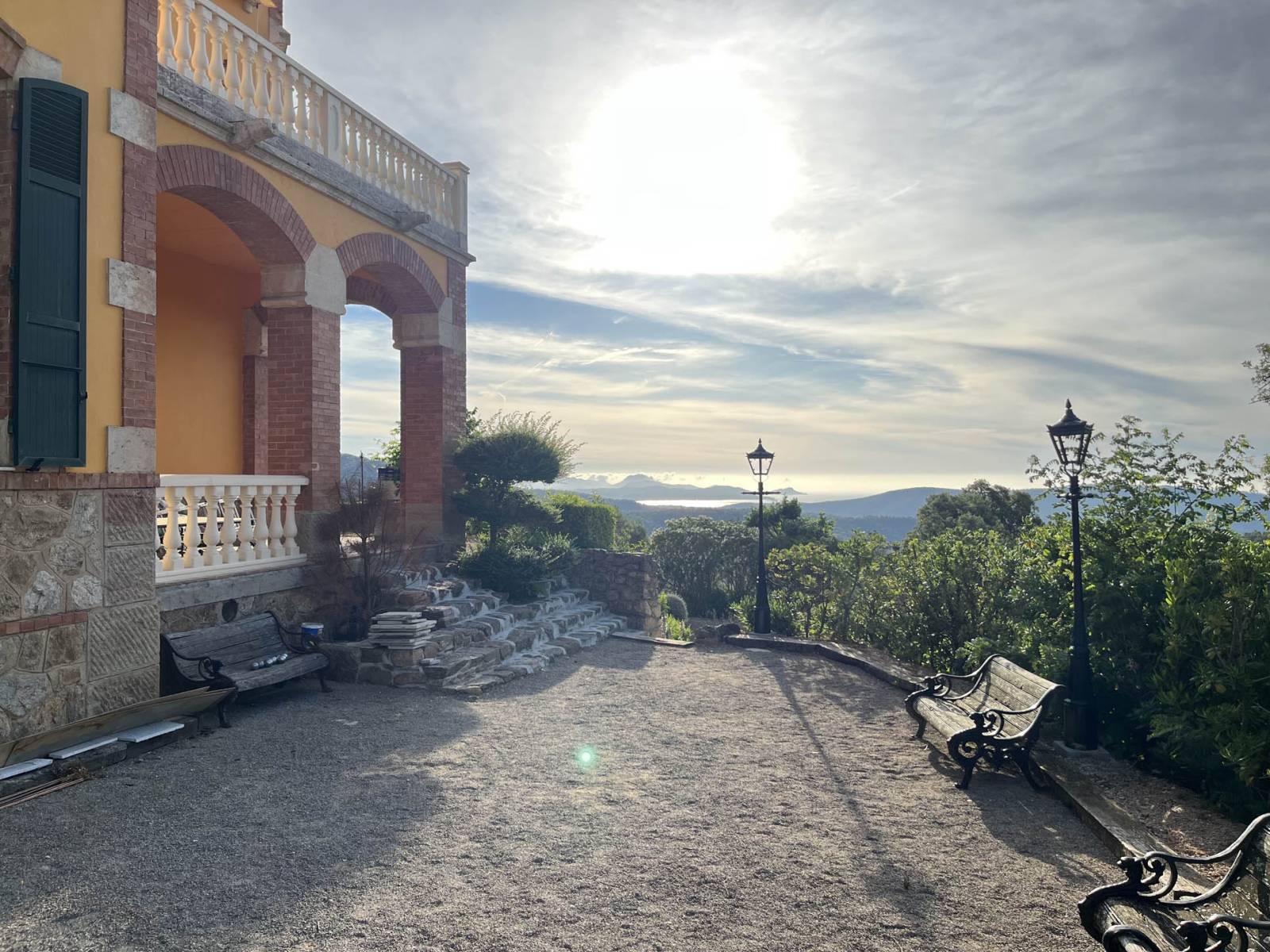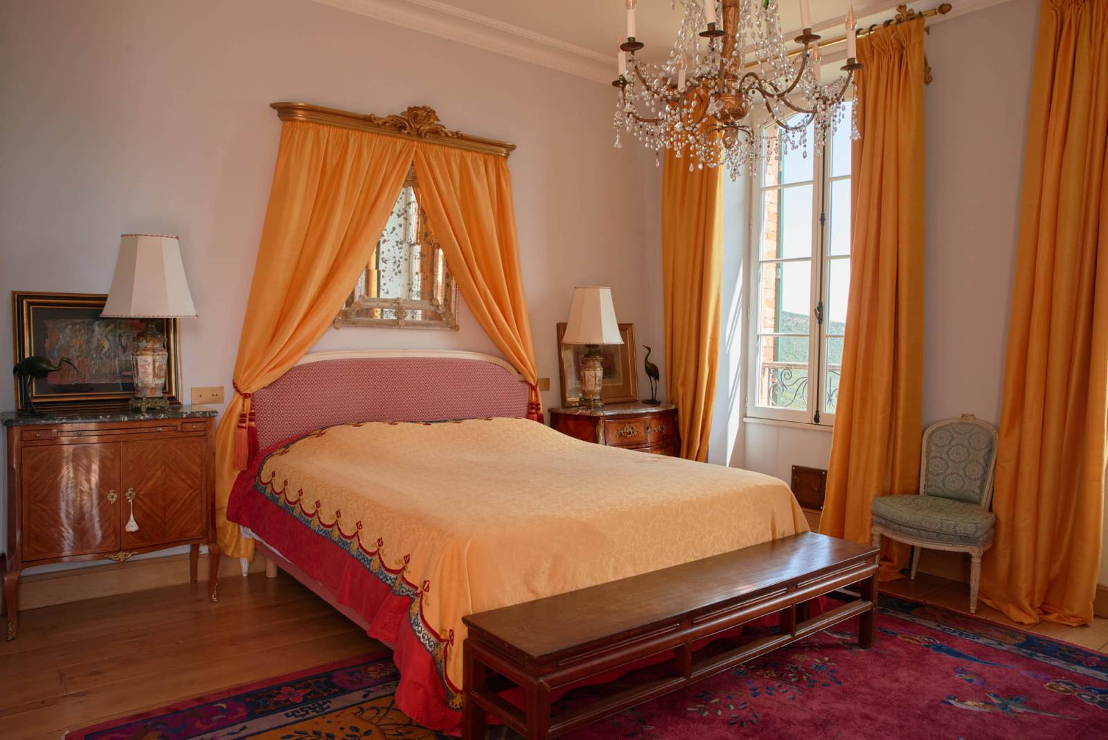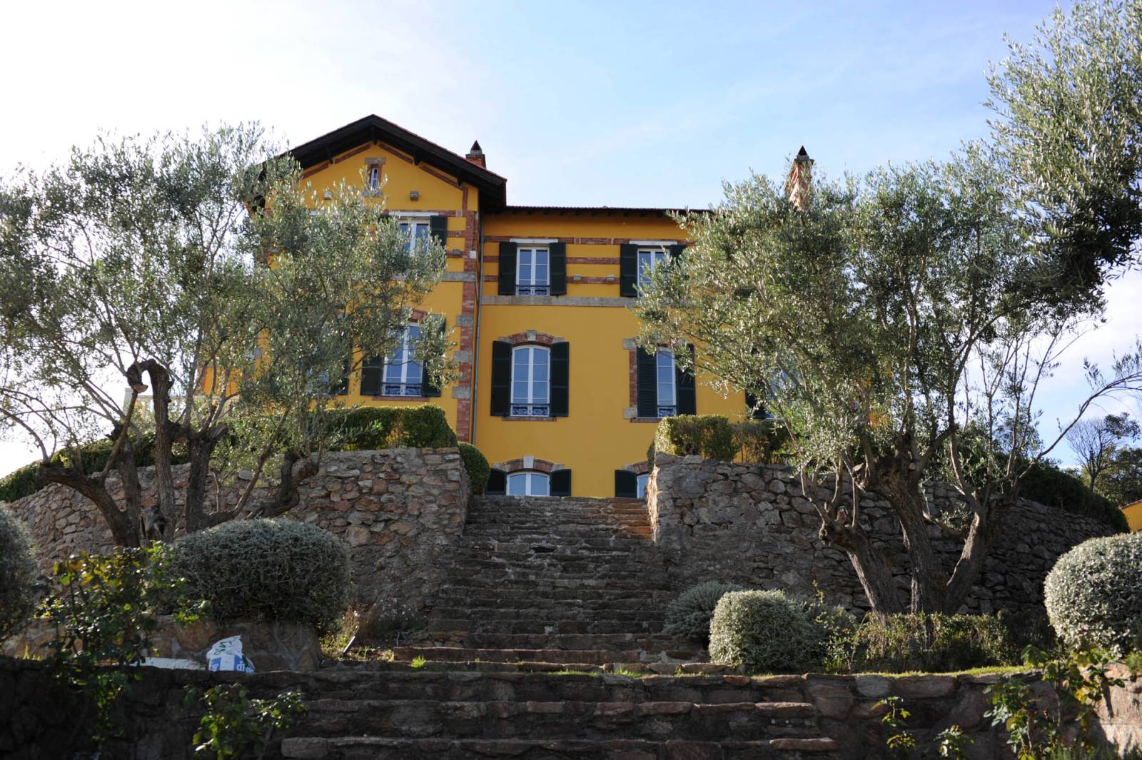 Extérieurs : jardin 3 000 m² dominant la mer, terrasse, piscine 20 x 6 m
