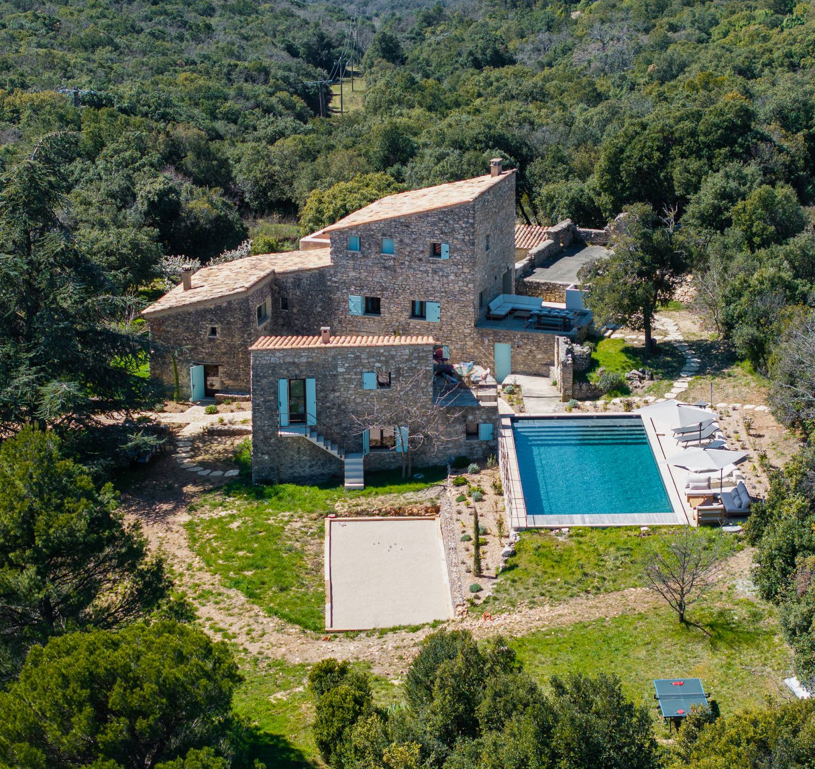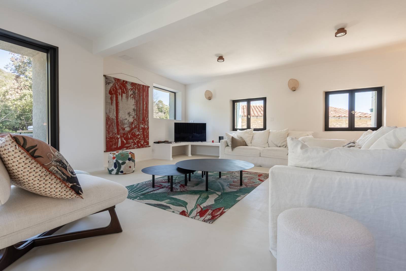 À l’extérieur, une grande piscine s’intègre harmonieusement dans un jardin paysager aux allures de havre de paix. Les différents espaces extérieurs – terrasses, recoins ombragés, végétation méditerranéenne – permettent de multiples mises en scène, à la fois naturelles et élégantes.