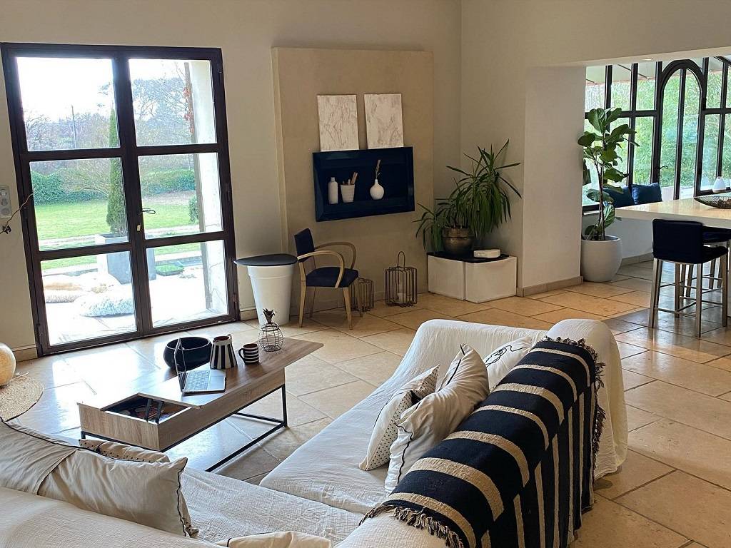 À l’intérieur, le coup de cœur est immédiat : un vaste séjour voûté révèle une décoration chaleureuse et un intérieur cosy mêlant matériaux bruts, teintes douces et mobilier soigneusement sélectionné.