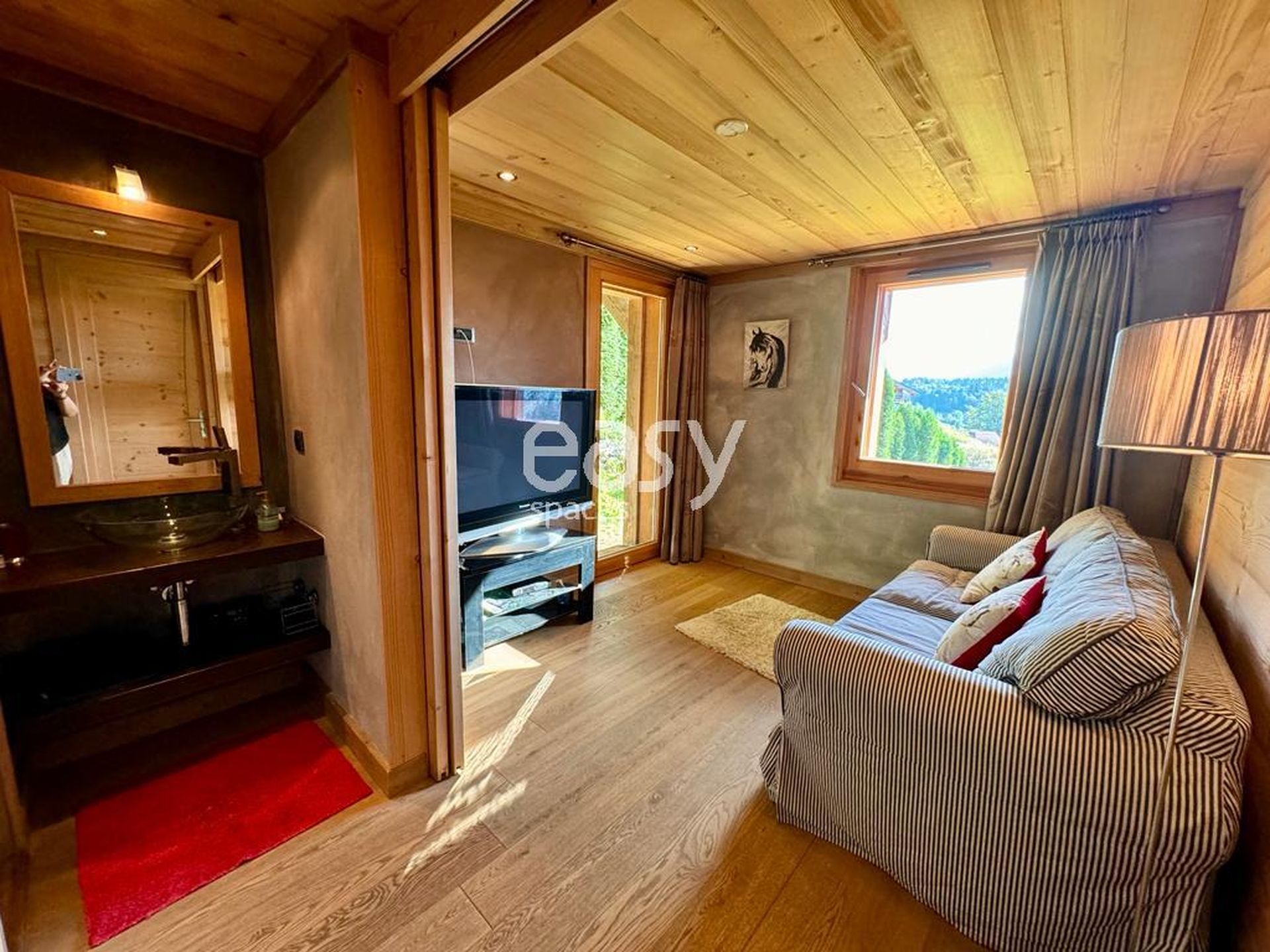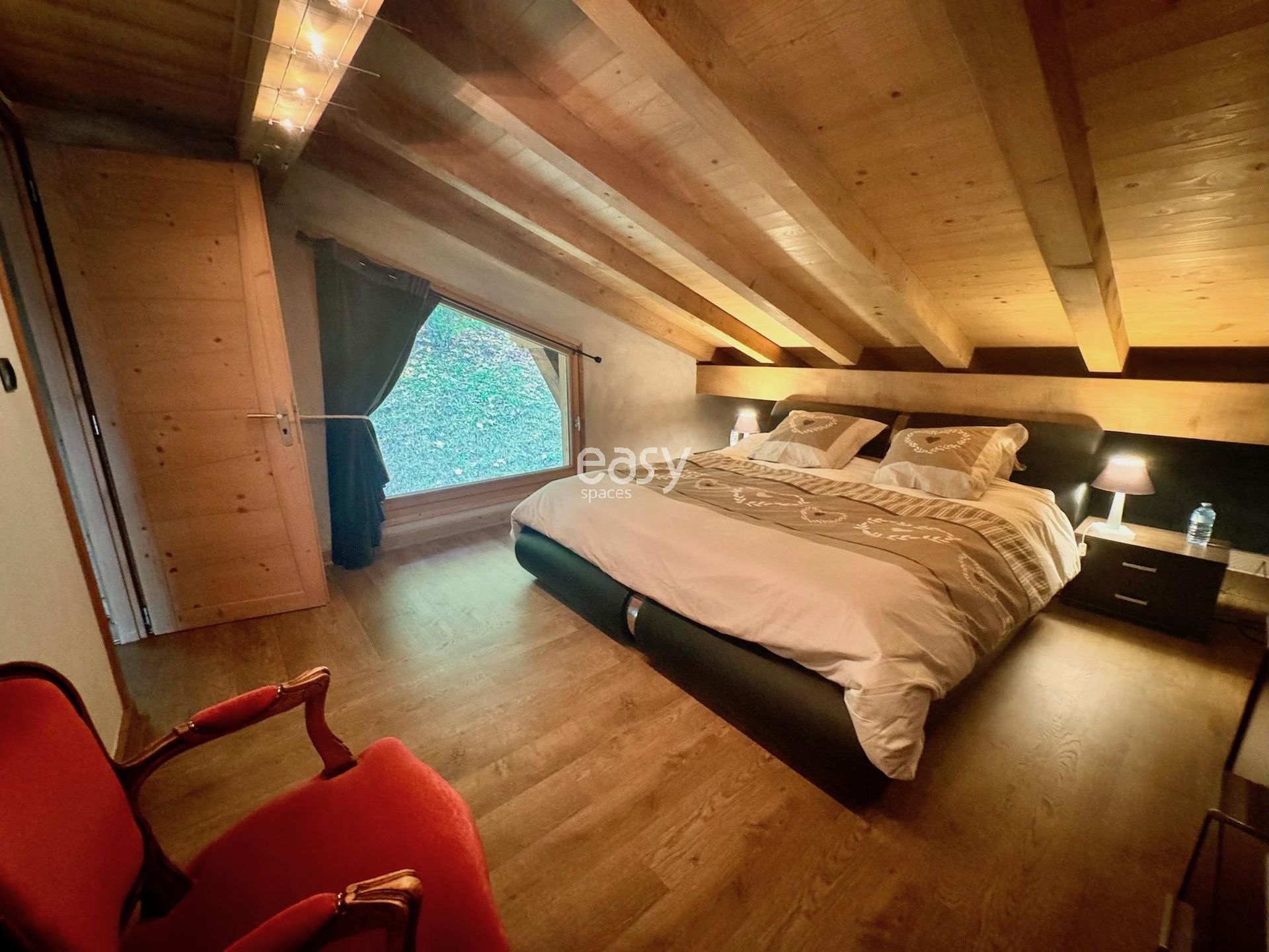 Bénéficiant d'un beau séjour de 90m2 avec plafond cathédrale, d'une décoration chaleureuse et d'une superbe vue dégagée ce chalet sera idéal pour tout type de shooting photo en Haute Savoie.