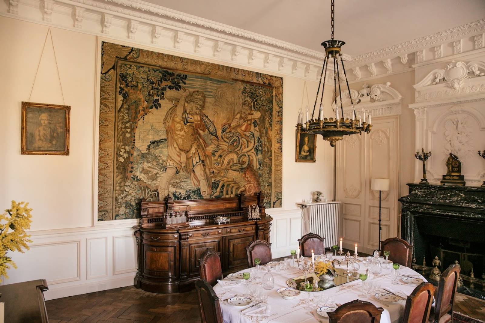 À l’intérieur, on découvre 4 séjours totalisant 200 m², des hauteurs sous plafond de 4 mètres, un décor authentique de château, des espaces de réception modulables, une cuisine de 50 m², ainsi que de grandes salles à manger de 60 m² et 25 m².