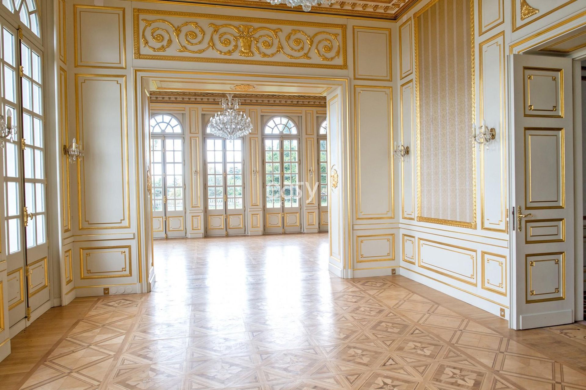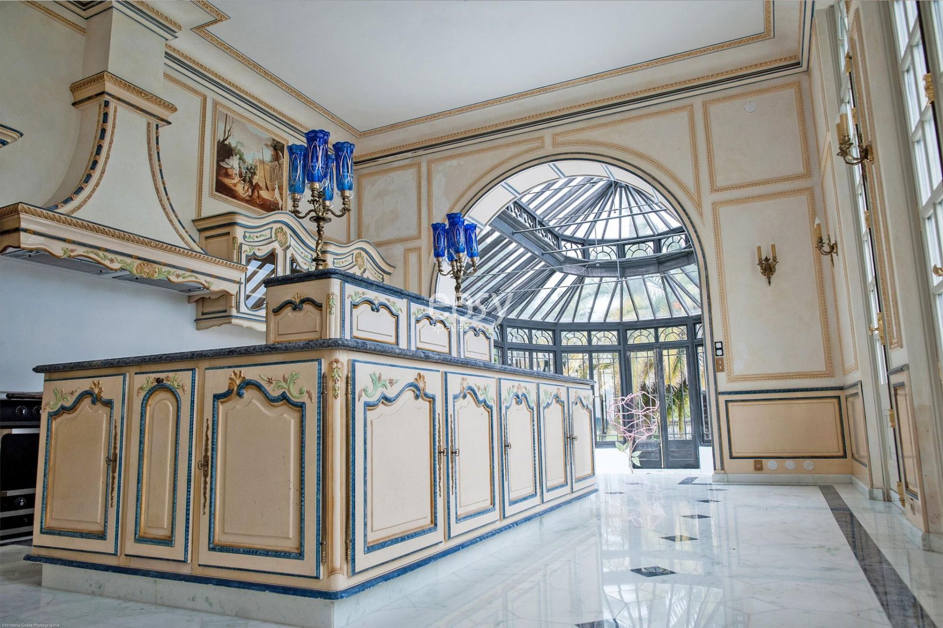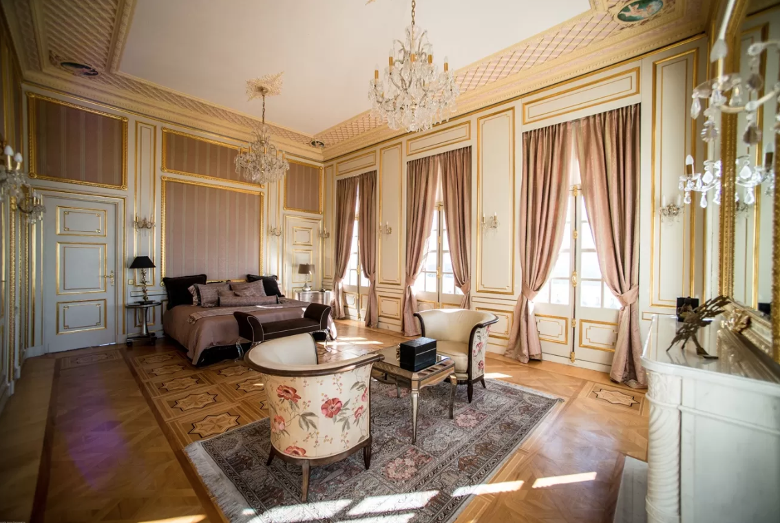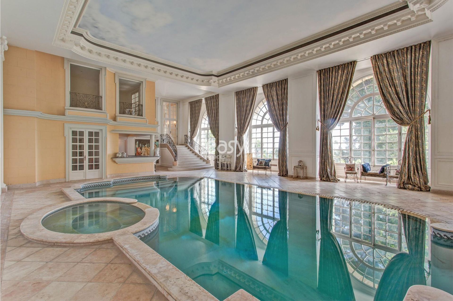 Les atouts du lieu : Grand parc arboré, décoration baroque avec moulures, piscine intérieure, véranda spacieuse, caractère atypique.
