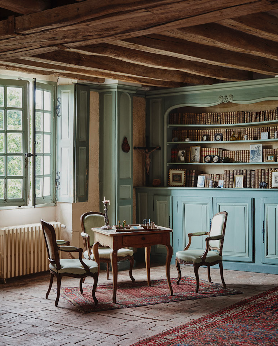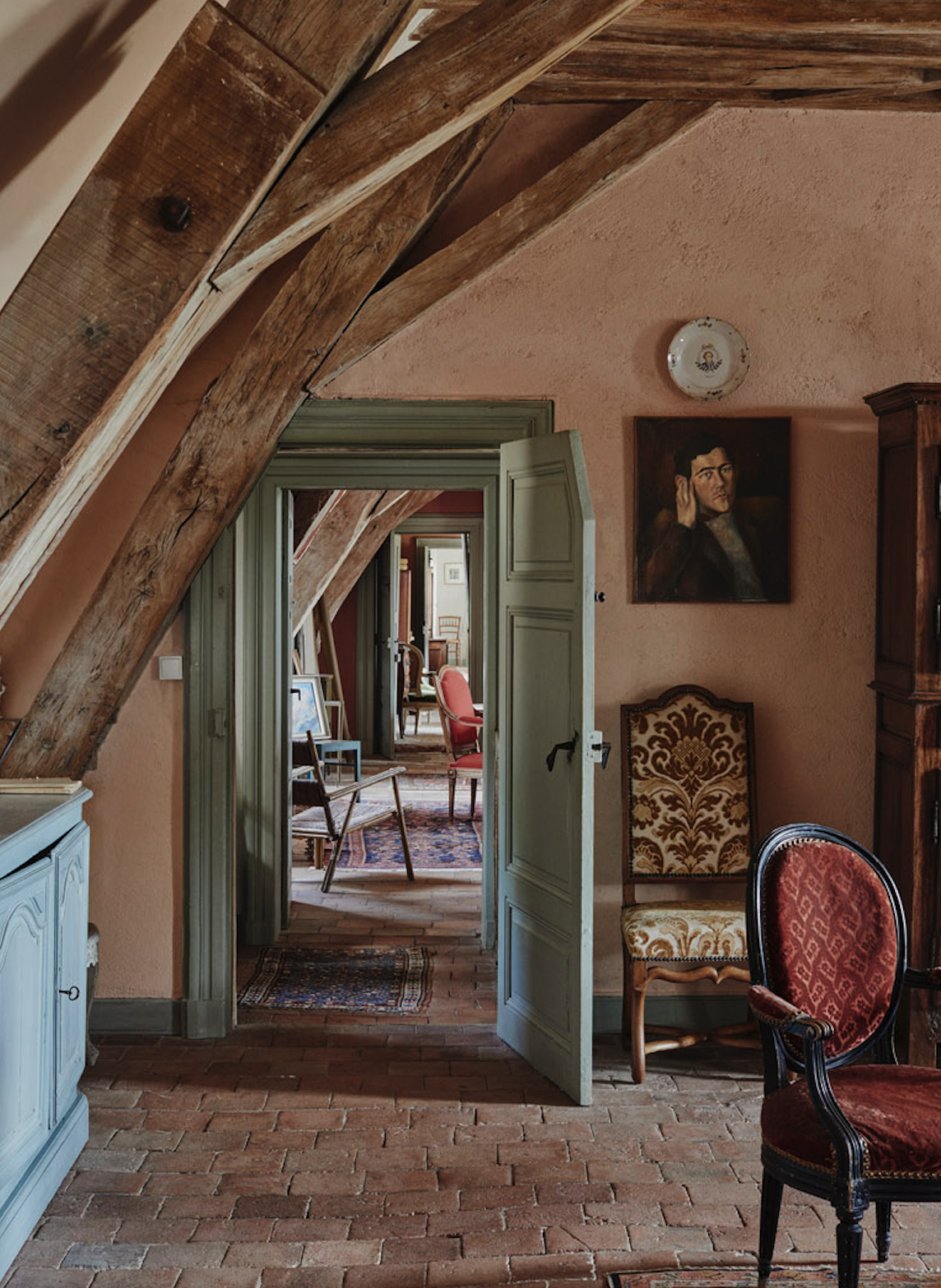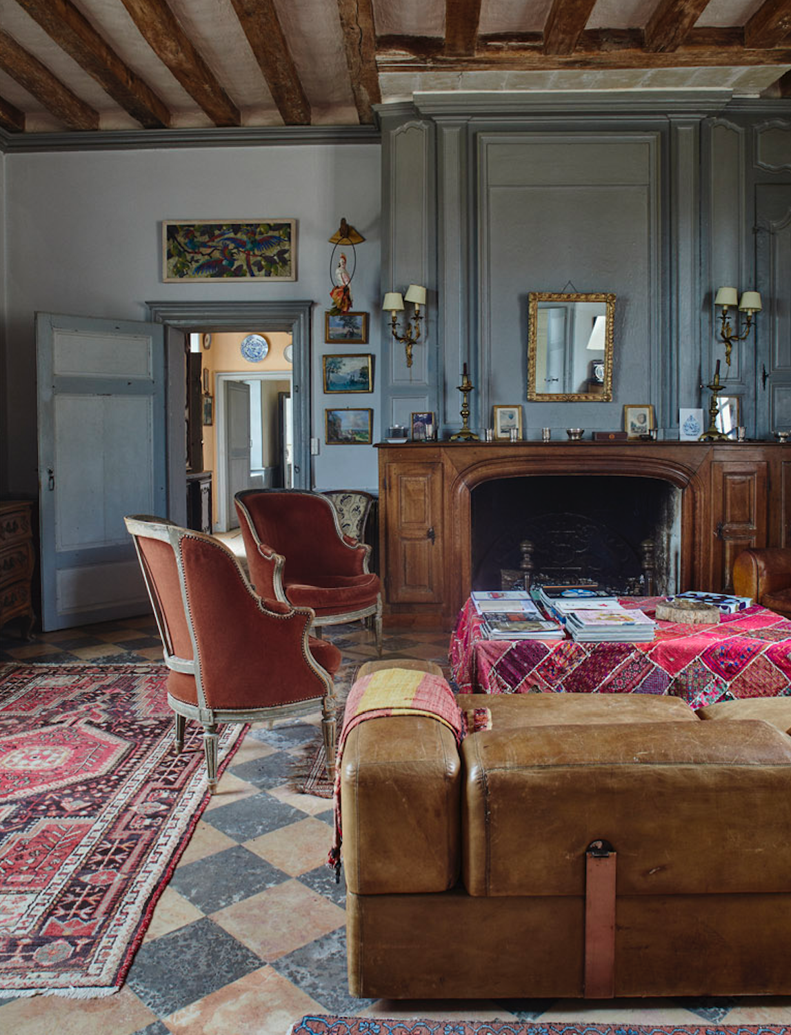 Les poutres apparentes, les parquets anciens, les cheminées monumentales et les hauteurs sous plafond impressionnantes confèrent à chaque pièce une ambiance chaleureuse et cinématographique.