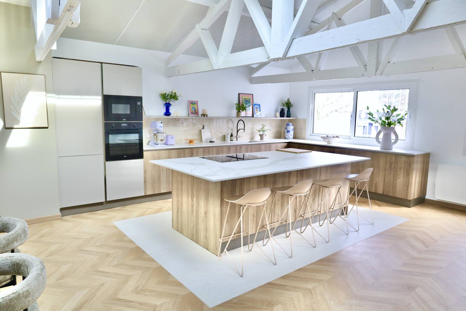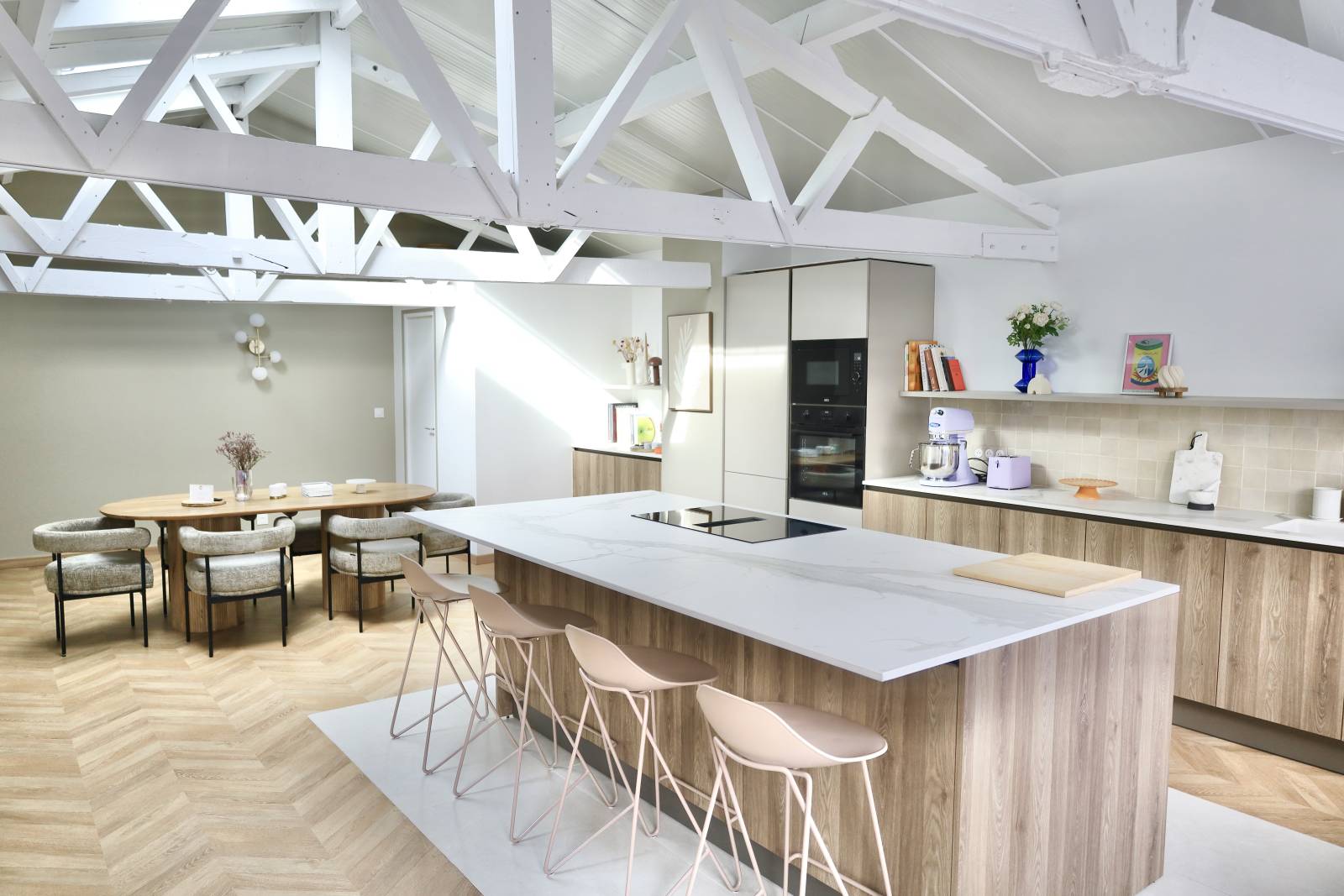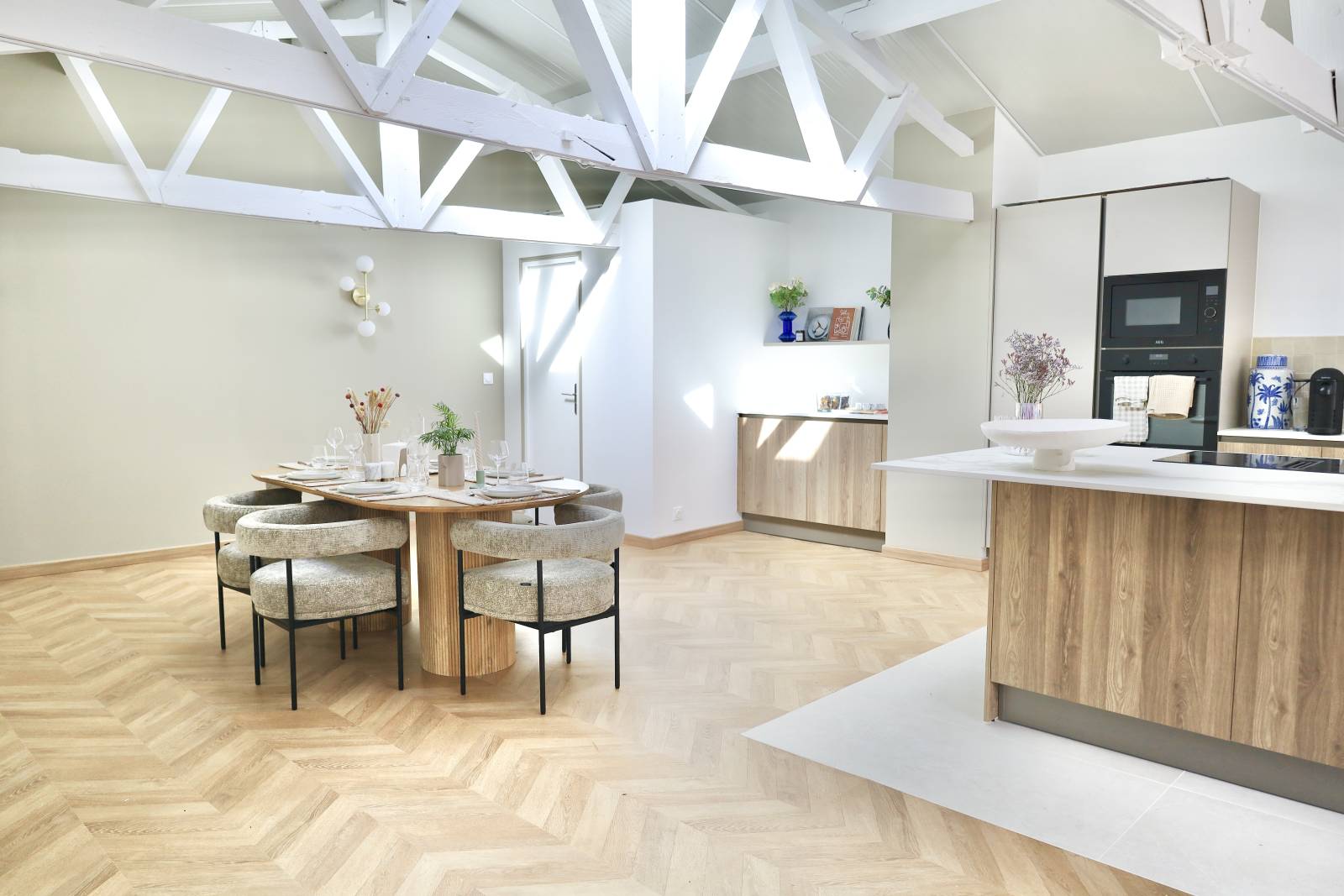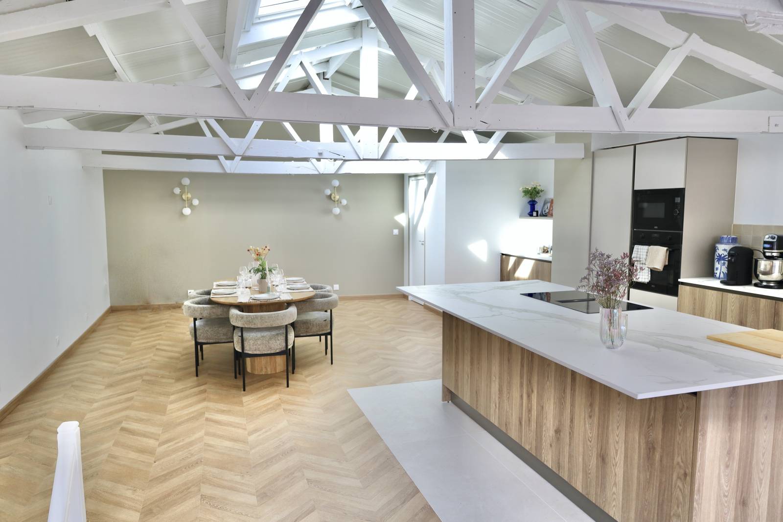 La cuisine se compose de plusieurs zones dédiées, incluant un coin cuisson, un espace de préparation, et une salle à manger très cosy avec poutres apparentes et décoration design pour les moments de partage.