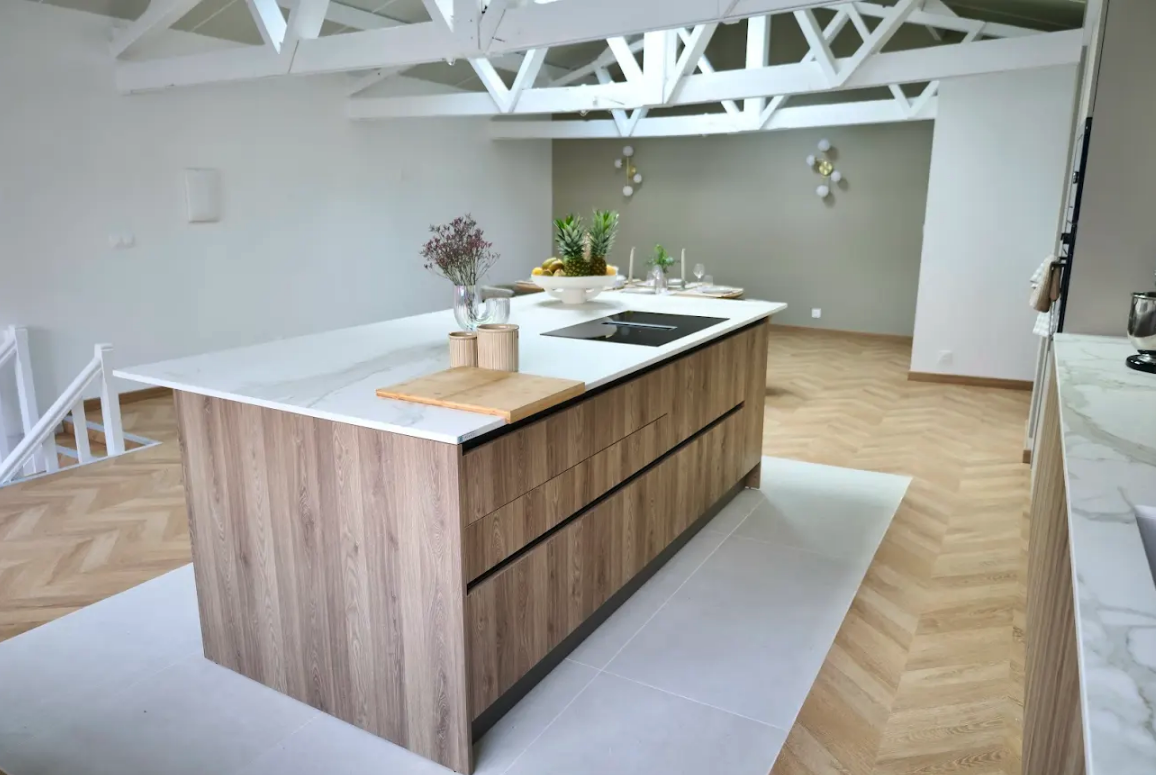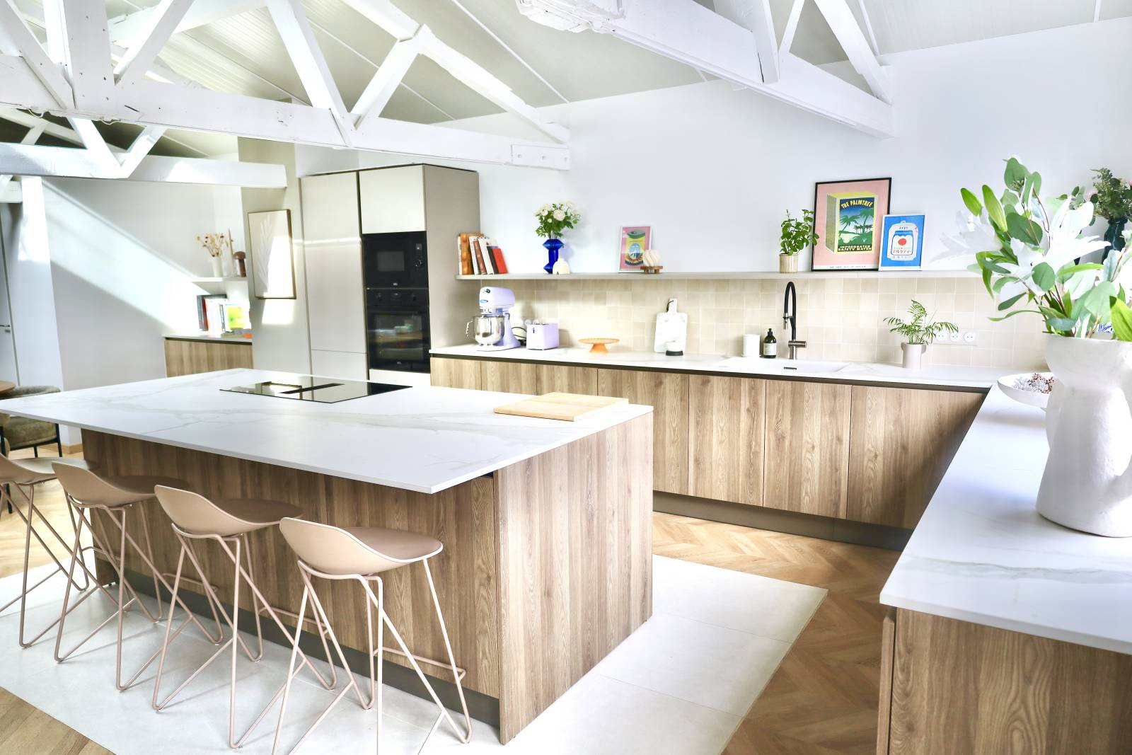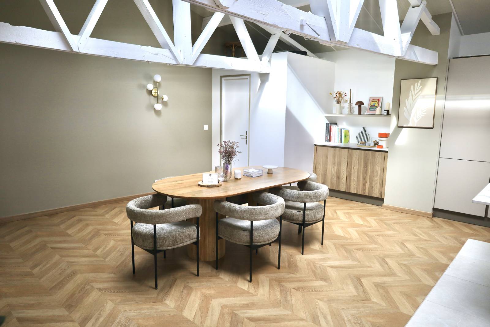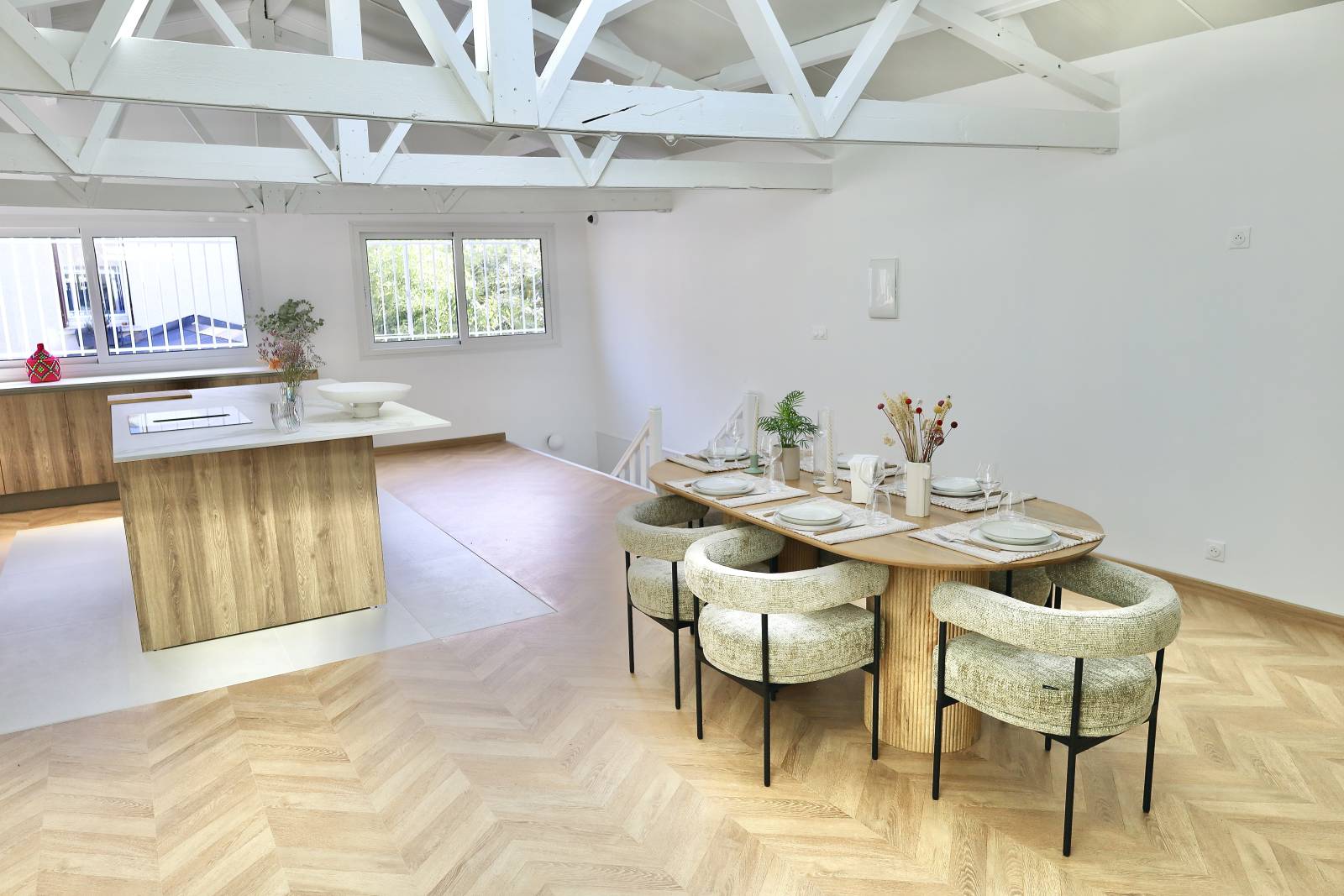 La cuisine se compose de plusieurs zones dédiées, incluant un coin cuisson, un espace de préparation, et une salle à manger très cosy avec poutres apparentes et décoration design pour les moments de partage.