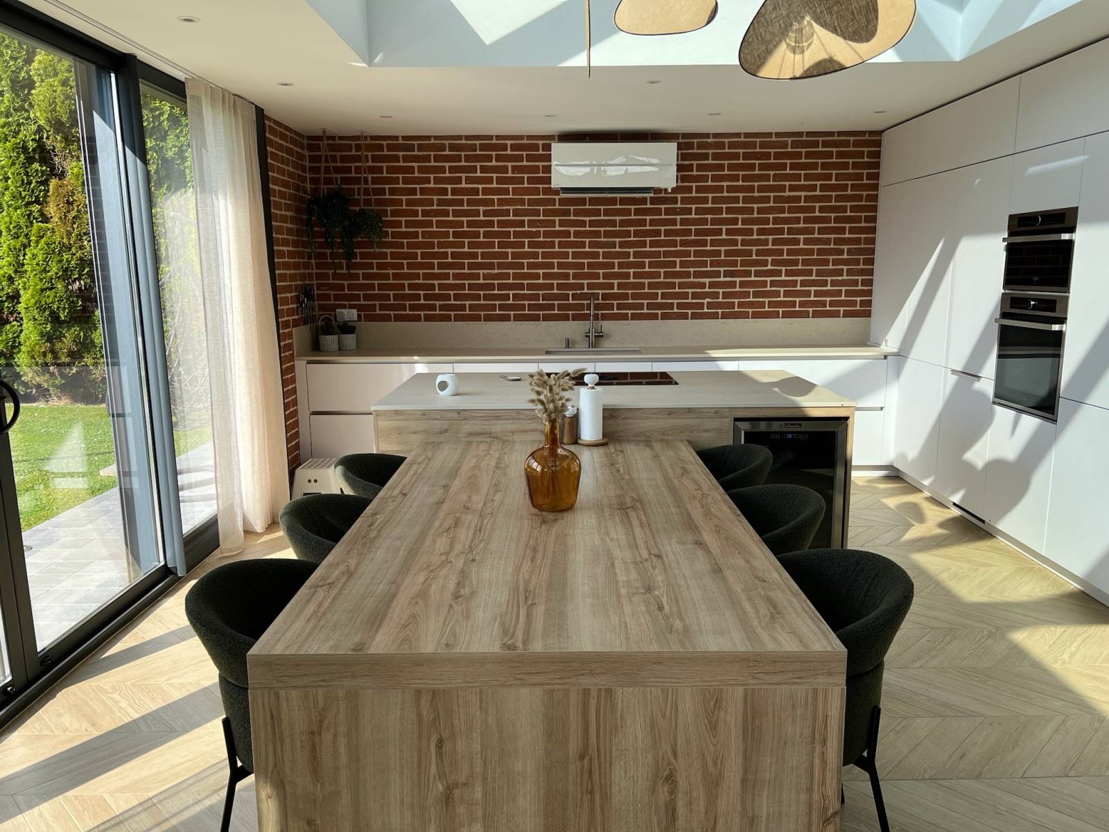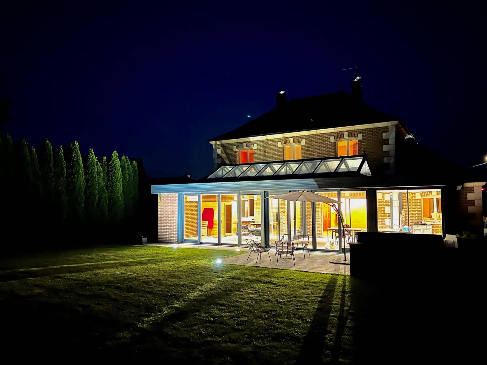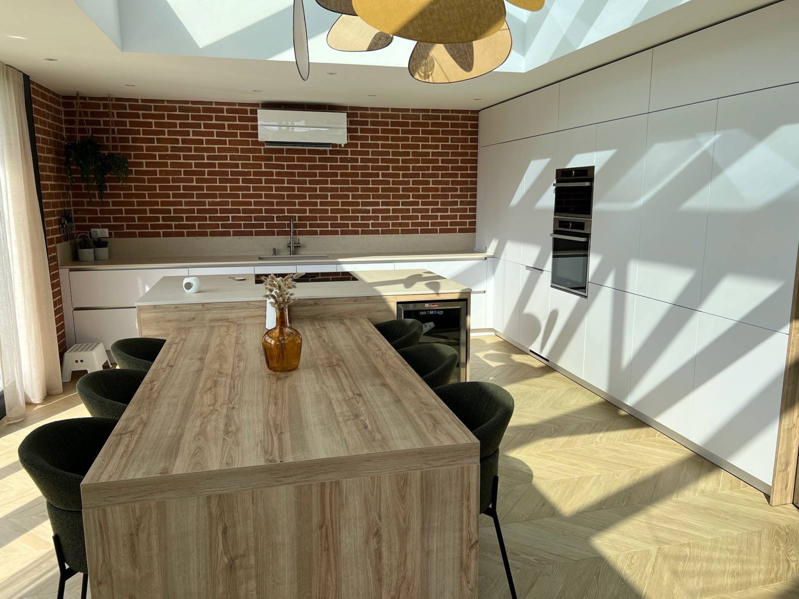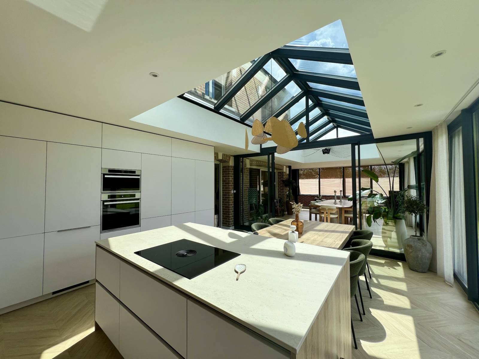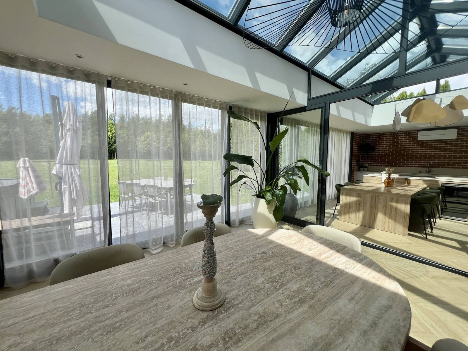 Bénéficiant d'une cuisine/salle à manger baignant dans la lumière grâce à une grande verrière. Cet espace ouvert et contemporain est parfait pour des ambiances conviviales et créatives. Les grandes baies vitrées offrent une vue imprenable sur le jardin, créant une atmosphère apaisante et inspirante.