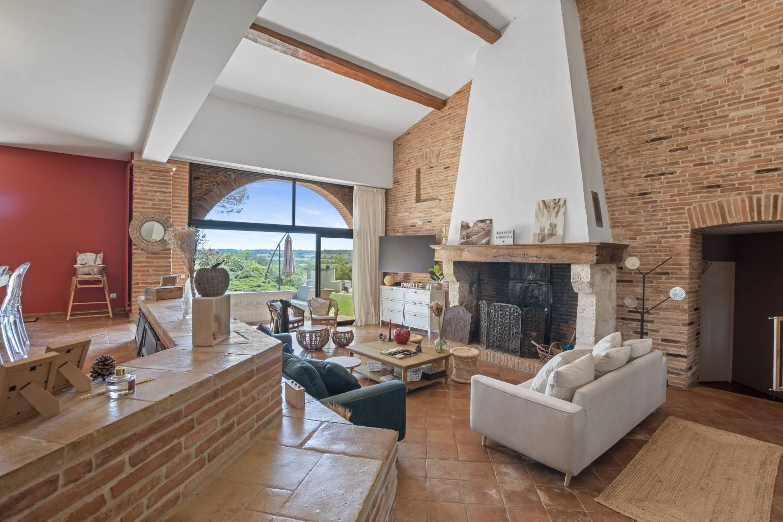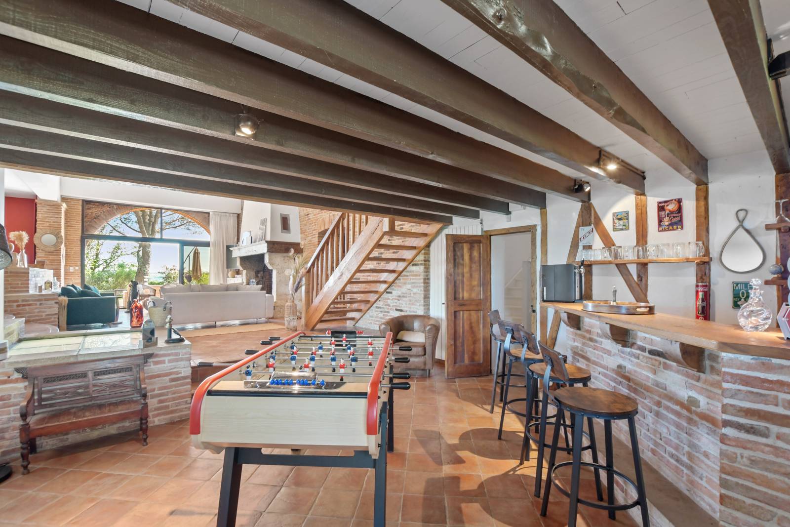 Son bel espace séjour avec cheminée ancienne, sa salle à manger attenante et son espace bar sont ouverts sur les extérieurs et seront des endroits cosy et très lumineux qui permettrons de multiples ambiances pour vos productions.