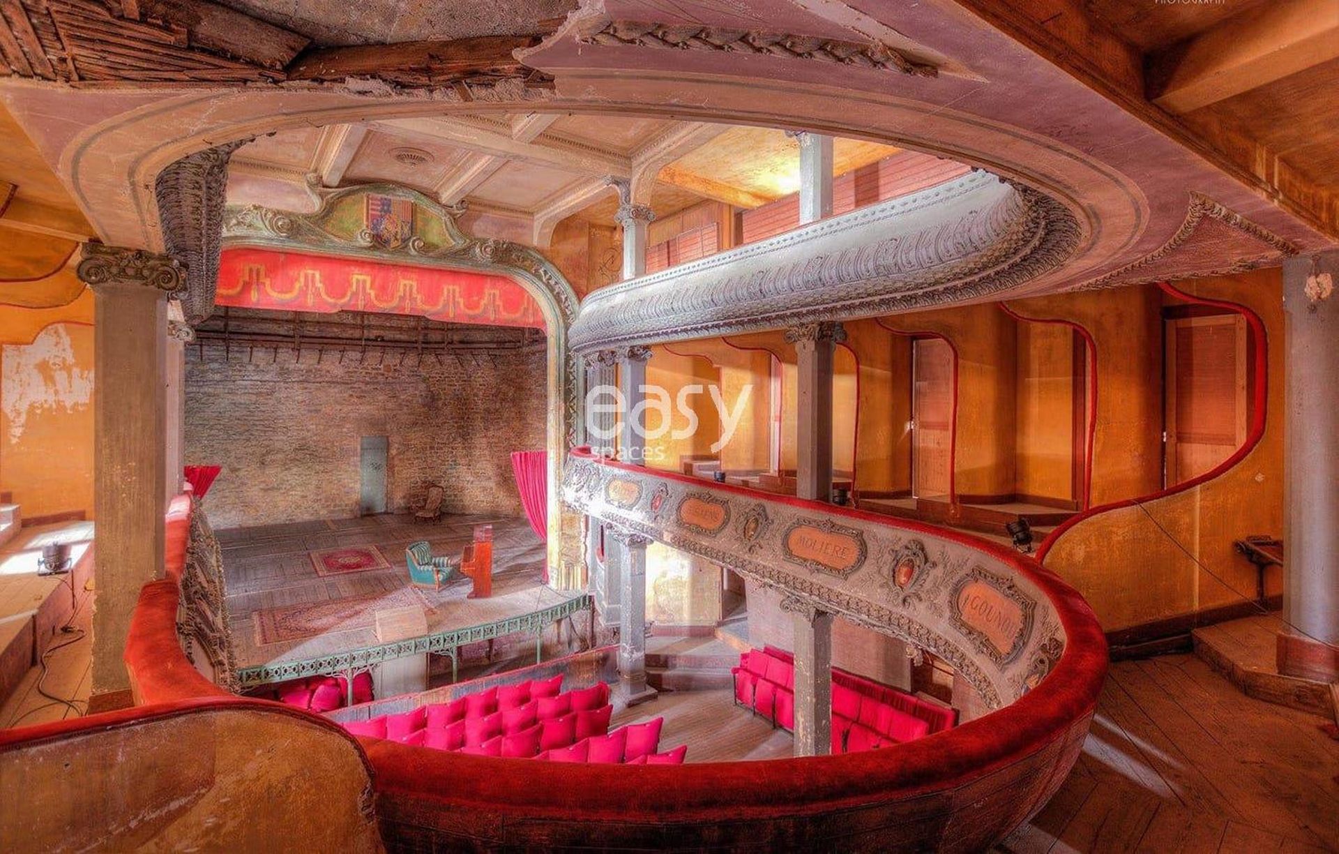 Ici, le temps semble figé, les murs murmurent encore les répliques d’antan, les fauteuils rouges fanés font écho à un glorieux passé scénique. Les balcons incurvés, les moulures rococo, les rideaux de velours, les dorures écaillées et les traces d’usure racontent une histoire authentique, vibrante, unique.