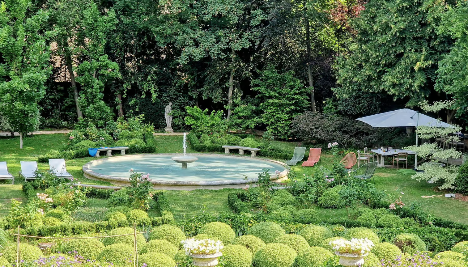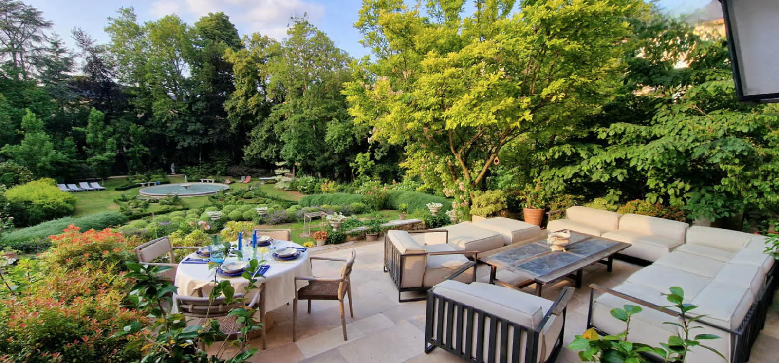 À l’extérieur, un jardin à la française de 2 000 m² sublime et très arboré; il sera idéal pour un shooting champêtre et bucolique à Paris. De plus, sa belle terrasse et sa cuisine extérieure seront aussi de jolis espaces inspirants pour votre production.