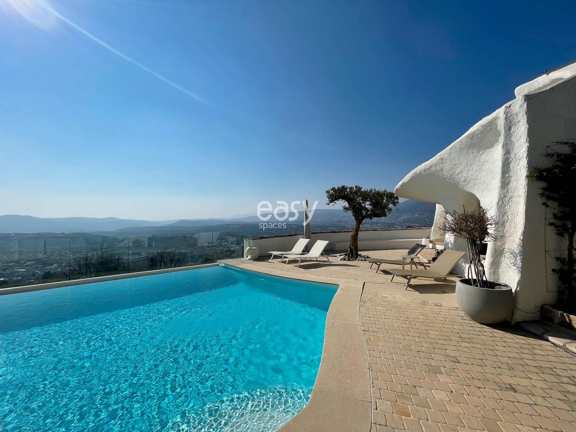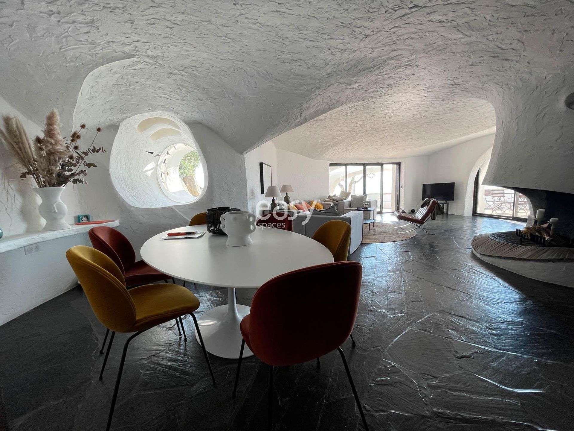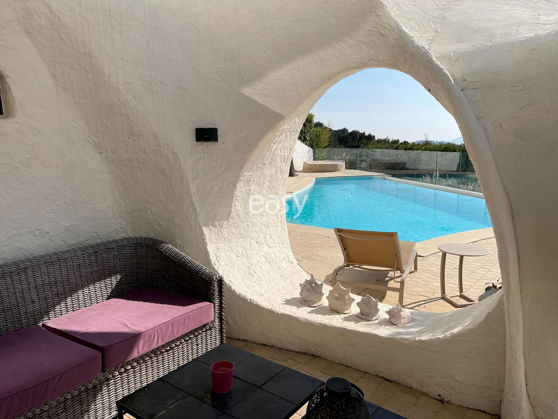 Ce superbe décor atypique possède un grand espace séjour lumineux, avec vue sur les alentours et la piscine. De plus, ses exterieurs avec la terrasse avec une vue panoramique et les multiples recoins de cette maison si spéciale sont autant de lieux de shooting originaux.
