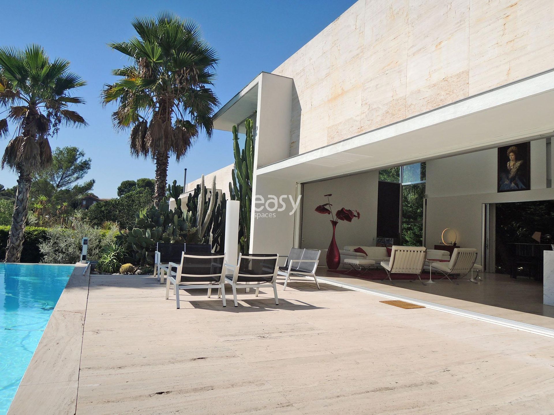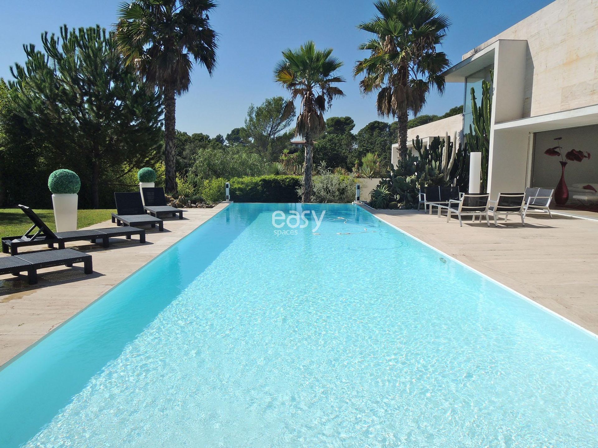 Très belle maison Contemporaine en location pour productions photographiques, tournages et événements professionnels à proximité de Cannes sur la Riviera Française et en région Provence alpes côte d' azur. Cette villa d'architecte offre une piscine à débordement, de grands espaces intérieurs très lumineux, une décoration design et épurée, ainsi qu'une large terrasse et un magnifique gazon, parfaits pour un événement pro.
