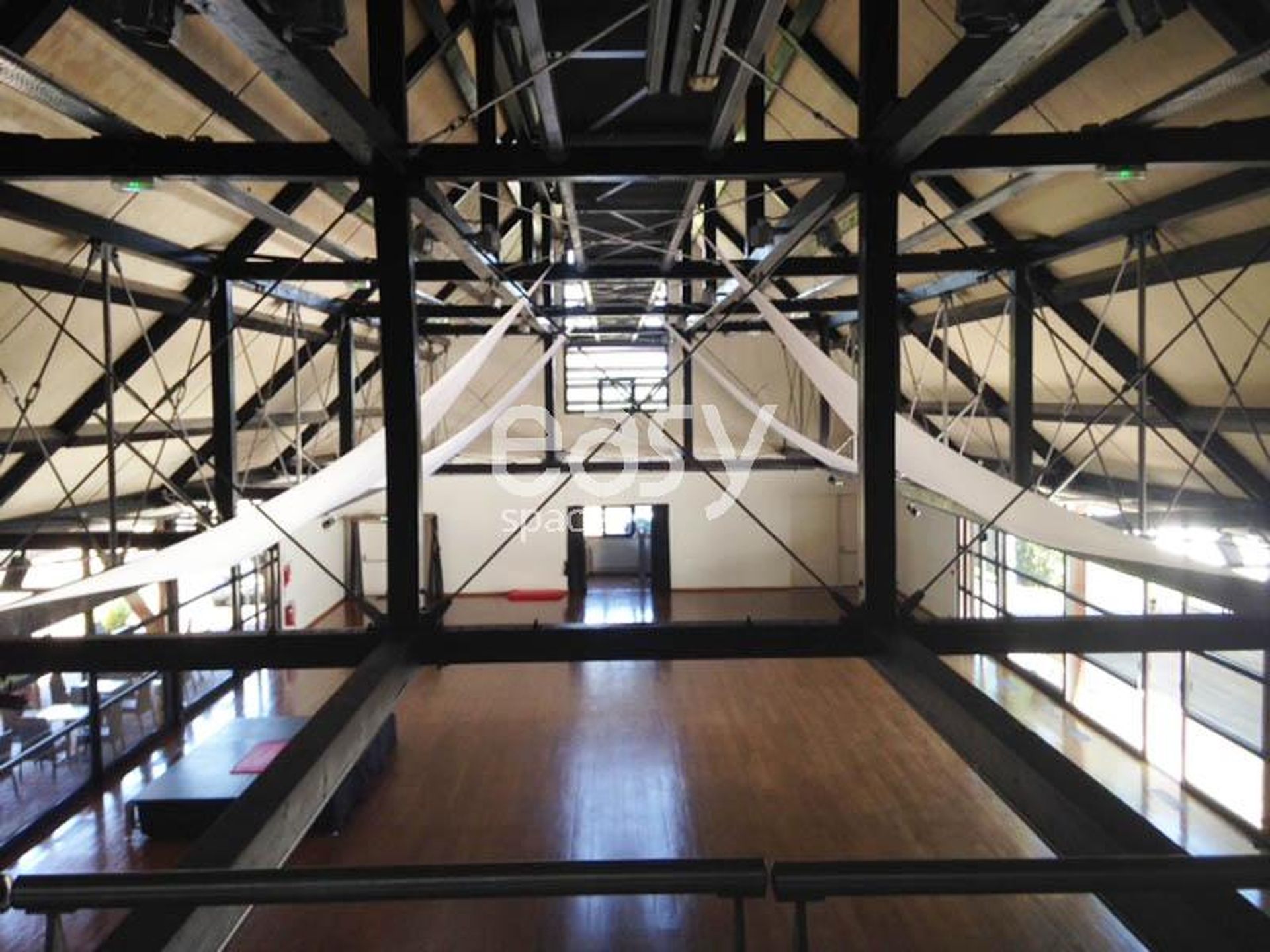 Hauteur sous plafond impressionnante, valorisée par une charpente métallique élégante