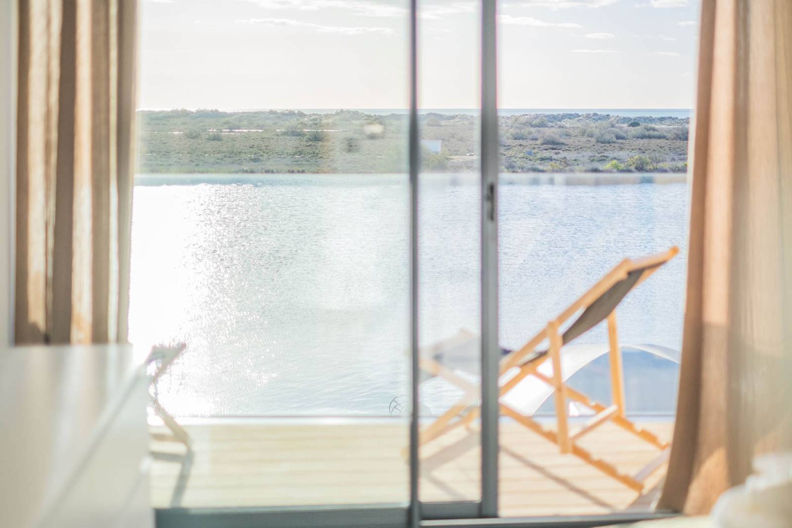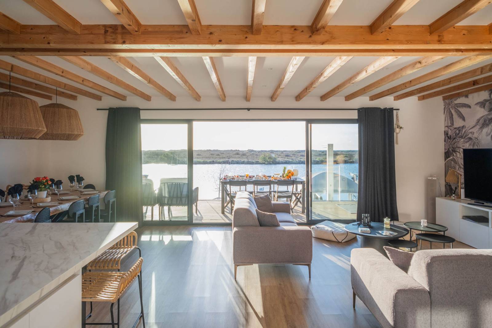 Cet espace de vie s’ouvre entièrement sur l’extérieur, offrant une vue imprenable sur la plage et l’horizon.