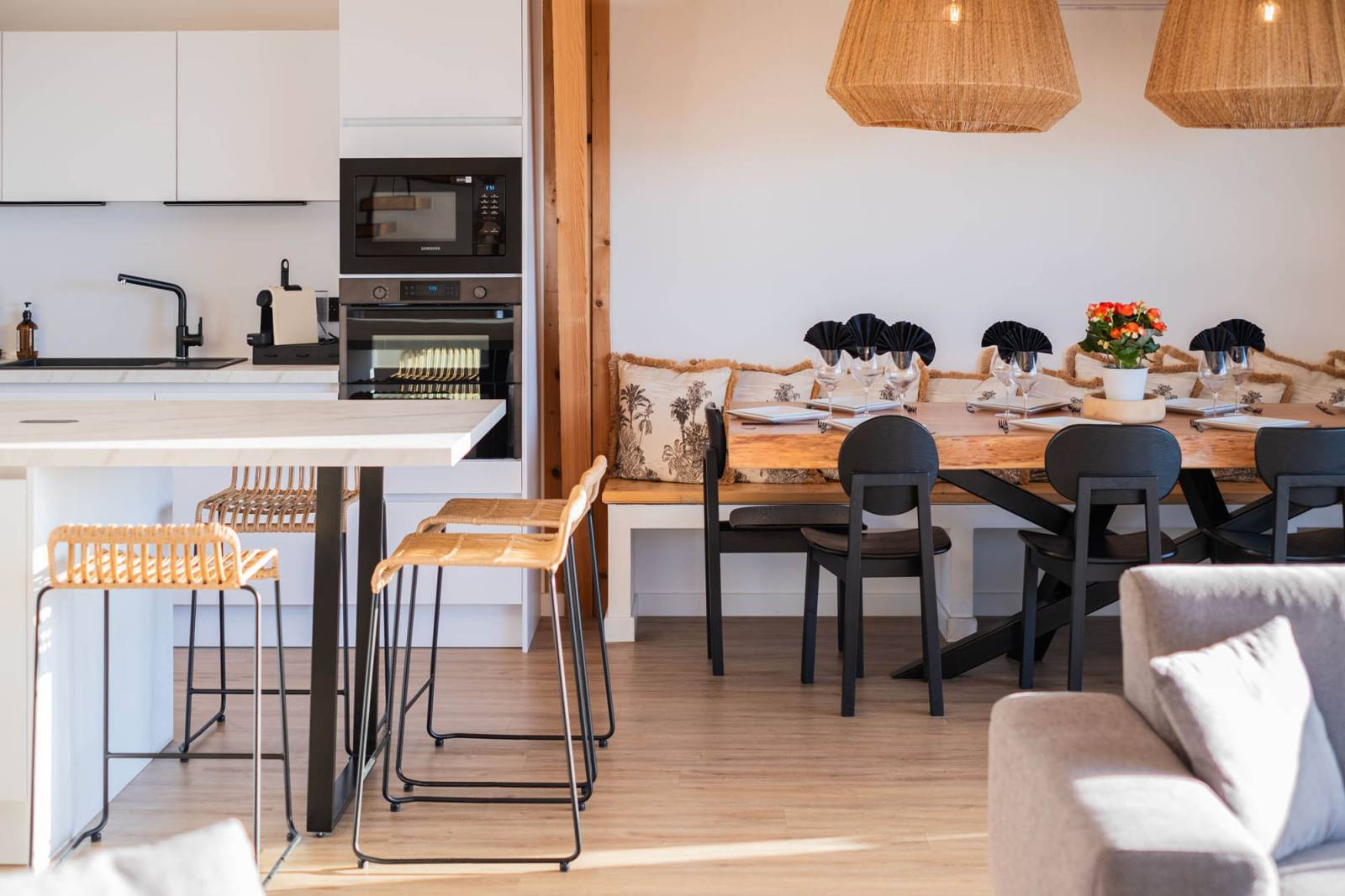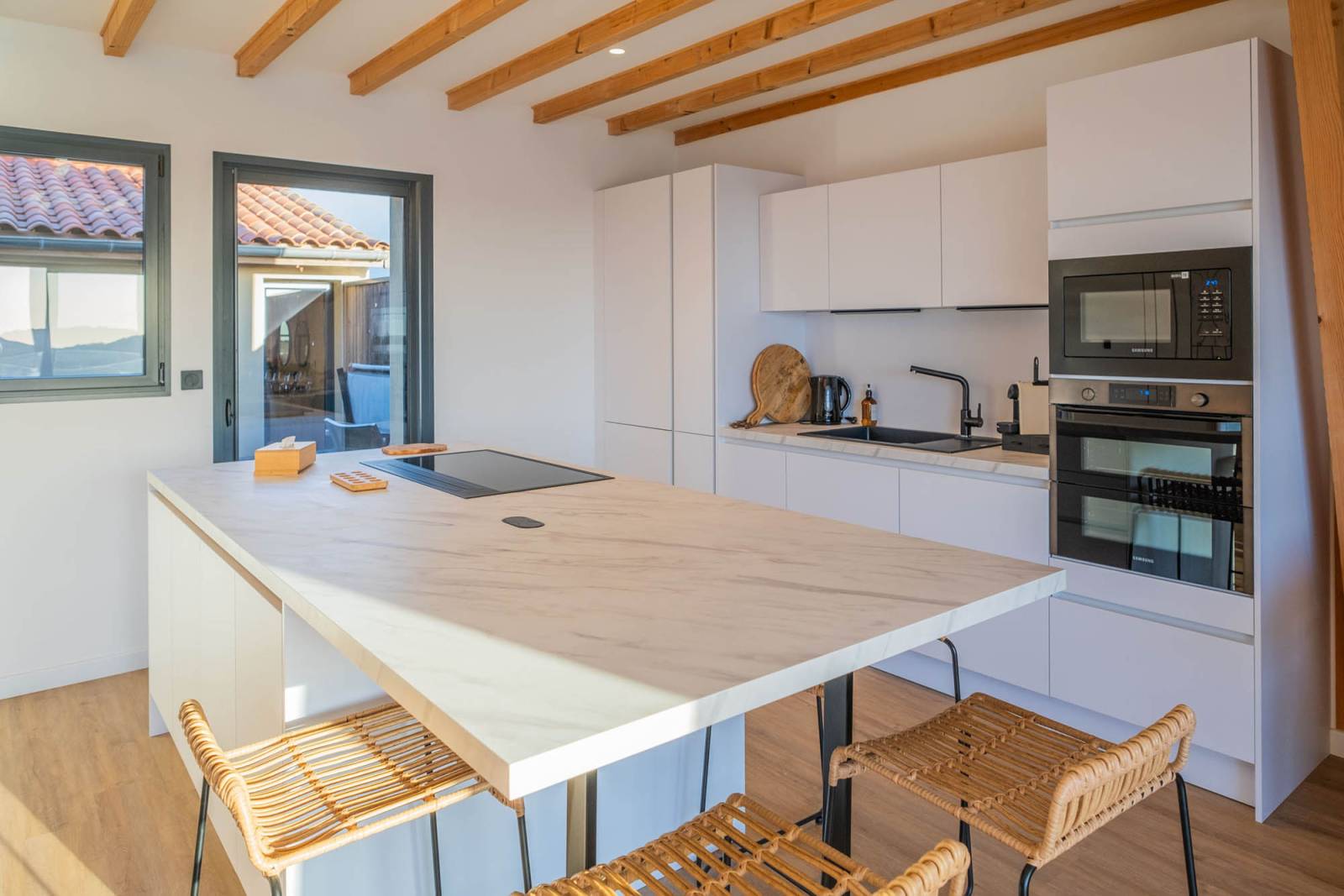 La cuisine ouverte, ultra moderne et parfaitement équipée, s’intègre harmonieusement à l’espace de vie, facilitant les prises de vue ou lancement de produit.