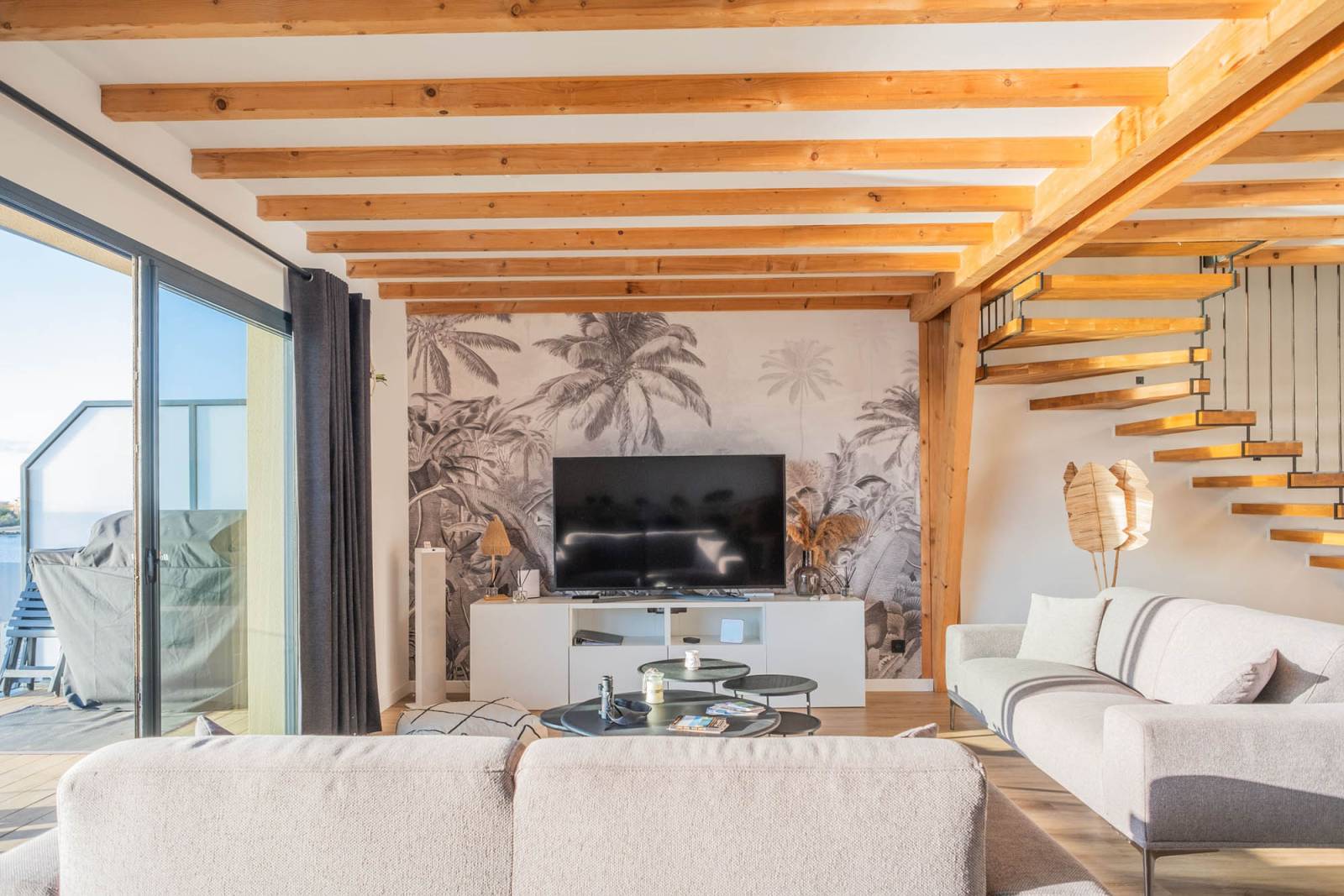 Dès l’entrée, on est frappé par l’ampleur du grand séjour traversant, baigné de lumière naturelle grâce à de vastes baies vitrées toute hauteur.