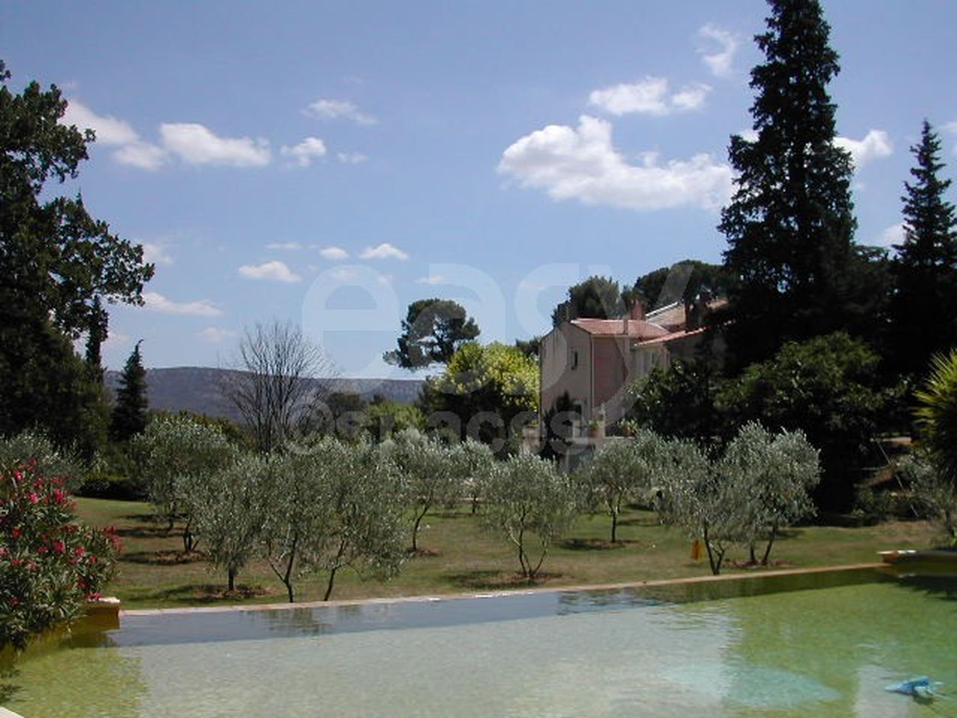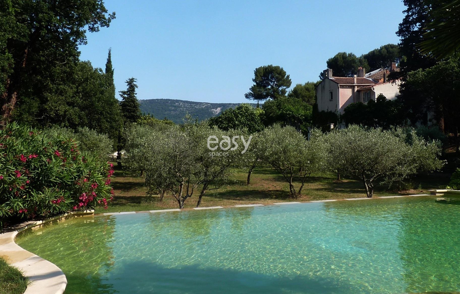 Bassin naturel et piscine aux reflets émeraude, avec vue dégagée sur les champs d’oliviers