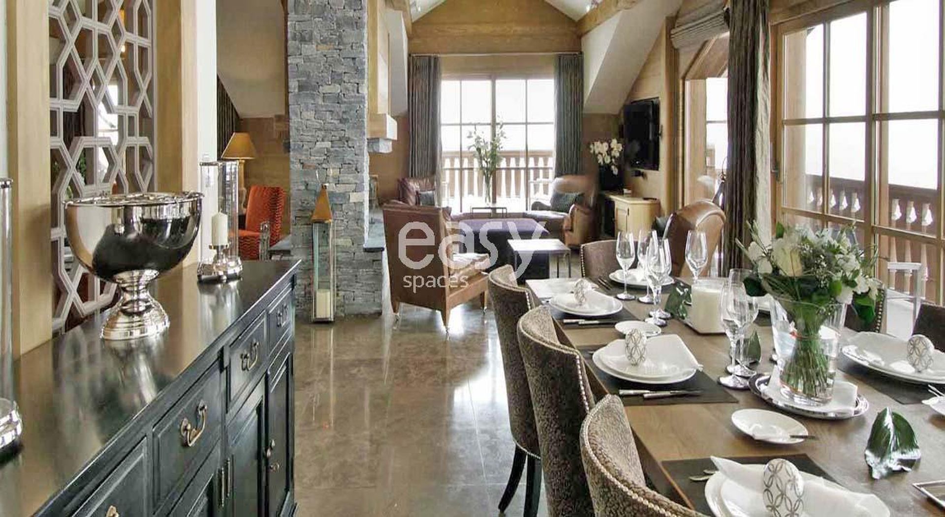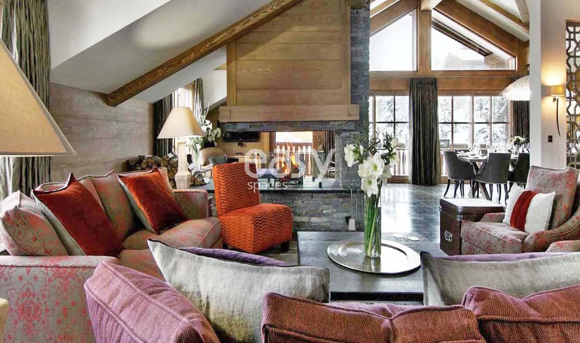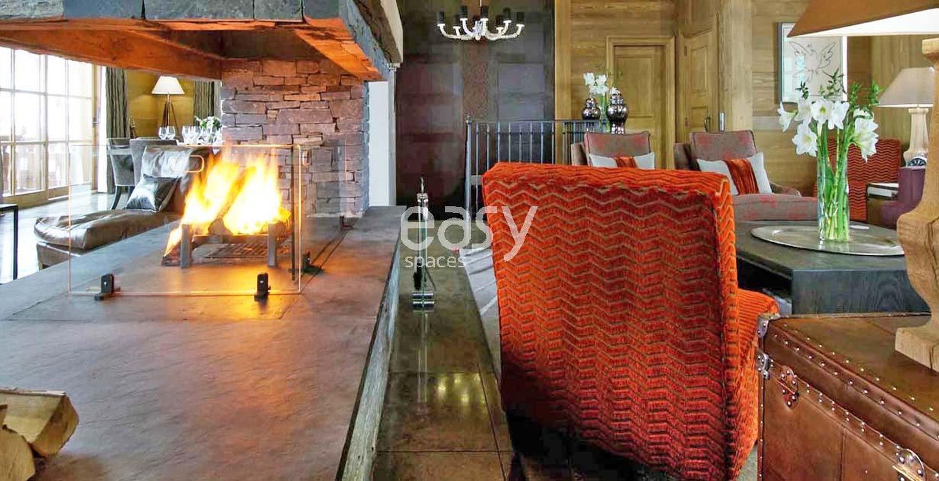 Ce très beau décor possède un séjour avec cheminée, de beaux volumes intérieurs et une belle luminosité, le tout dans une ambiance chaleureuse et moderne idéale pour des prises de vues photos pour un catalogue de décoration par exemple où pour un tournage de film.