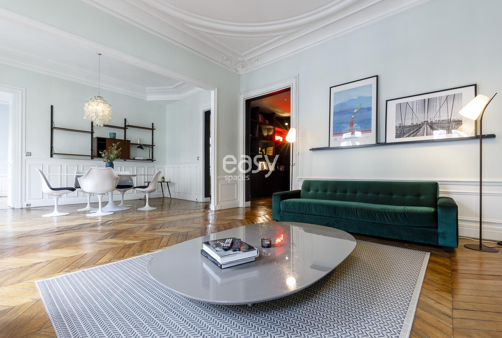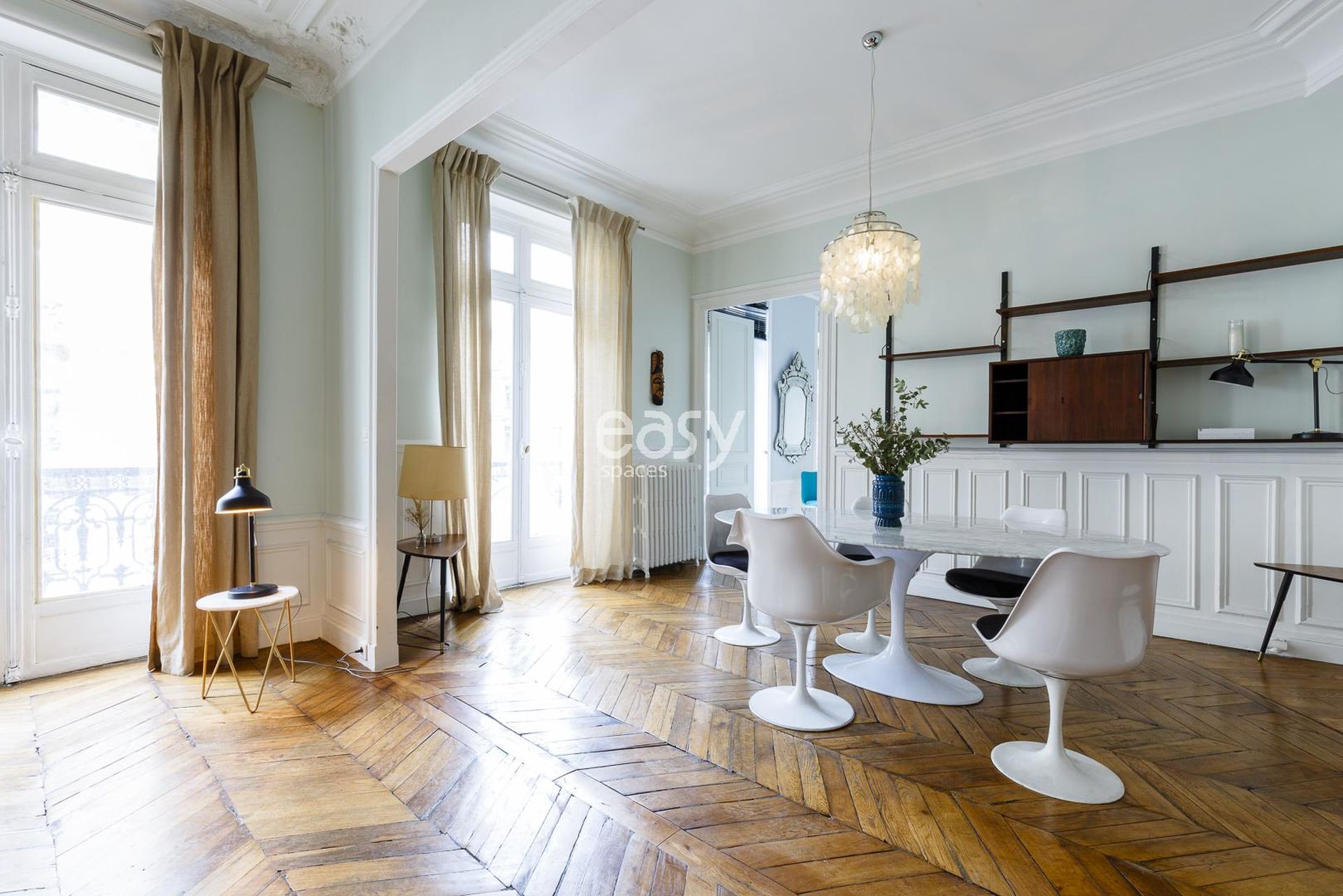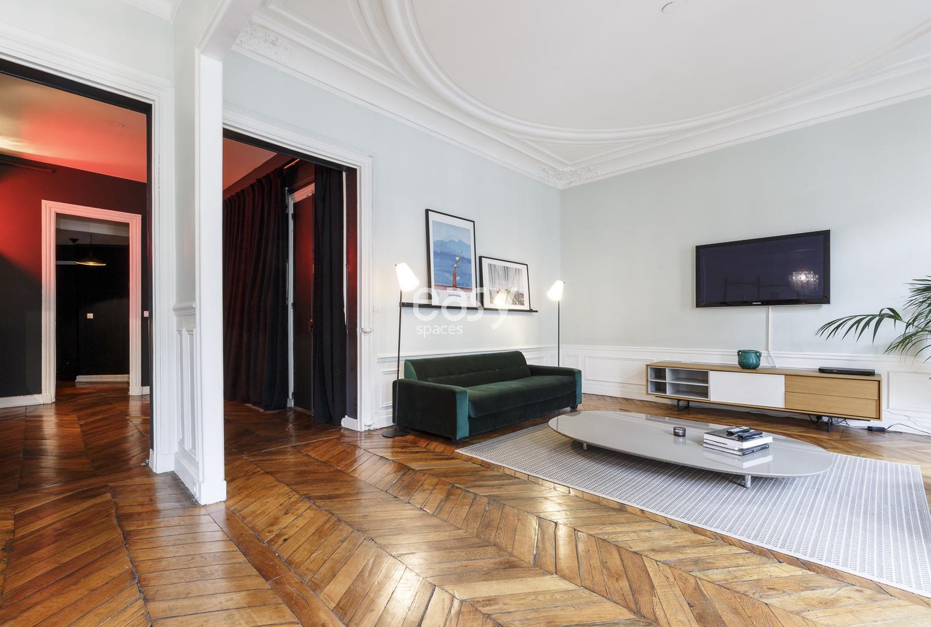 Découvrez notre bel appartement lumineux de 300m2, avec une décoration moderne inspirée des années 70, parquet chevrons, et moulures. Idéal pour shootings, tournages, ou événements professionnels en centre de Paris.