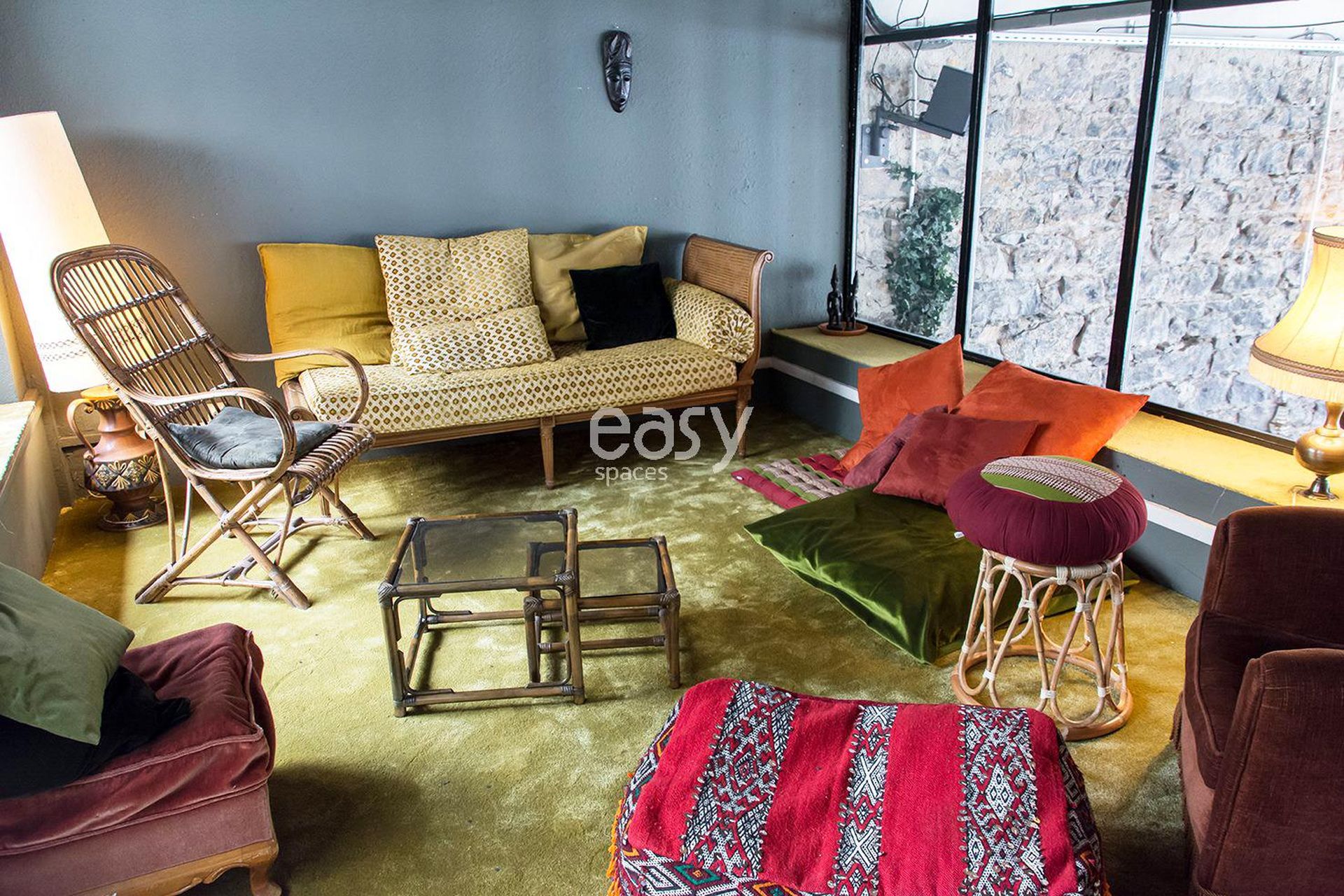 L'espace principal conjugue raffinement vintage et fonctionnalité contemporaine. Les canapés en cuir cognac côtoient des fauteuils aux lignes seventies, créant cette atmosphère si recherchée par les directeurs artistiques et les agences de communication. Chaque recoin raconte une histoire, chaque angle offre une perspective nouvelle pour vos créations visuelles.