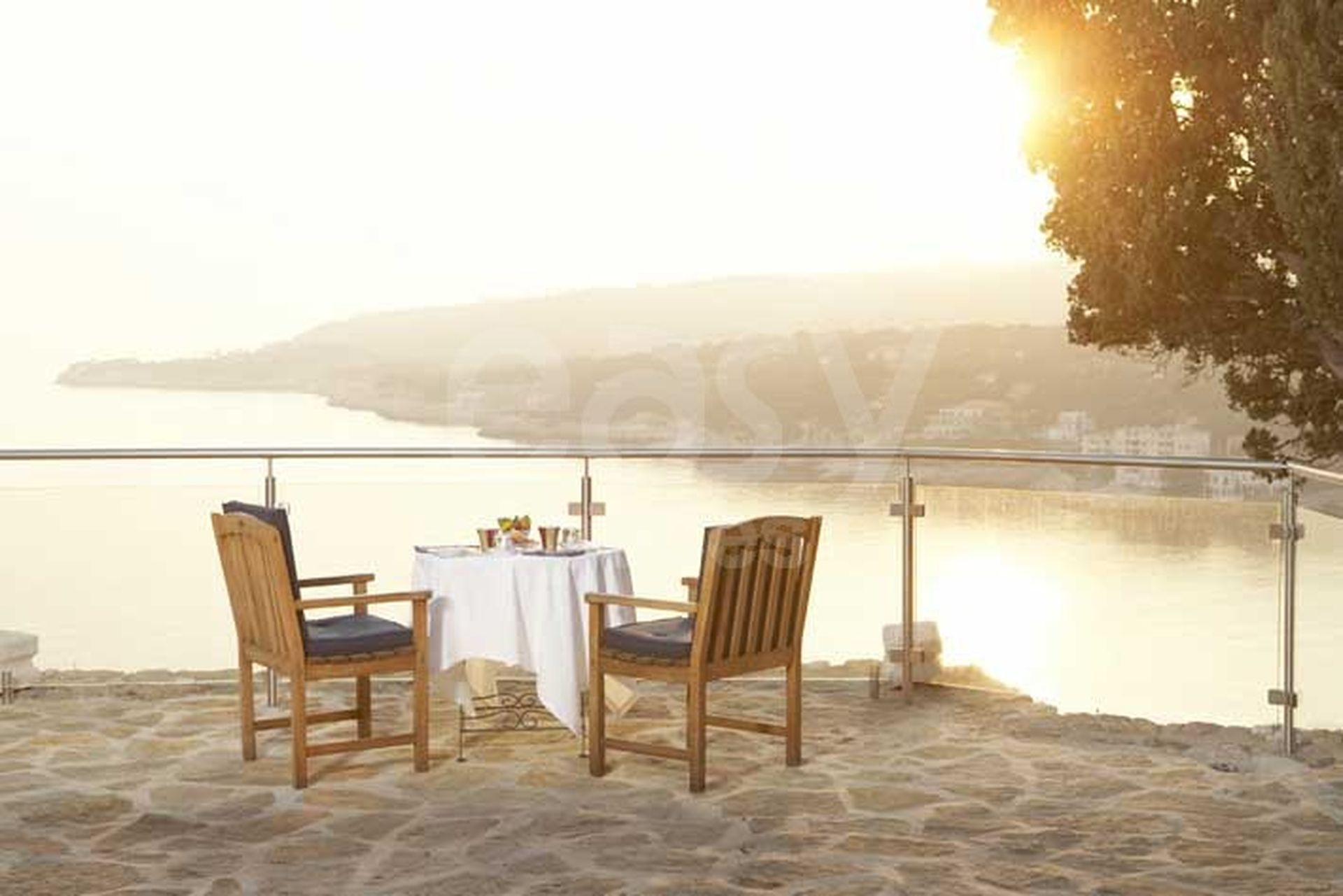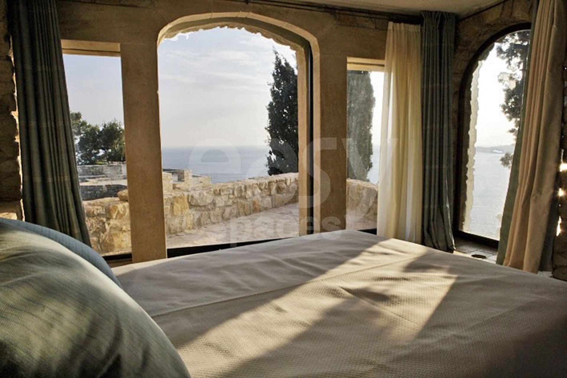 Cette demeure d’inspiration médiévale, aux murs de pierre blonde et aux arches sculptées, offre une immersion immédiate dans un décor cinématographique. Des terrasses suspendues sur la mer, une piscine en pierre bordée de cyprès, des salons voûtés baignés de lumière, des pièces meublées avec goût mêlant objets d’époque et mobilier design… Chaque recoin invite au récit, à la mise en scène, à l’inspiration.