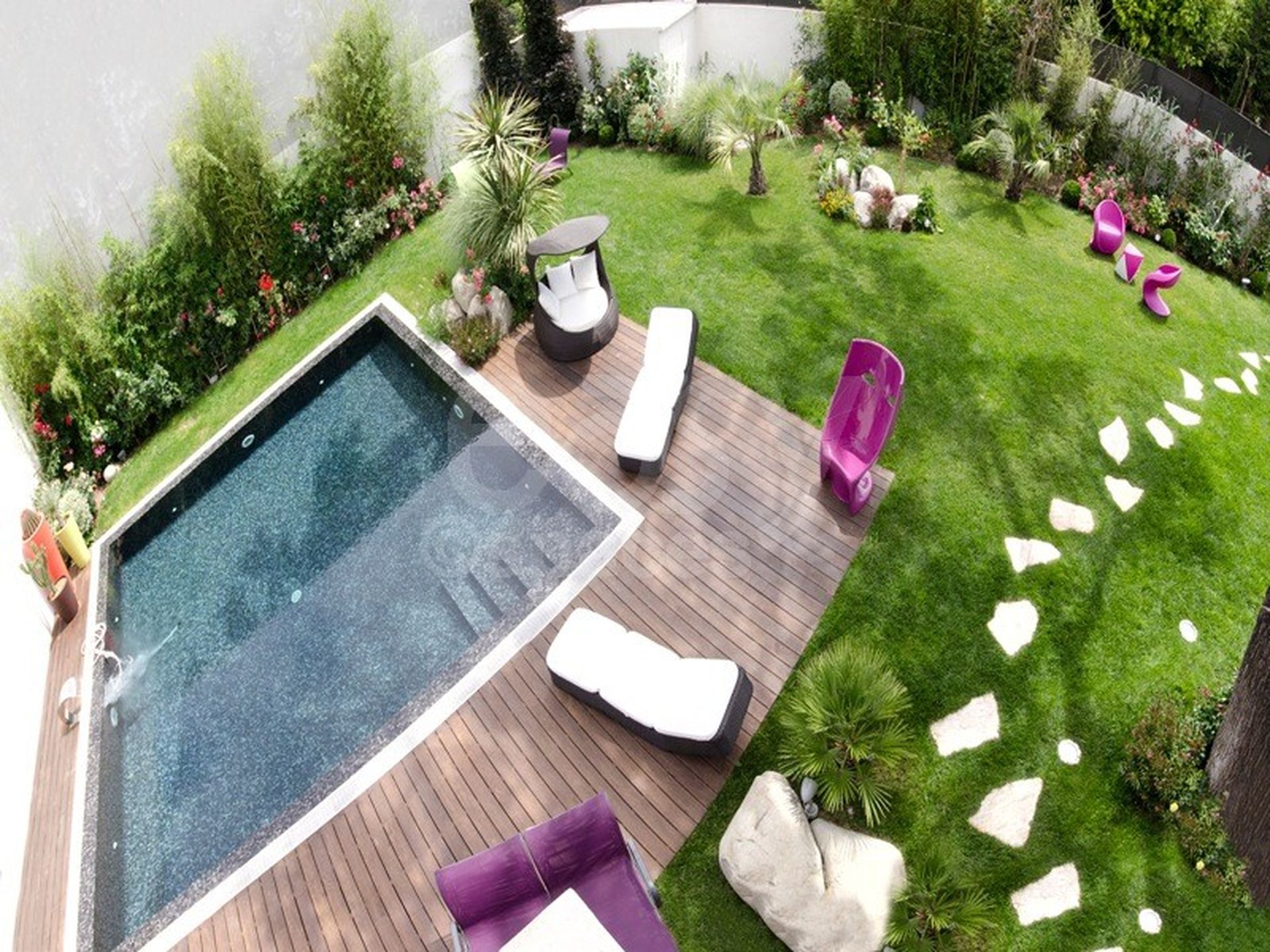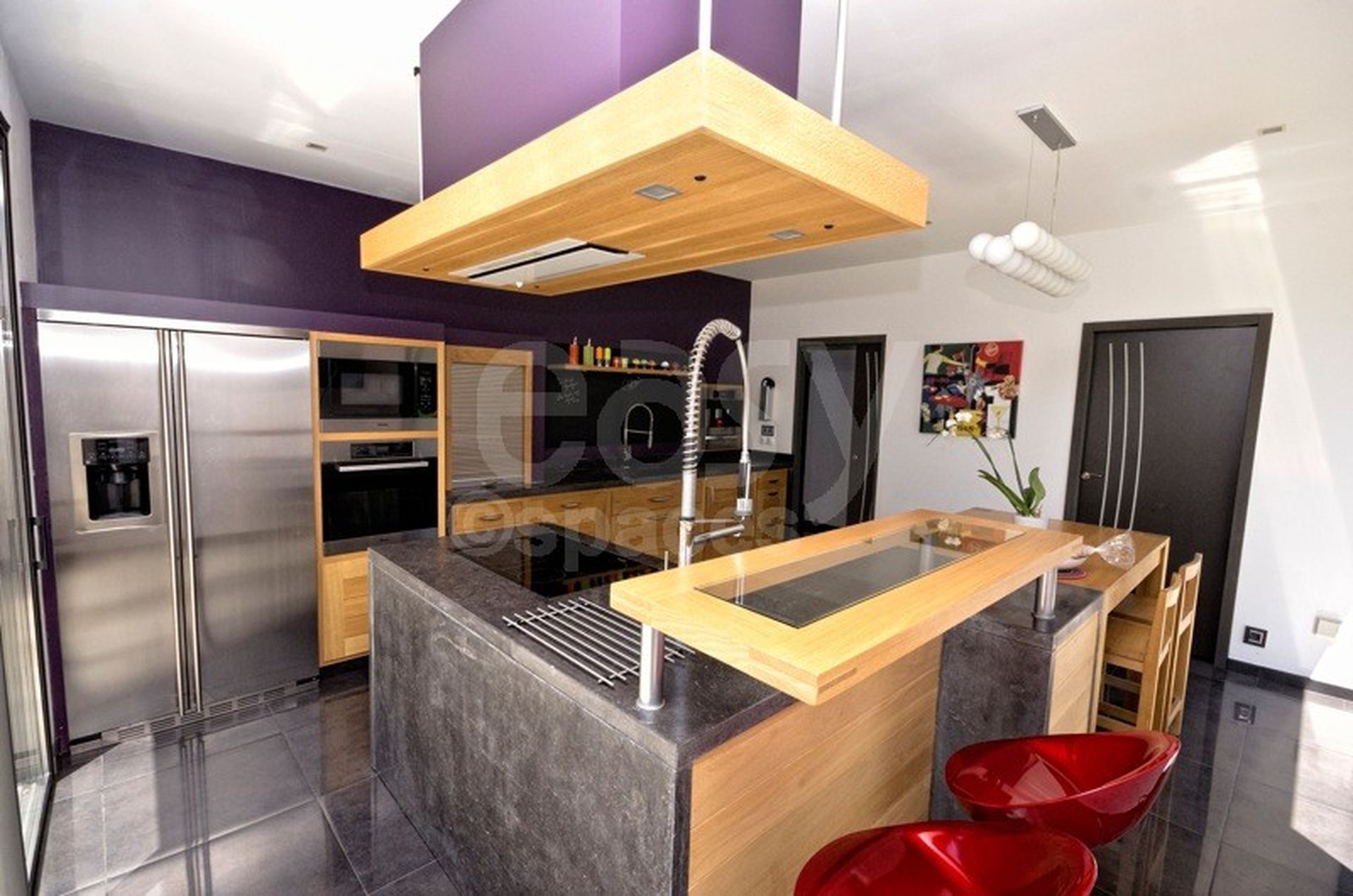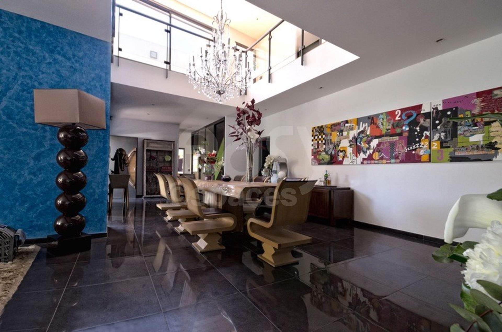 Offrant un spacieux séjour de 100m2 avec cuisine ouverte et de très belles terrasses en teck, cette demeure élégante convient parfaitement à une gamme diversifiée d'usages. Le modernisme de la piscine noire et carrée, entourée d'un jardin verdoyant, en fait un lieu atypique pour des productions artistiques ou des initiatives professionnelles.