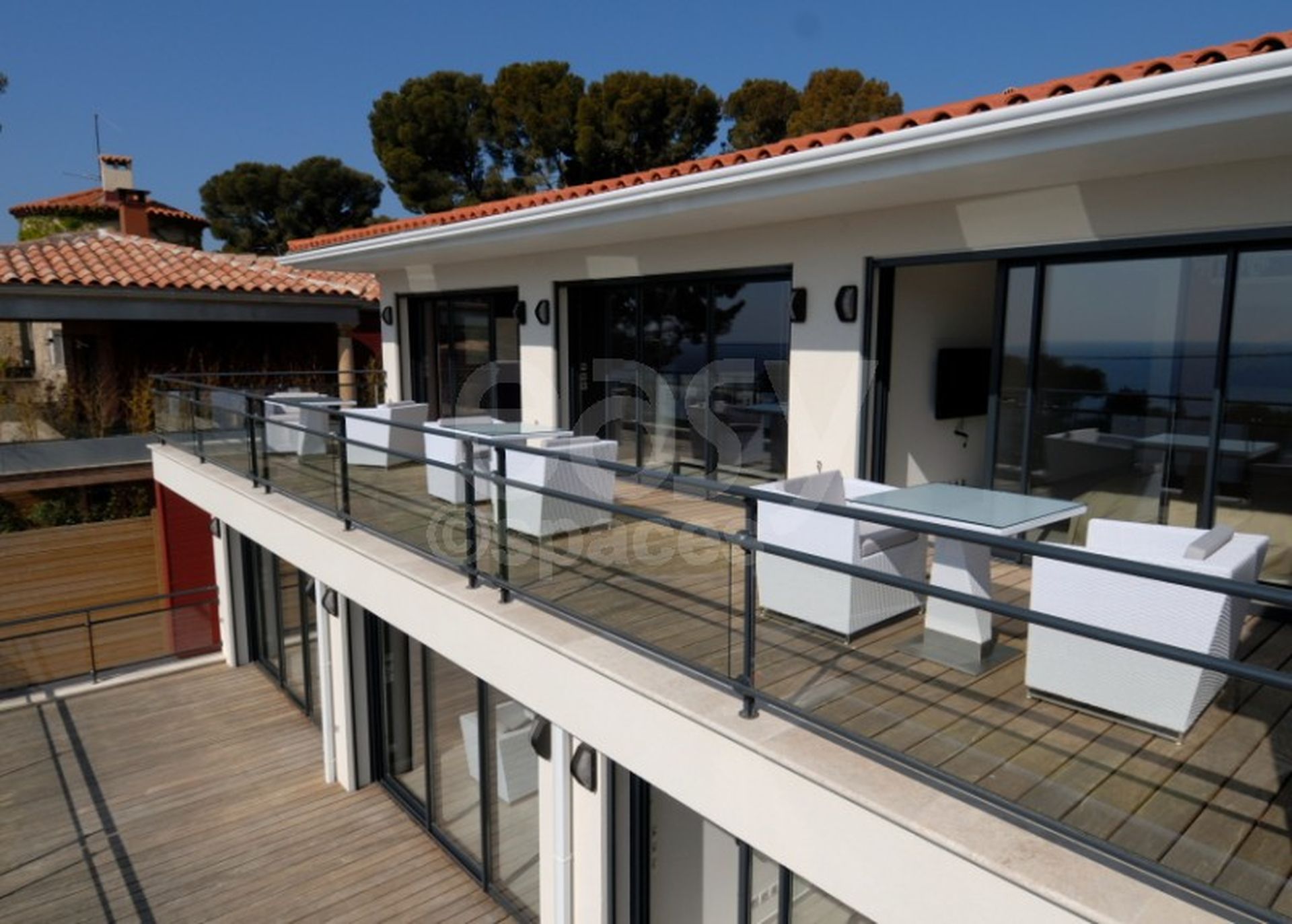 La villa dispose d'une large piscine à debordement, de grandes et larges terrasses en teck, d'une vue mer, et de nombreuses chambres pouvant accueillir les équipes de prises de vues ou de tournages.