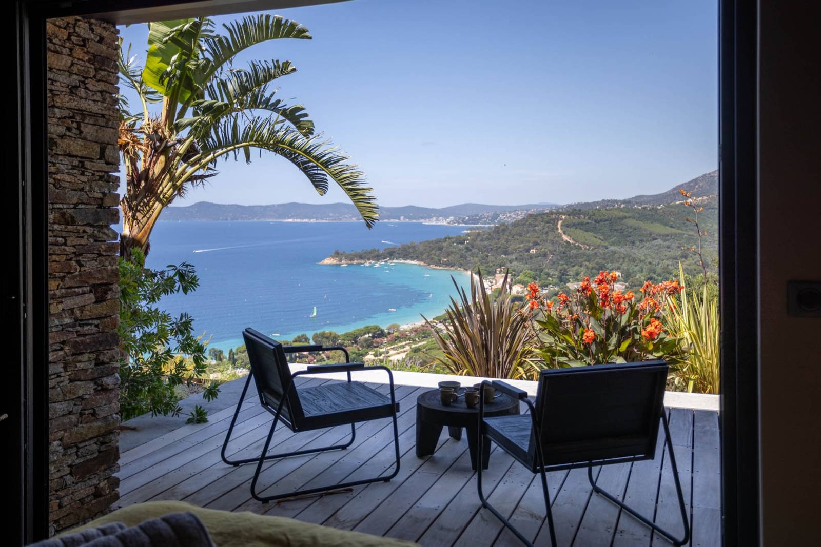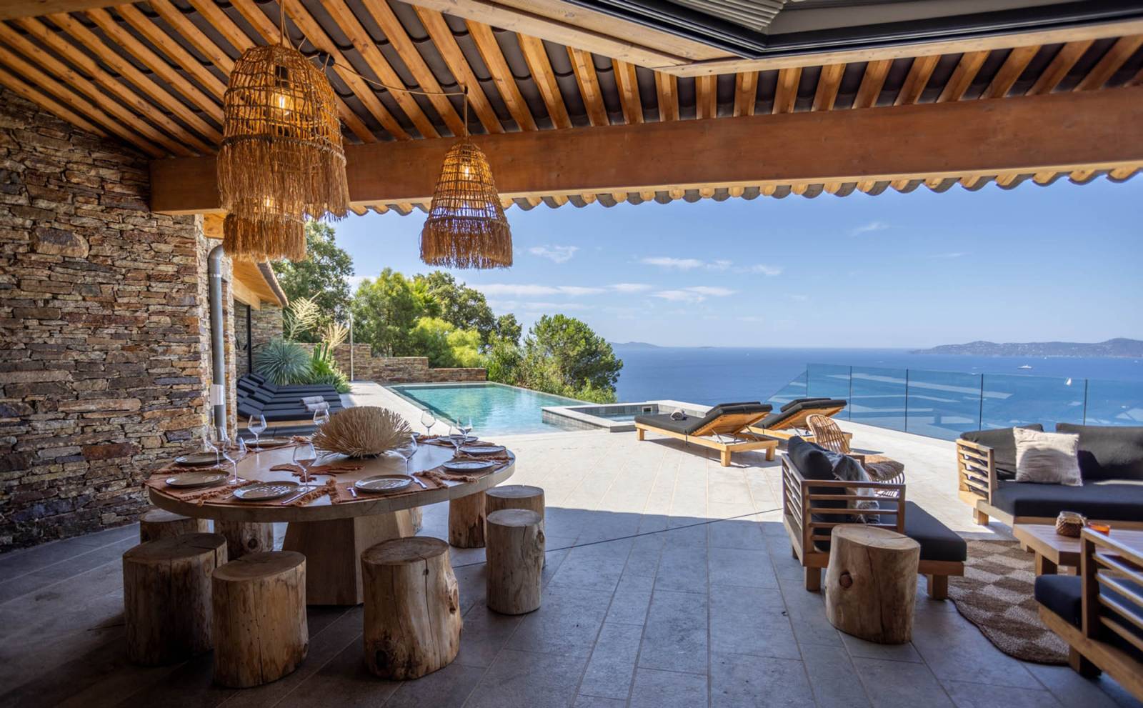 À deux pas de Saint-Tropez, cette villa contemporaine vue mer pour shooting photo et tournage en pierre naturelle, nichée sur les hauteurs du Lavandou, offre un décor sensationnel, littéralement tourné vers la mer.