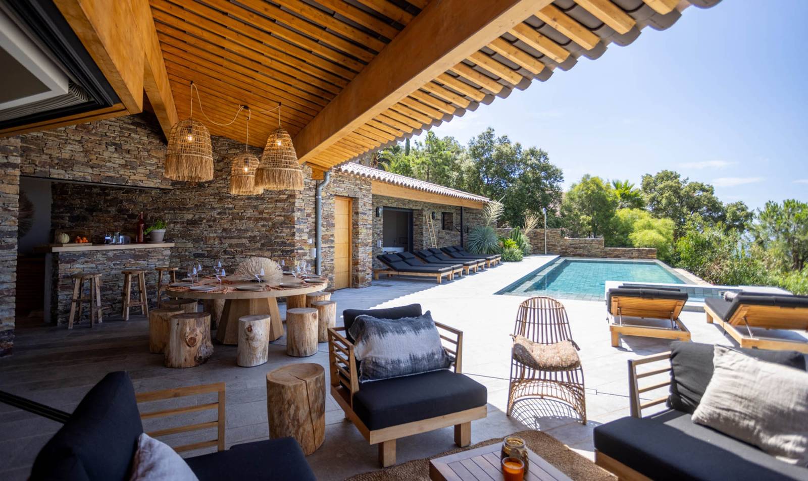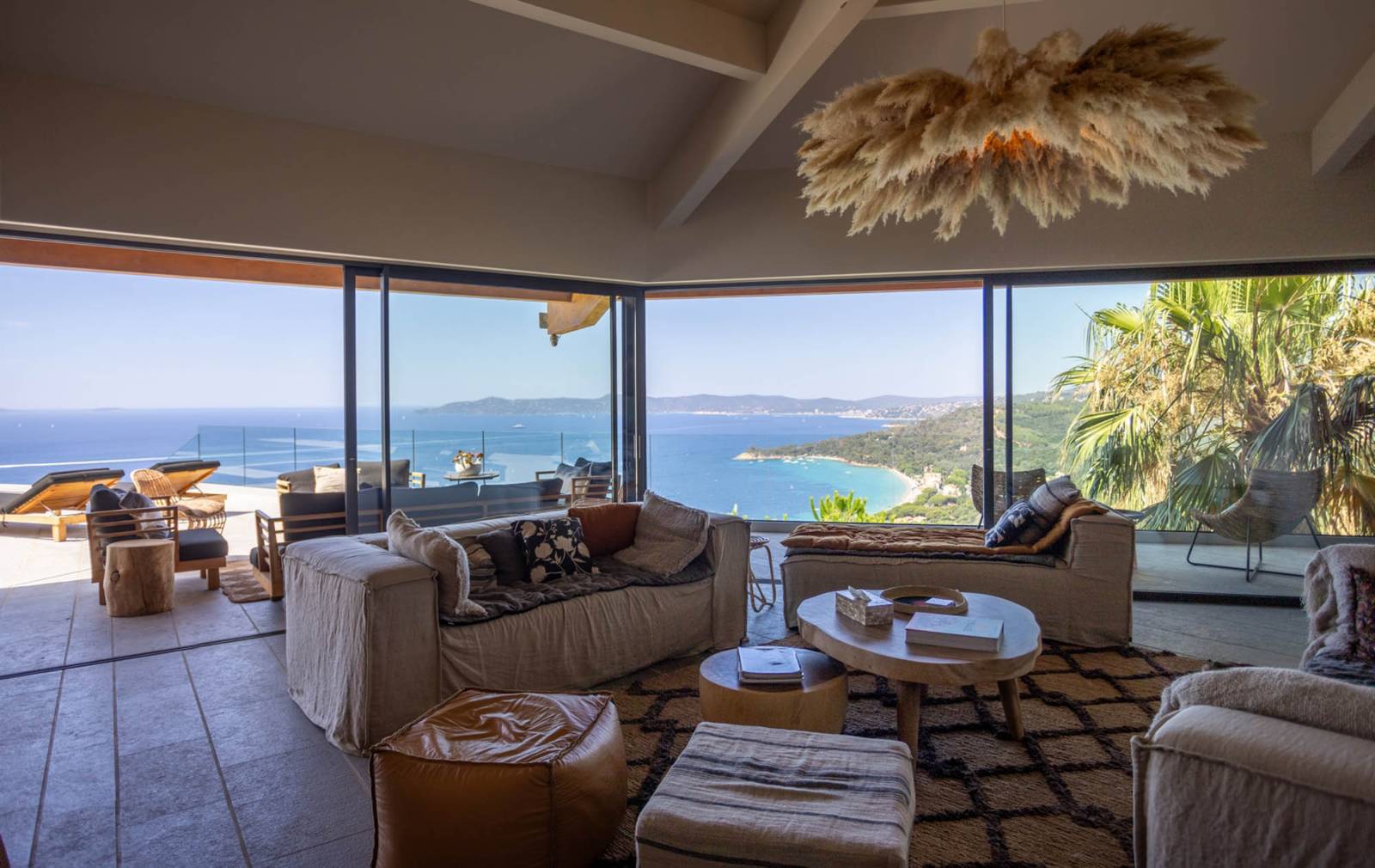 Le séjour lumineux, prolongé par une grande terrasse avec piscine à débordement, crée une continuité parfaite entre intérieur et extérieur. La cuisine ouverte s’intègre discrètement au décor, idéale pour des prises de vues stylisées ou des tournages culinaires.