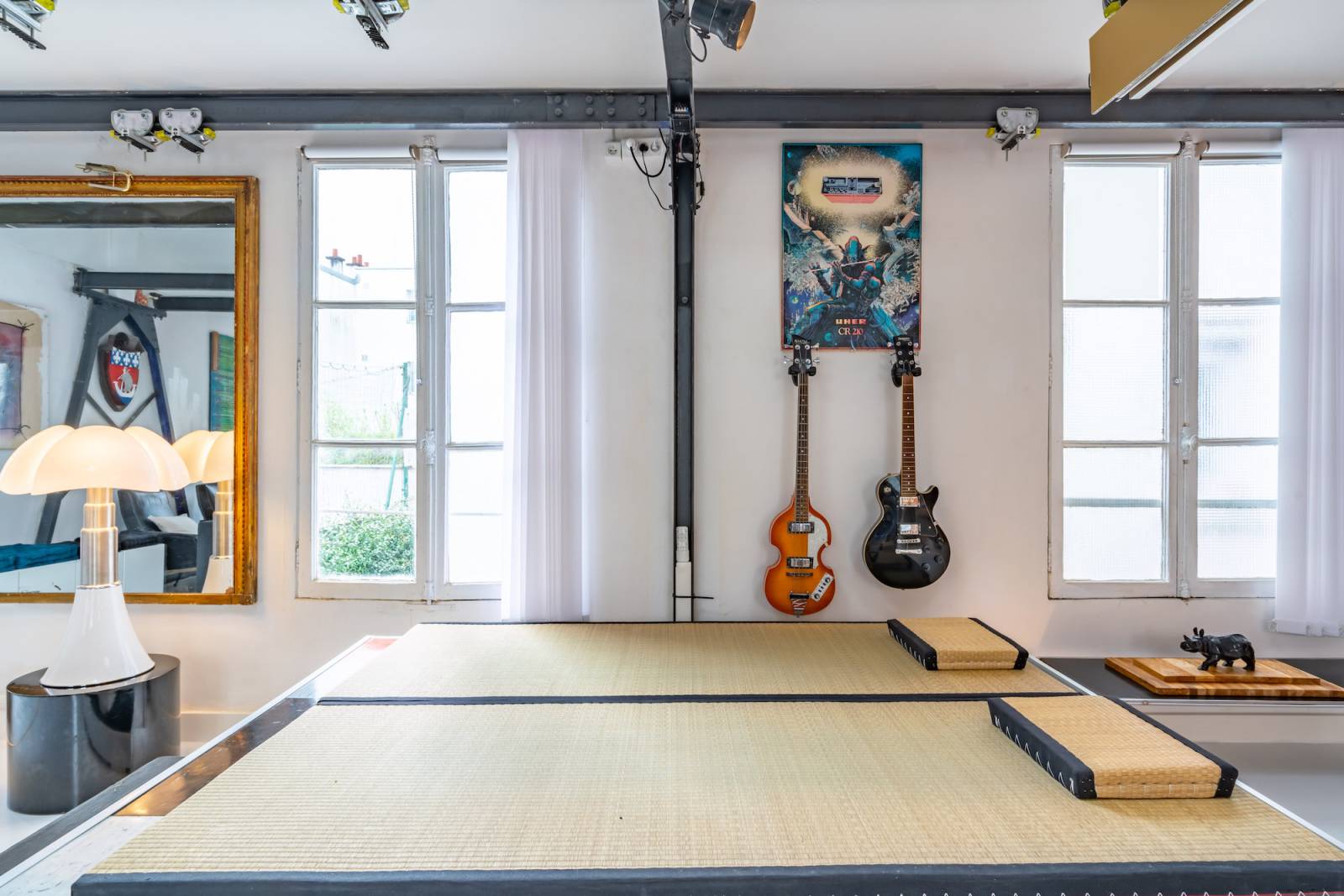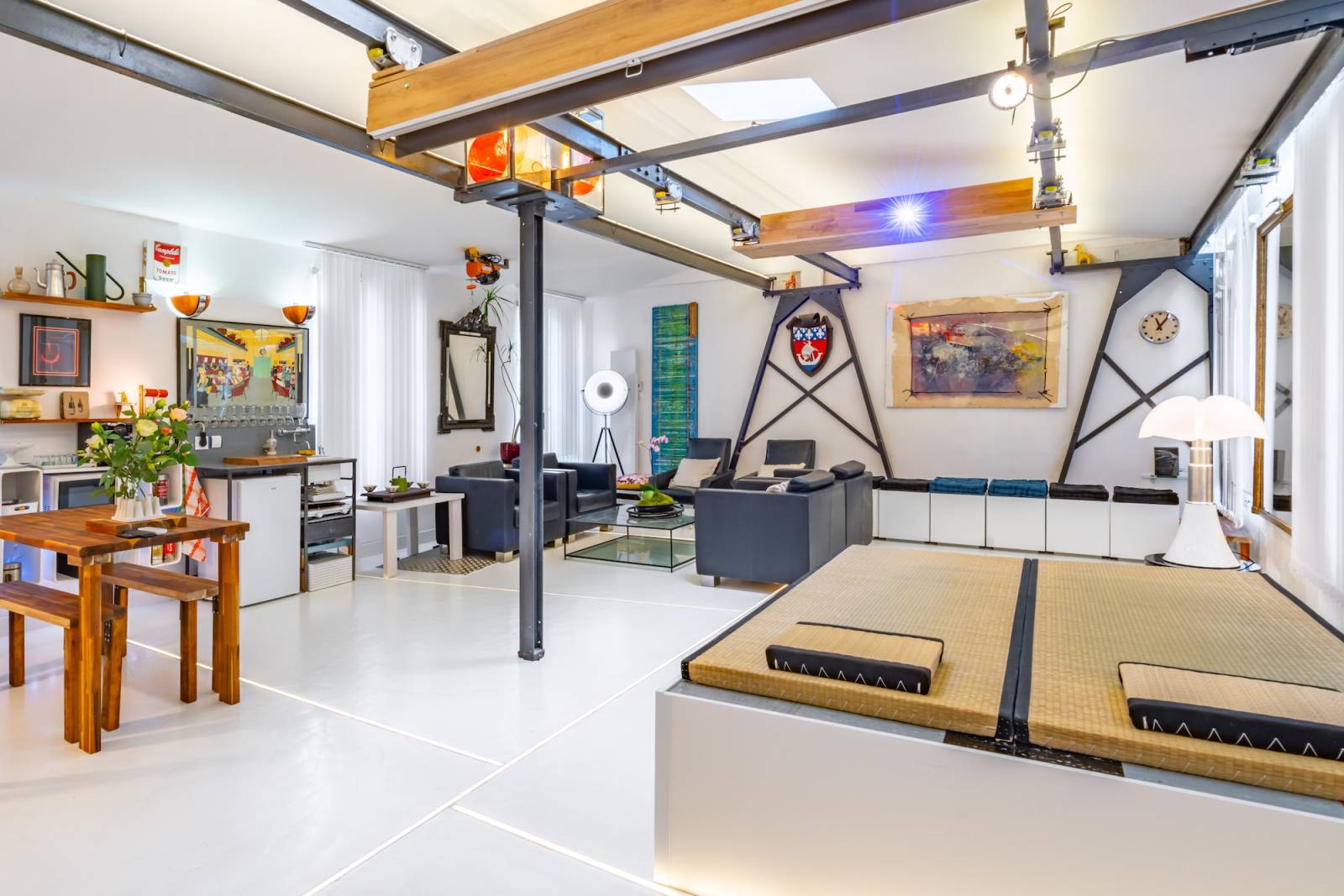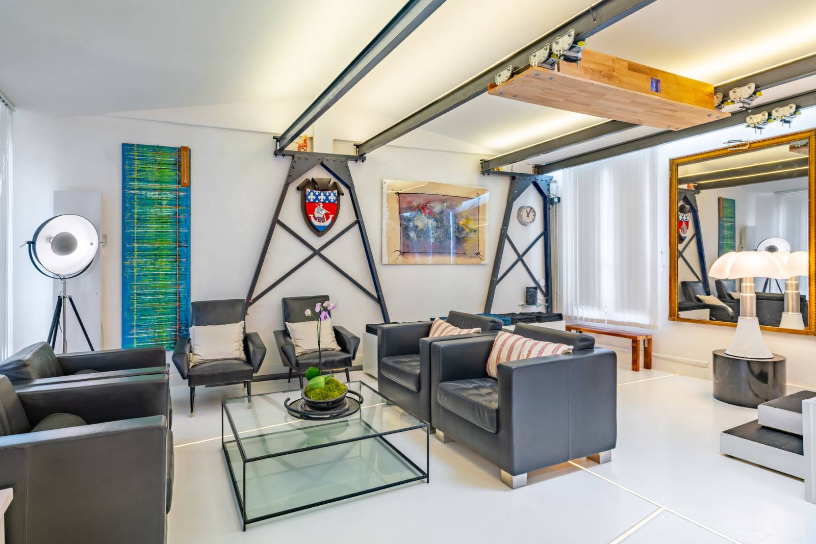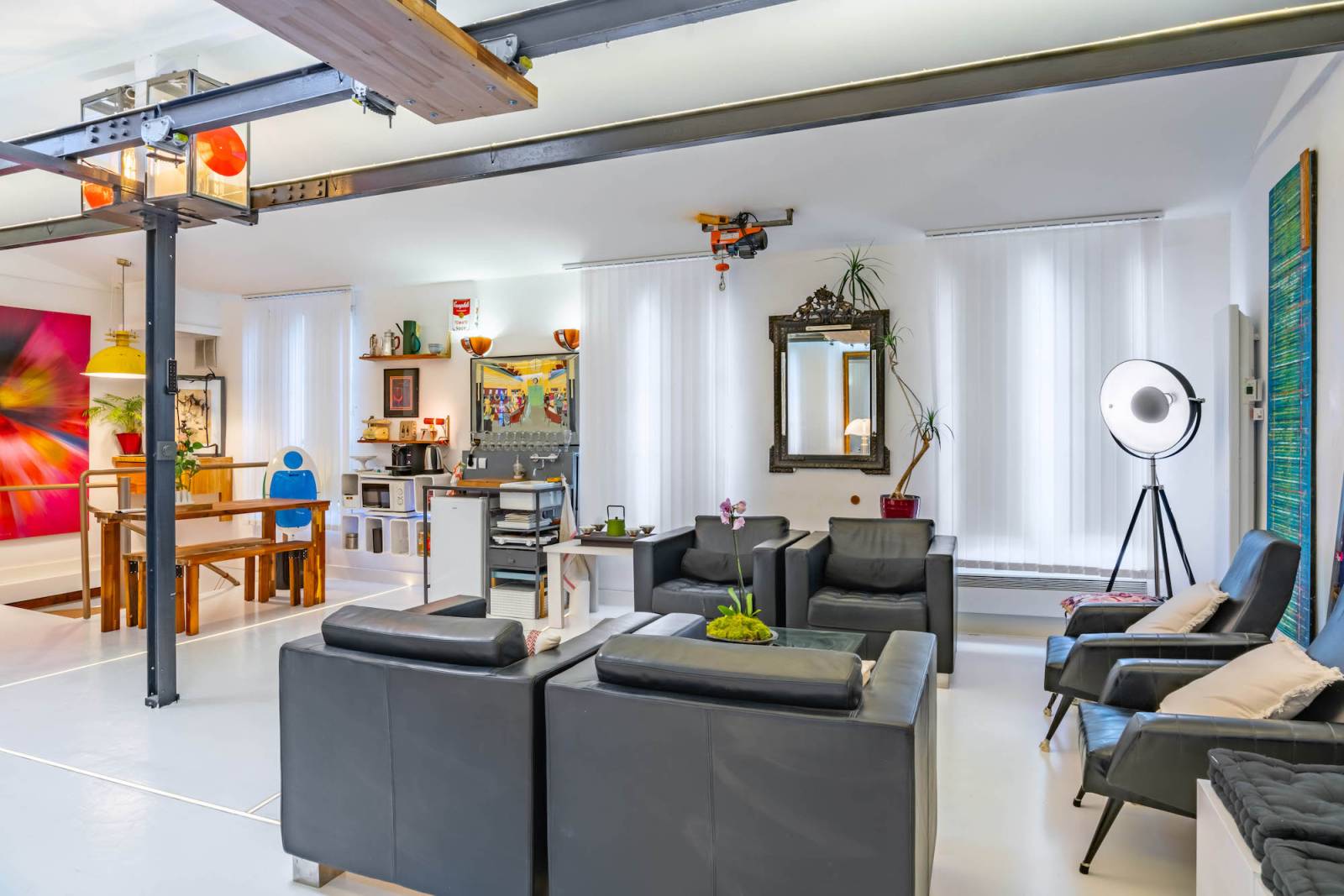 Situé dans le centre de Paris, ce loft présente une décoration inspirée de l'univers industriel, avec ses poutres apparentes, ses grandes fenêtres et ses matériaux bruts. Mais ce qui fait toute la différence, c'est sa décoration colorée et pop qui apporte une ambiance chaleureuse et dynamique à l'espace.
