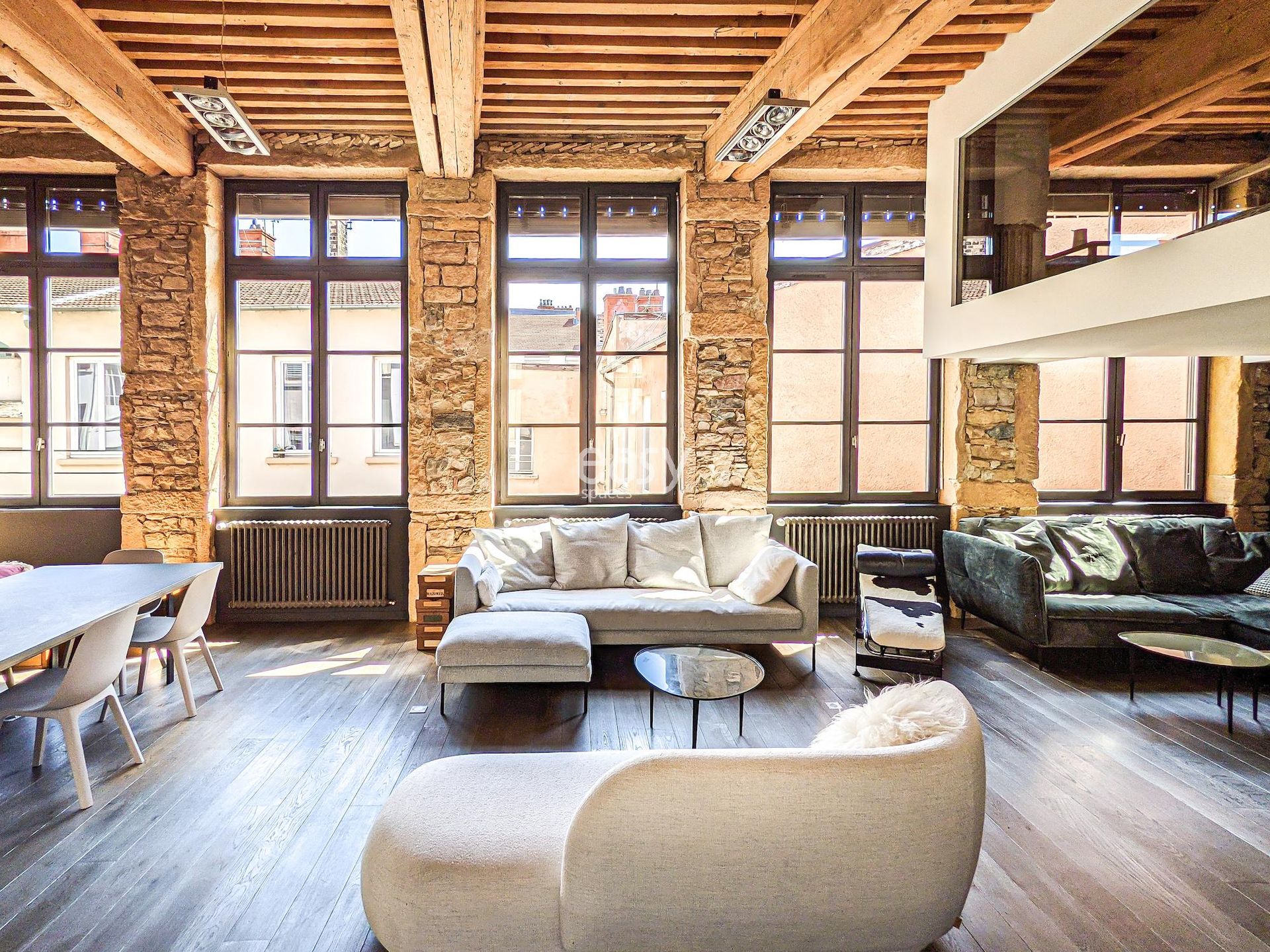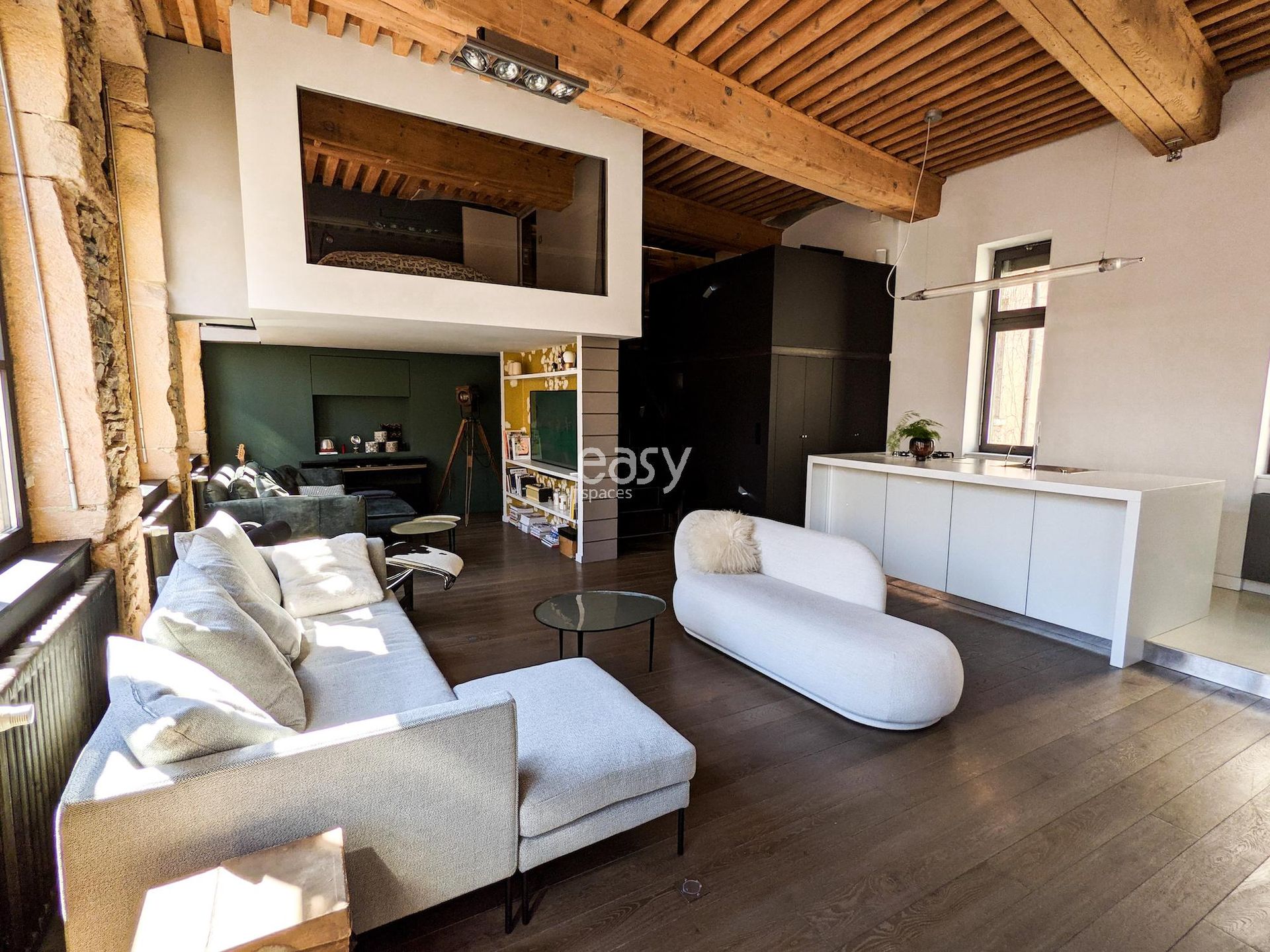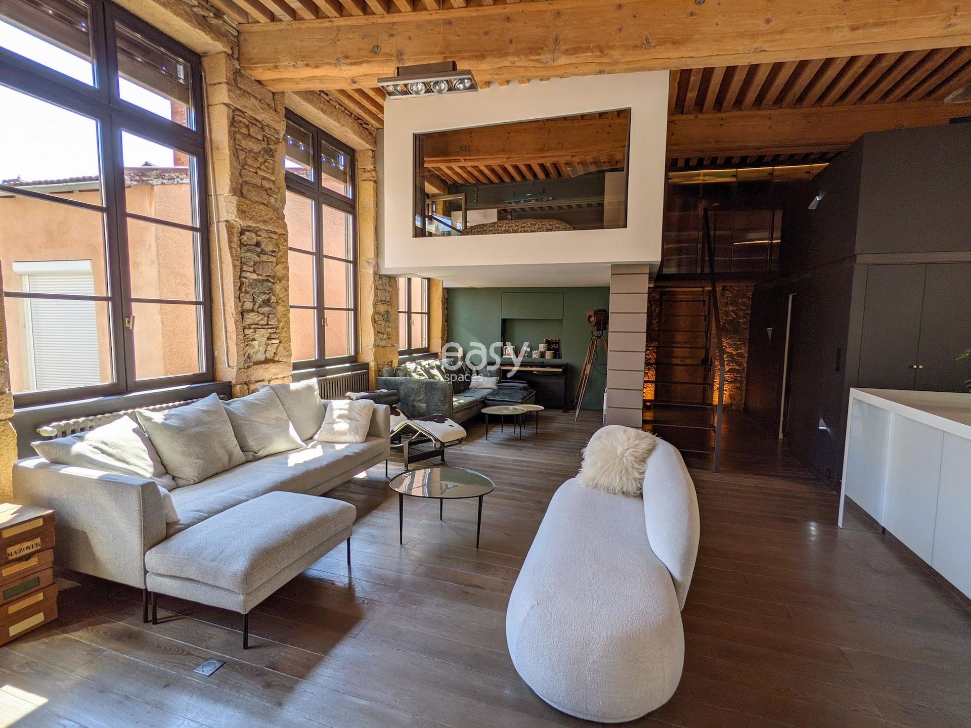 Ce superbe loft atypique dans le centre de Lyon, aux murs en pierres apparentes et aux poutres anciennes, offre un séjour lumineux avec cuisine ouverte de 70m2 et une décoration épurée, créant un cadre idéal pour shootings, tournages ou événements professionnels.