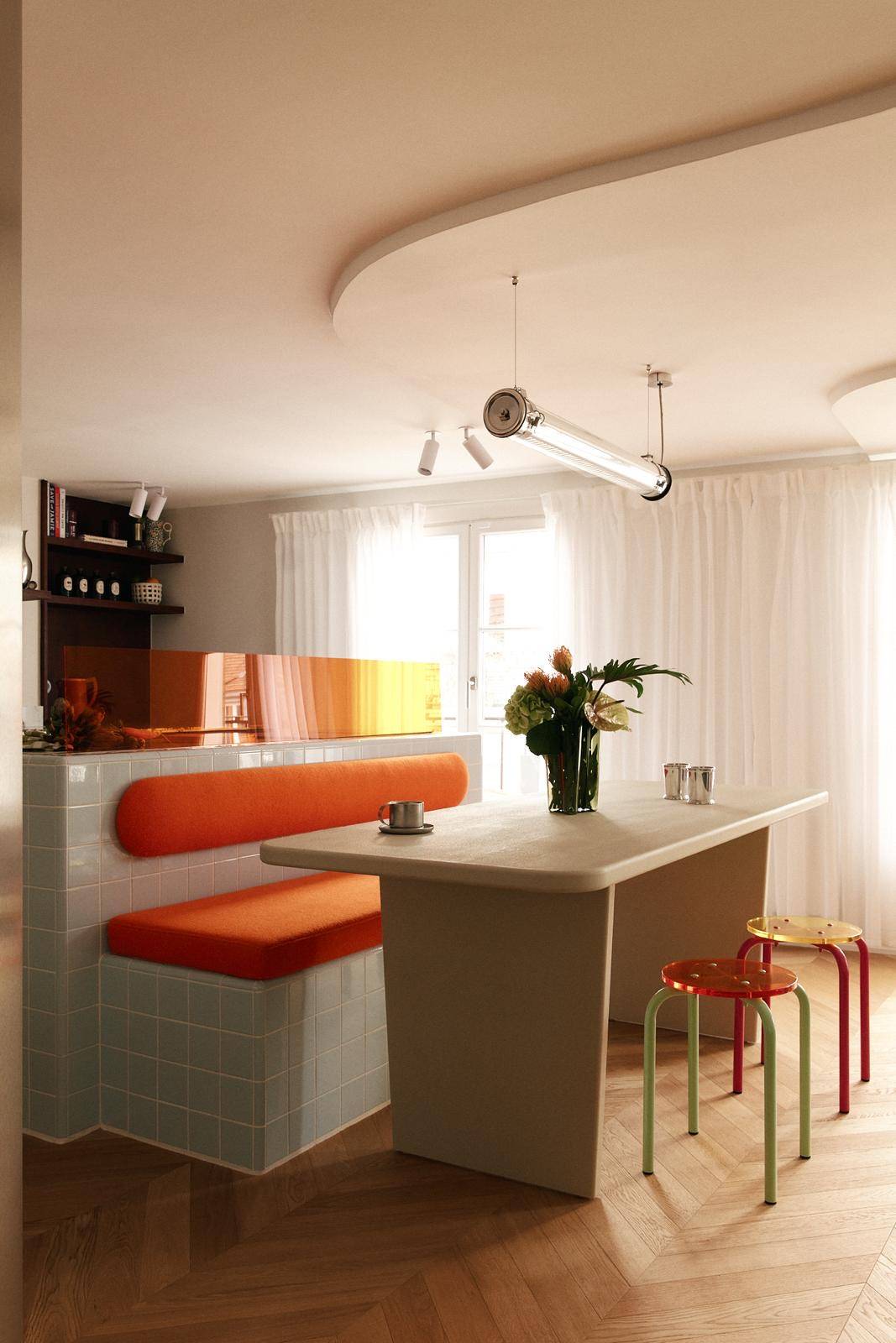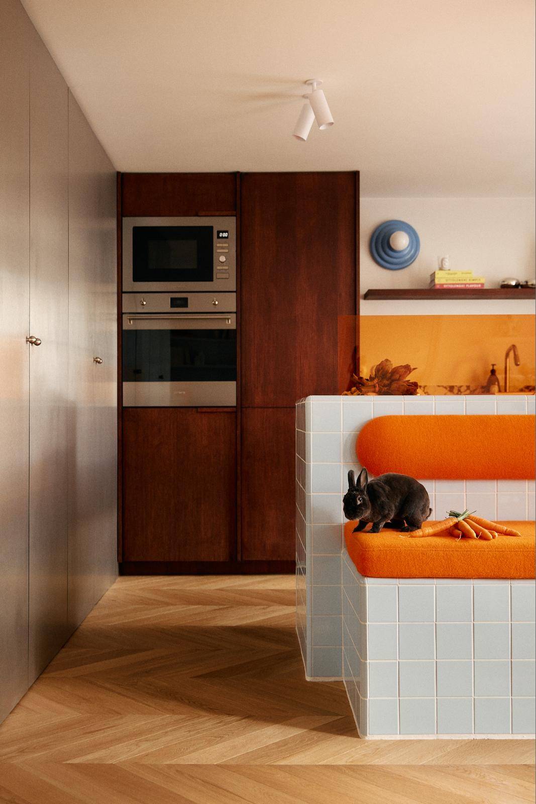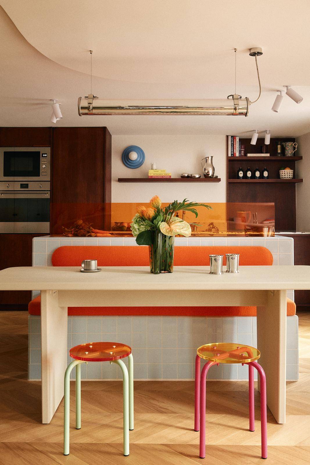 TRENDY revendique une esthétique vintage marquée, directement inspirée des années 70. Les choix décoratifs sont assumés : mobilier bas aux lignes arrondies, assises vert profond et orange, bois foncé omniprésent, et jeux de matières contrastés. La cuisine ouverte, traitée comme un élément graphique à part entière, semble devenir un décor central, avec ses façades colorées et son plan structurant. L’ensemble crée une atmosphère cohérente, identifiable, et immédiatement atypique à l’image.