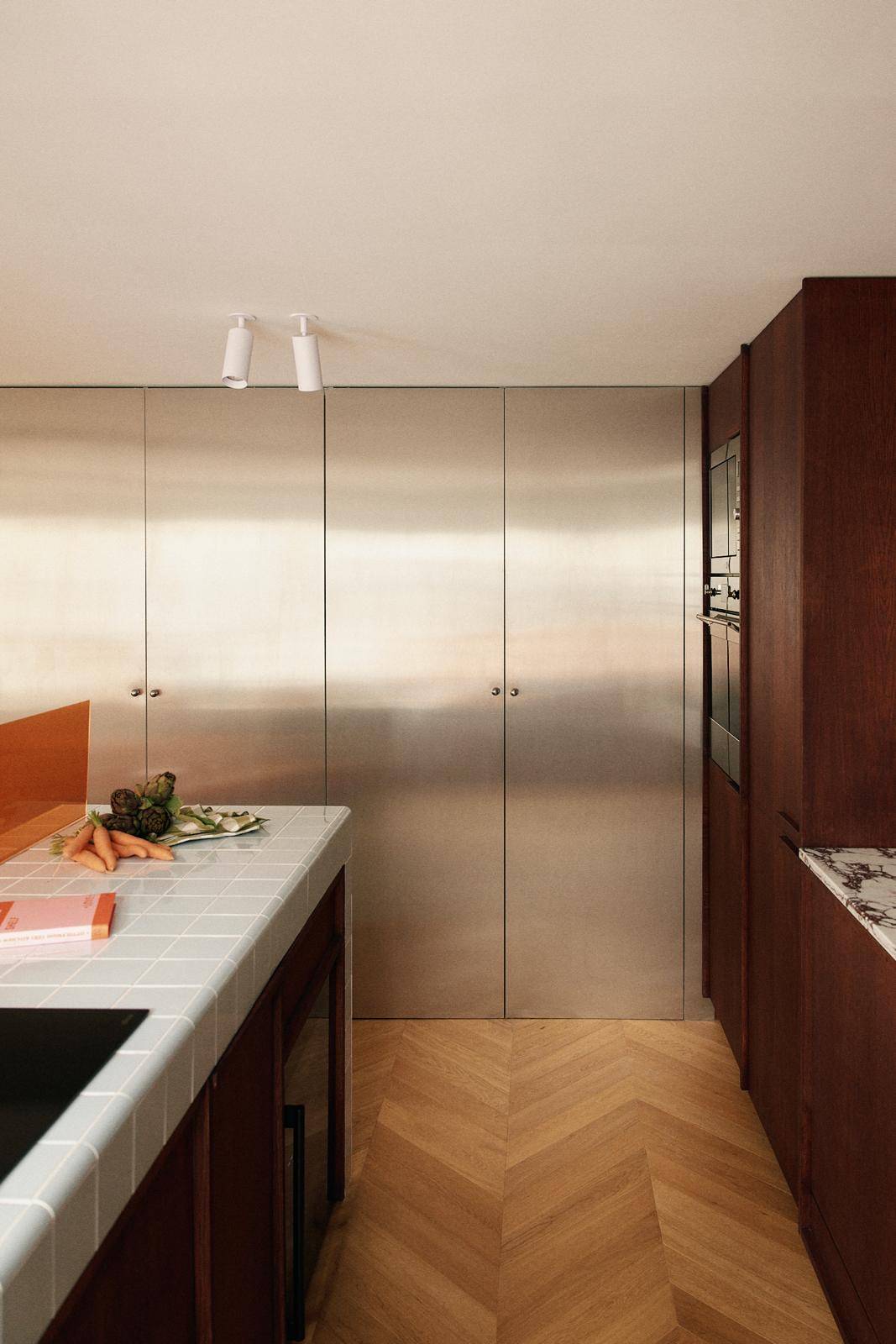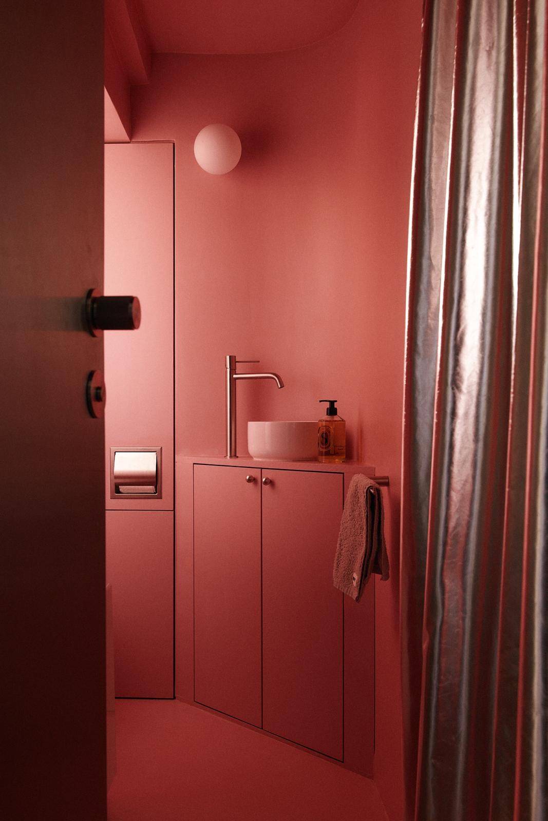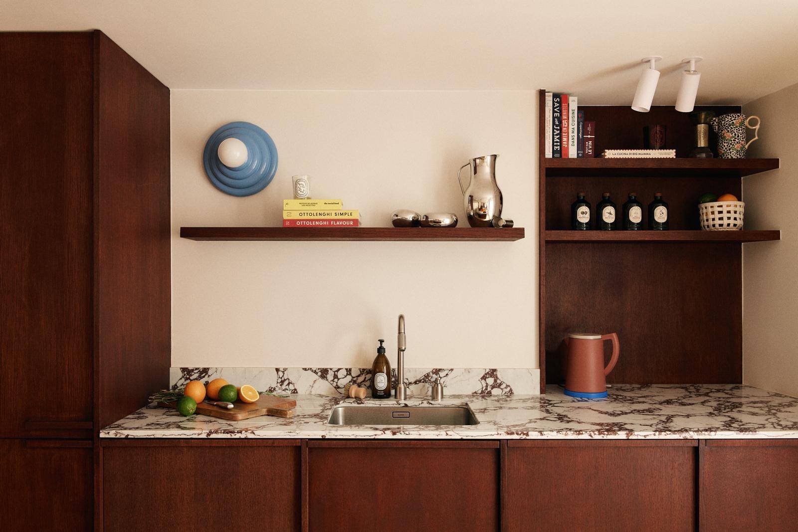 TRENDY revendique une esthétique vintage marquée, directement inspirée des années 70. Les choix décoratifs sont assumés : mobilier bas aux lignes arrondies, assises vert profond et orange, bois foncé omniprésent, et jeux de matières contrastés. La cuisine ouverte, traitée comme un élément graphique à part entière, semble devenir un décor central, avec ses façades colorées et son plan structurant. L’ensemble crée une atmosphère cohérente, identifiable, et immédiatement atypique à l’image.
