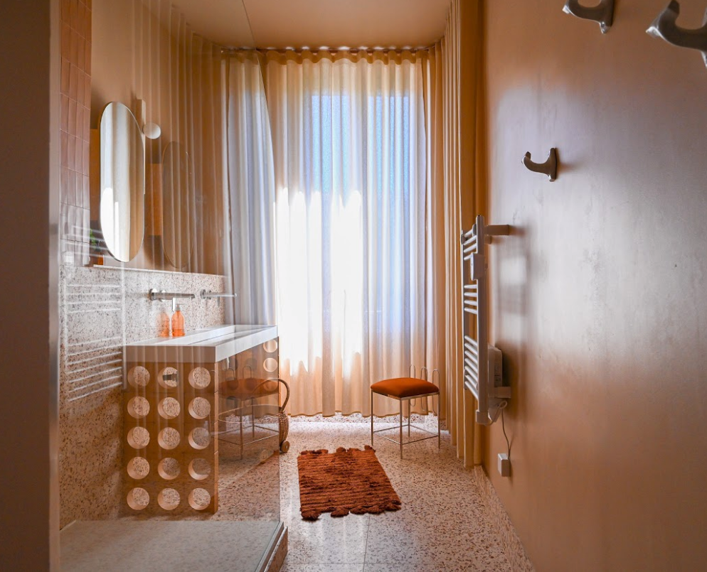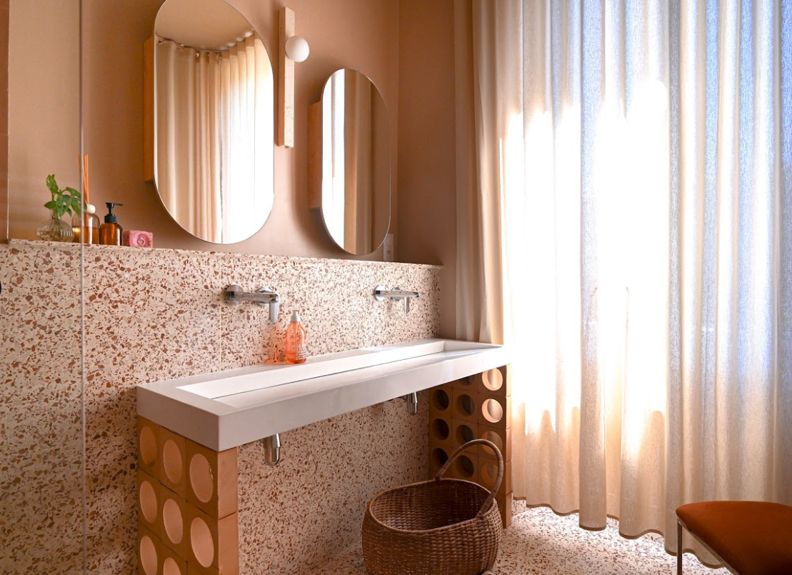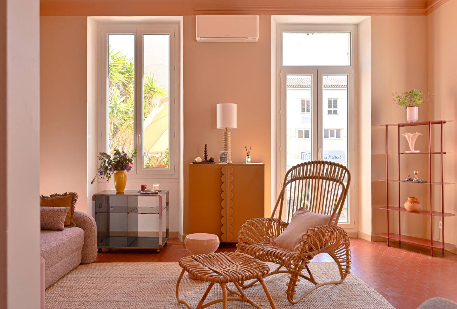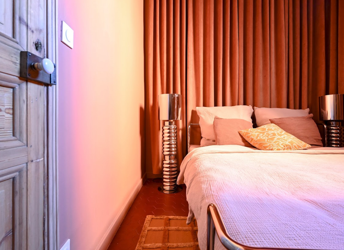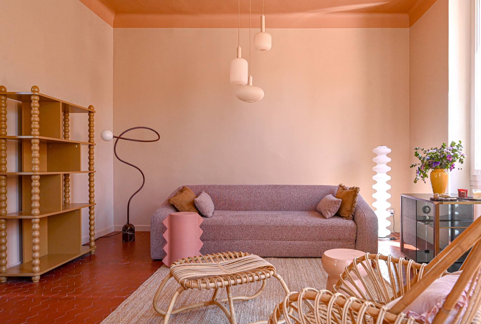 Les tons rosés, les matières chaleureuses et le sol en tomettes apportent du caractère et une identité visuelle immédiatement exploitable à l’image.
