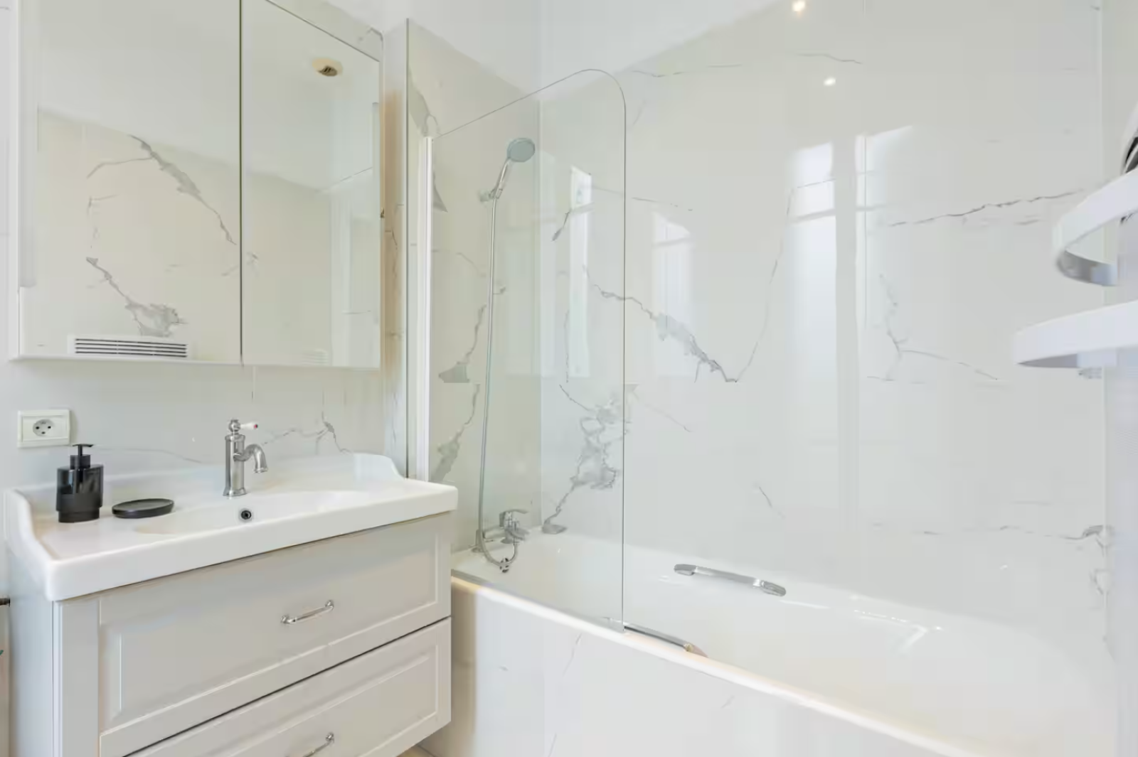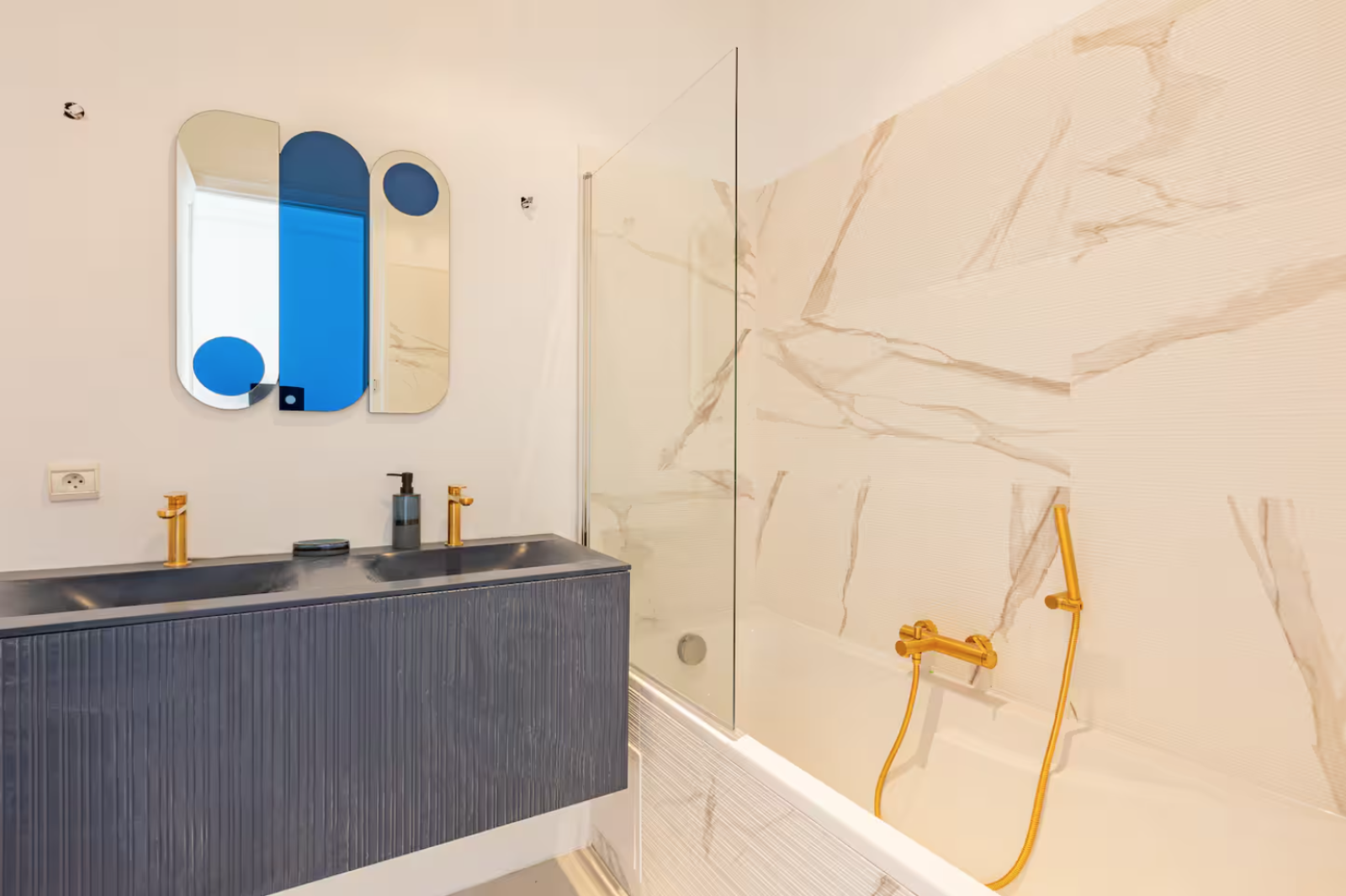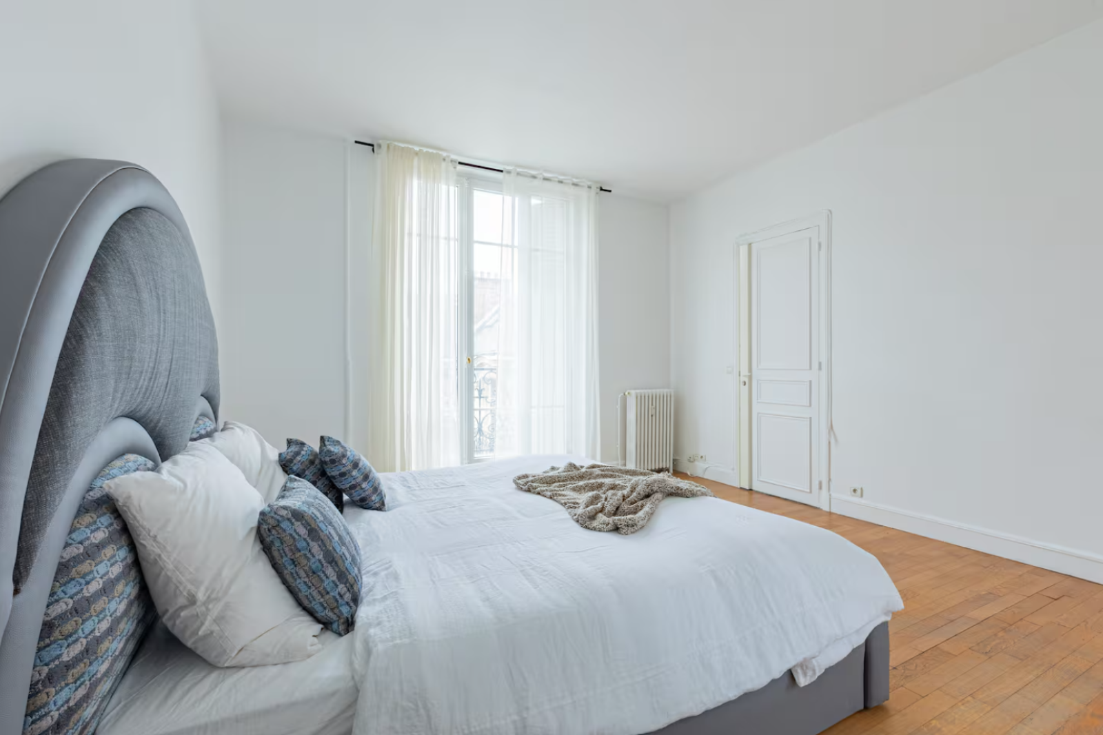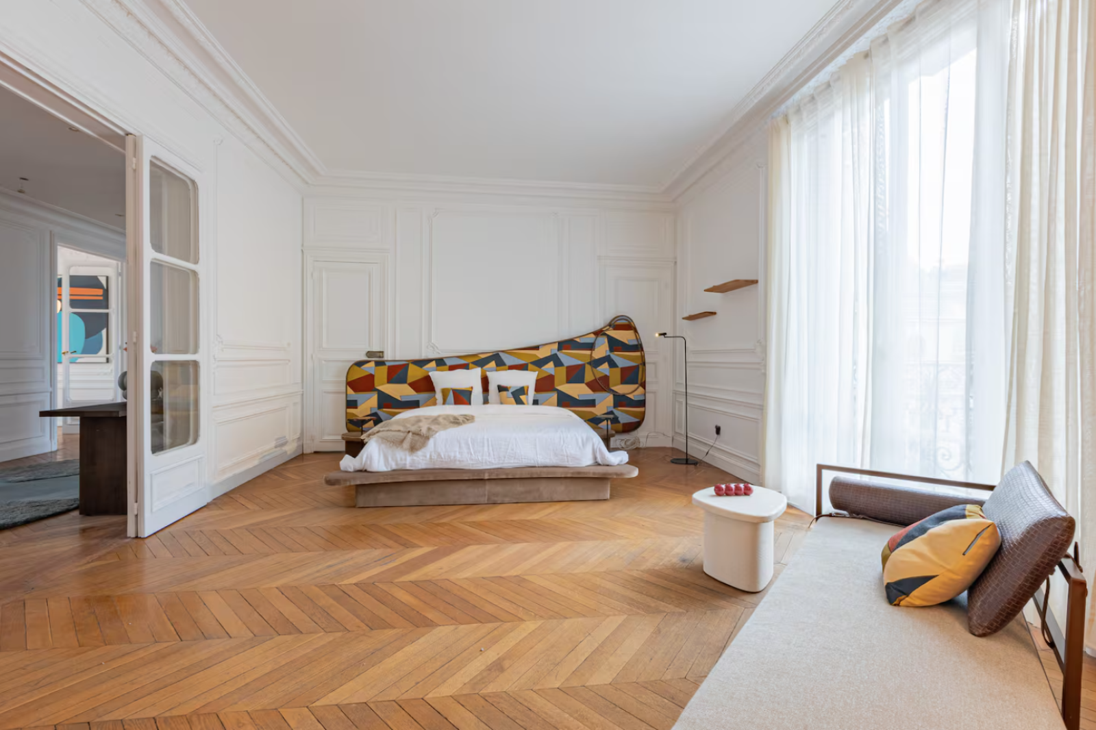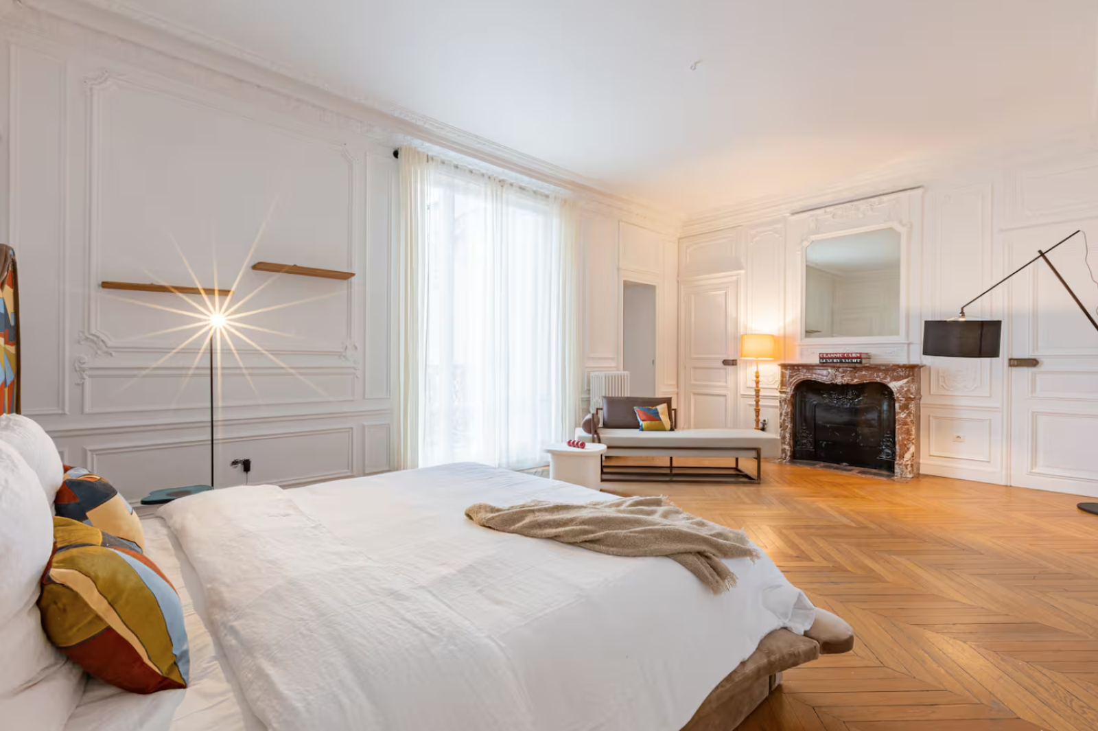 Les parquets en chevrons, les moulures et les cheminées en marbre rappellent l’esprit d’un immeuble haussmannien typique. Pourtant, l’atmosphère reste sobre et actuelle : mobilier élégant et couleurs subtiles.