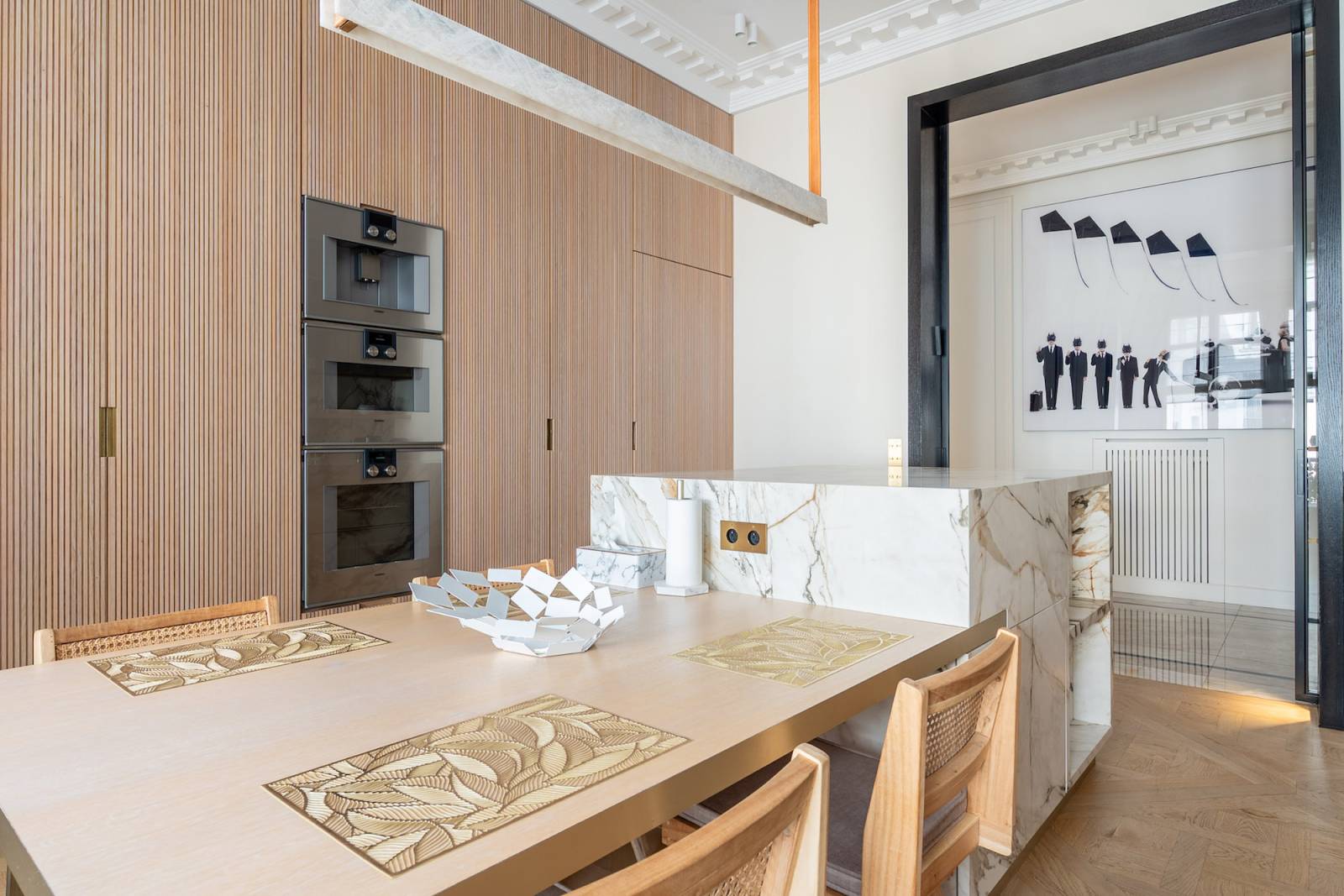 La cuisine de 24 m², mêlant marbre lumineux et bois noble, est un véritable atout pour :
