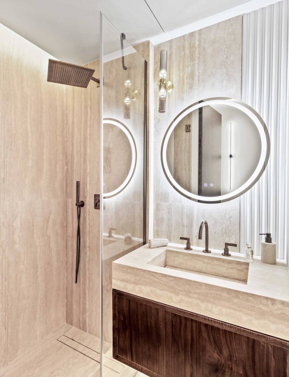 L’appartement dispose de trois chambres de 20 m², chacune pensée pour le confort et la photogénie. Les salles de bain en travertin avec douche hammam ajoutent une touche de luxe et de bien-être. Le parquet massif, la hauteur sous plafond de 2,70 m et les matériaux sur mesure créent un environnement raffiné et très photogénique.